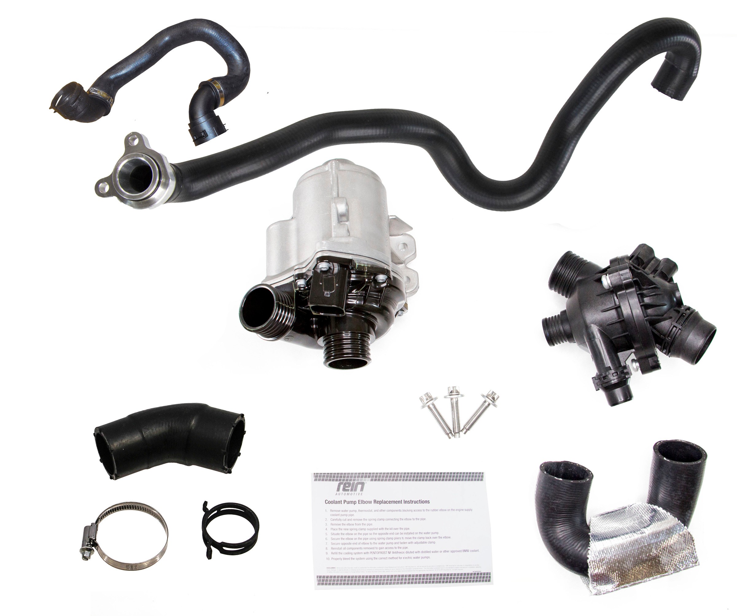 - Rein OE Quality Electric Water Pump Replacement Kit, includes an OE Water Pump & Bolts, Thermostat Assy., Aluminum Flange Head to Thermostat Hose, WP to Head Pipe Elbow, WP to Thermostat Hose, Lower Radiator Hose