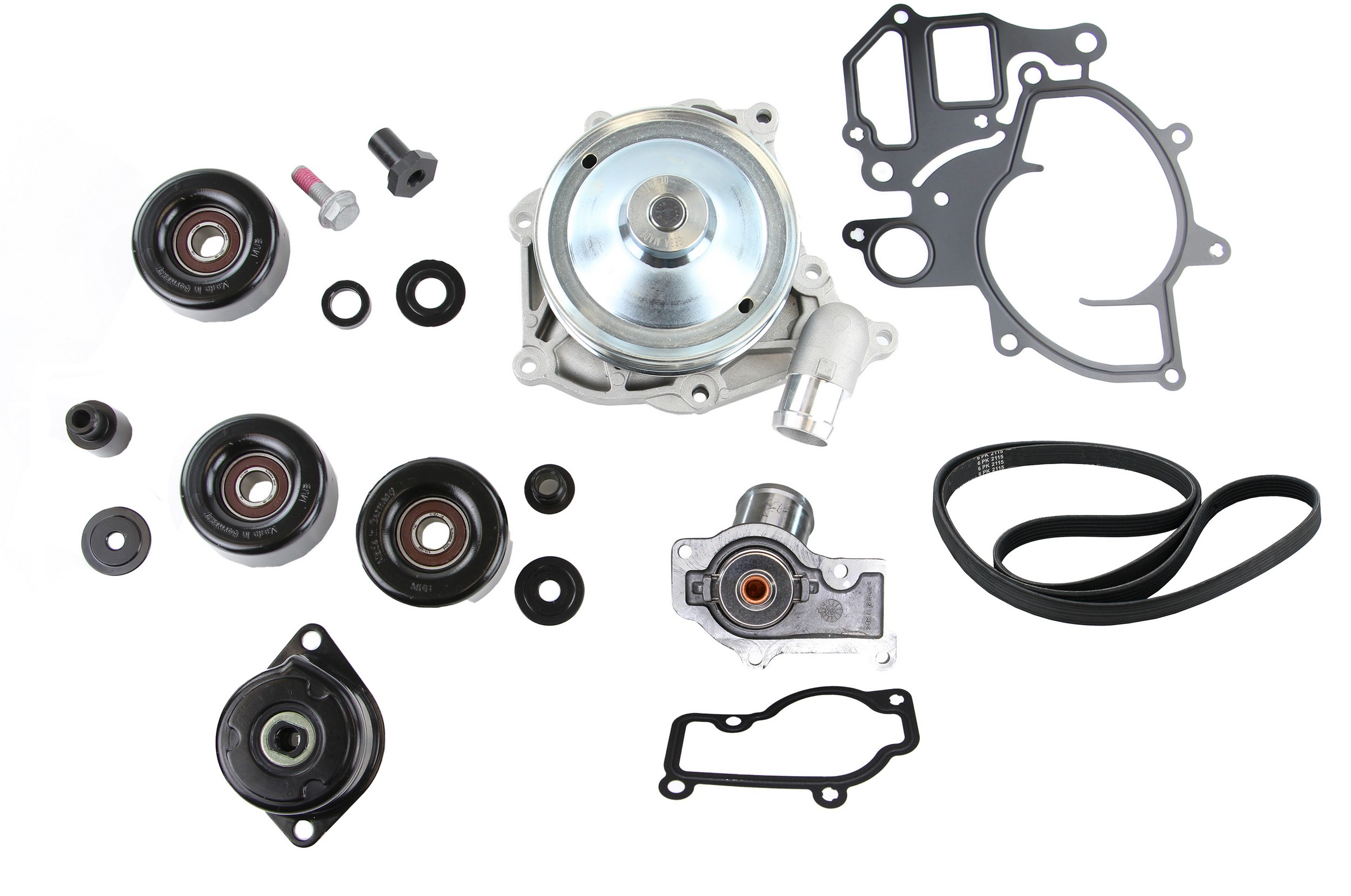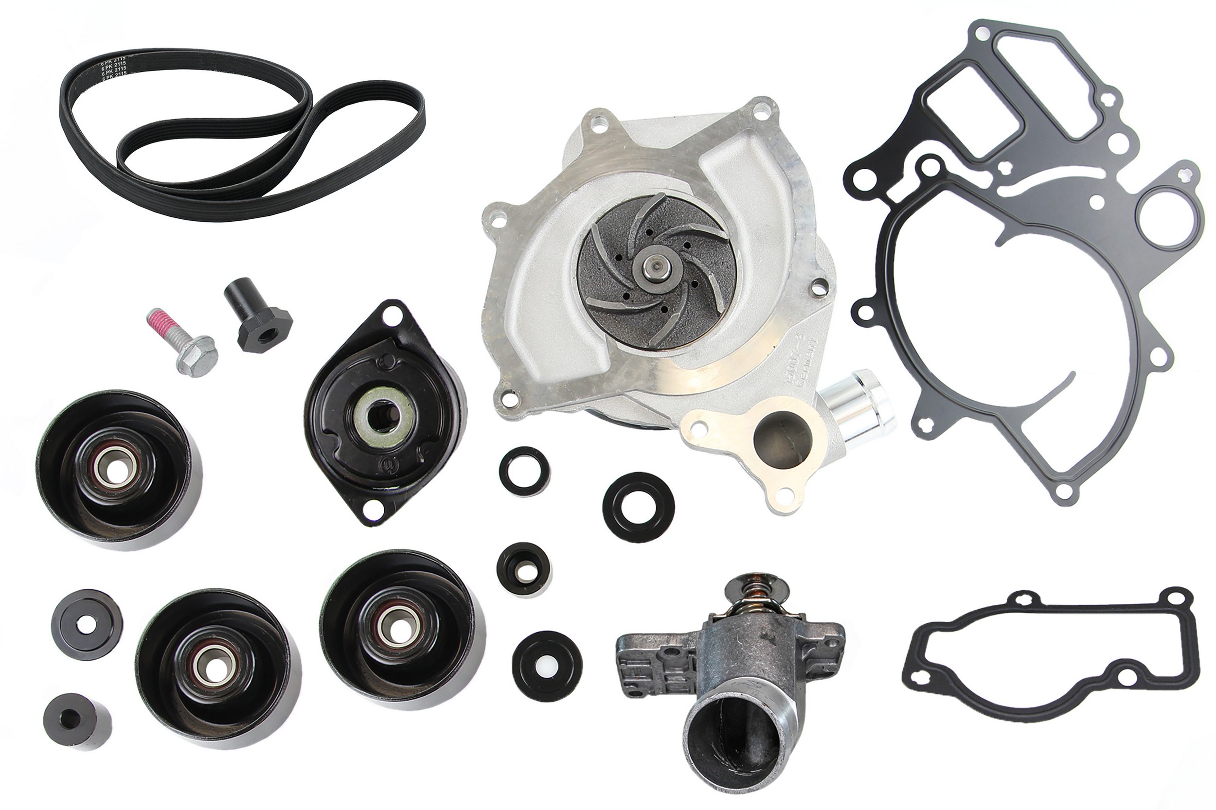 - Rein OE Quality Water Pump Replacement Kit with upgraded metal impeller comes complete with steel gasket, thermostat assembly, multi-rib drive belt, all OE accessory drive belt tensioners and idlers as well as all needed hardware.