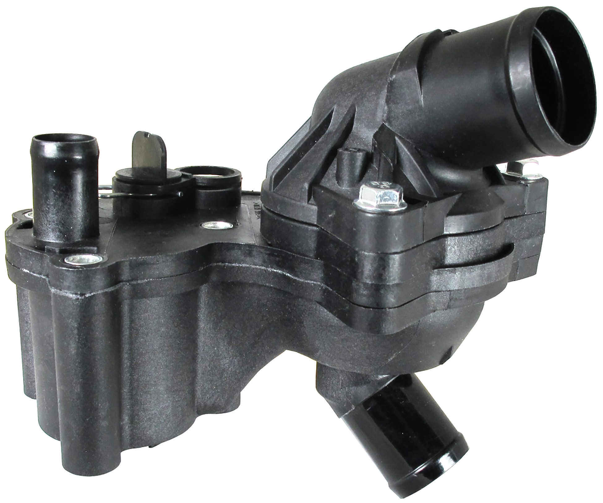 - Water outlet thermostat housing made of durable material for a long lasting life. Thermostat is integrated into housing assembly, simplifying installation.