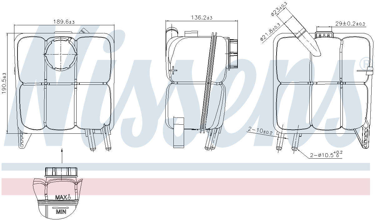 - Nissens engine coolant reservoir (expansion tank) is a complete aftermarket solution that includes high-quality pressure caps and pre-mounted sensors when needed. Nissens engine coolant reservoirs are manufactured using OE matching plastics, high durable welding, and reinforced fittings for a fast and secure part connection. Nissens thoroughly tests tanks and the inner components to ensure excellent fit and reliable performance.