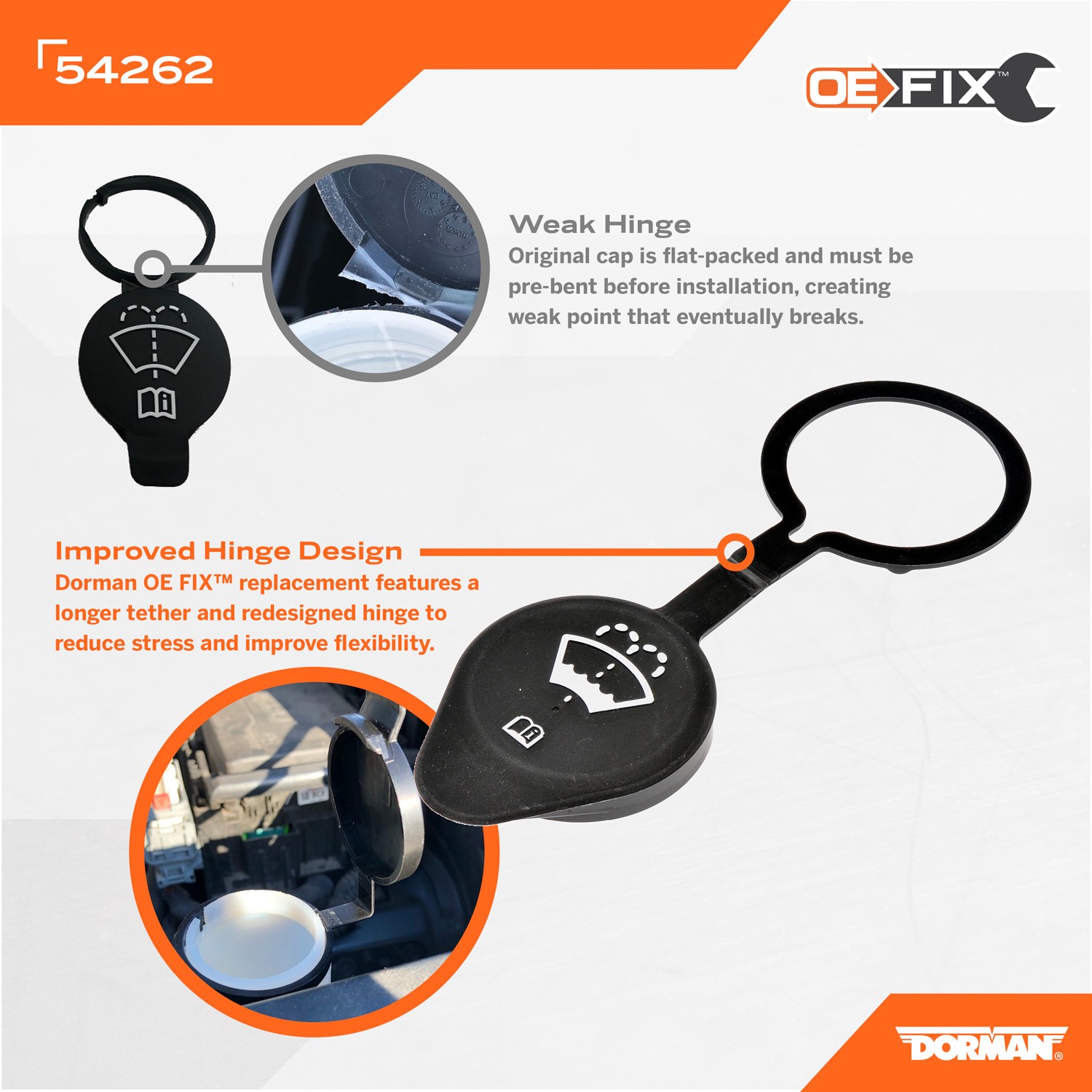 - Improved design - this washer fluid reservoir cap has been redesigned to help prevent the failure-prone plastic tether from breaking in the future