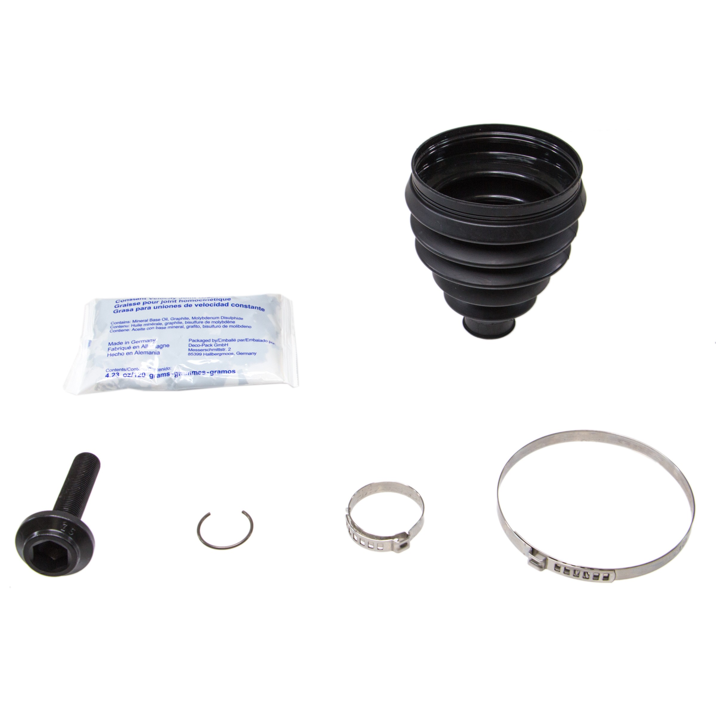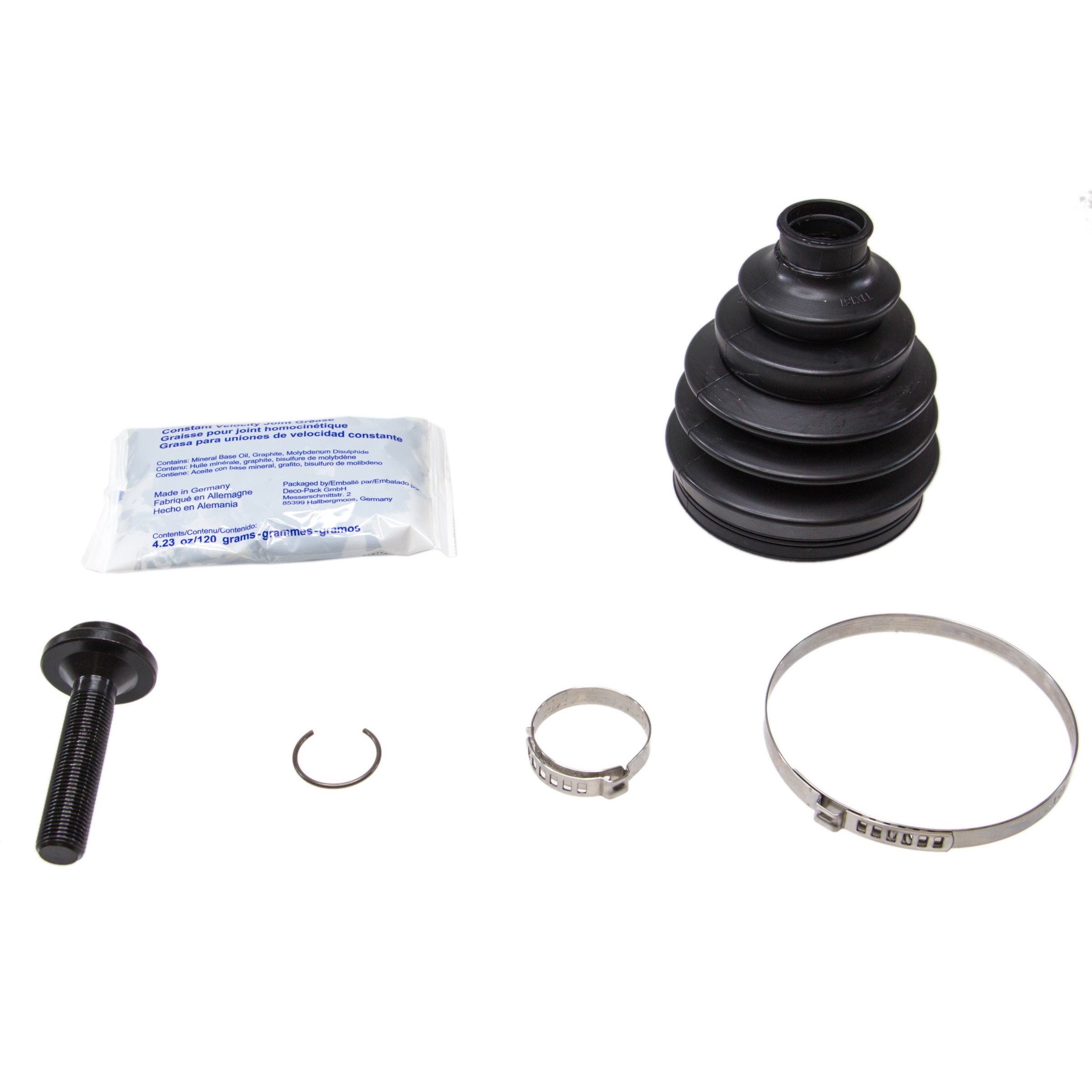 | Package Contents | One cv boot, two clamps, one bolt, one circlip, one grease |