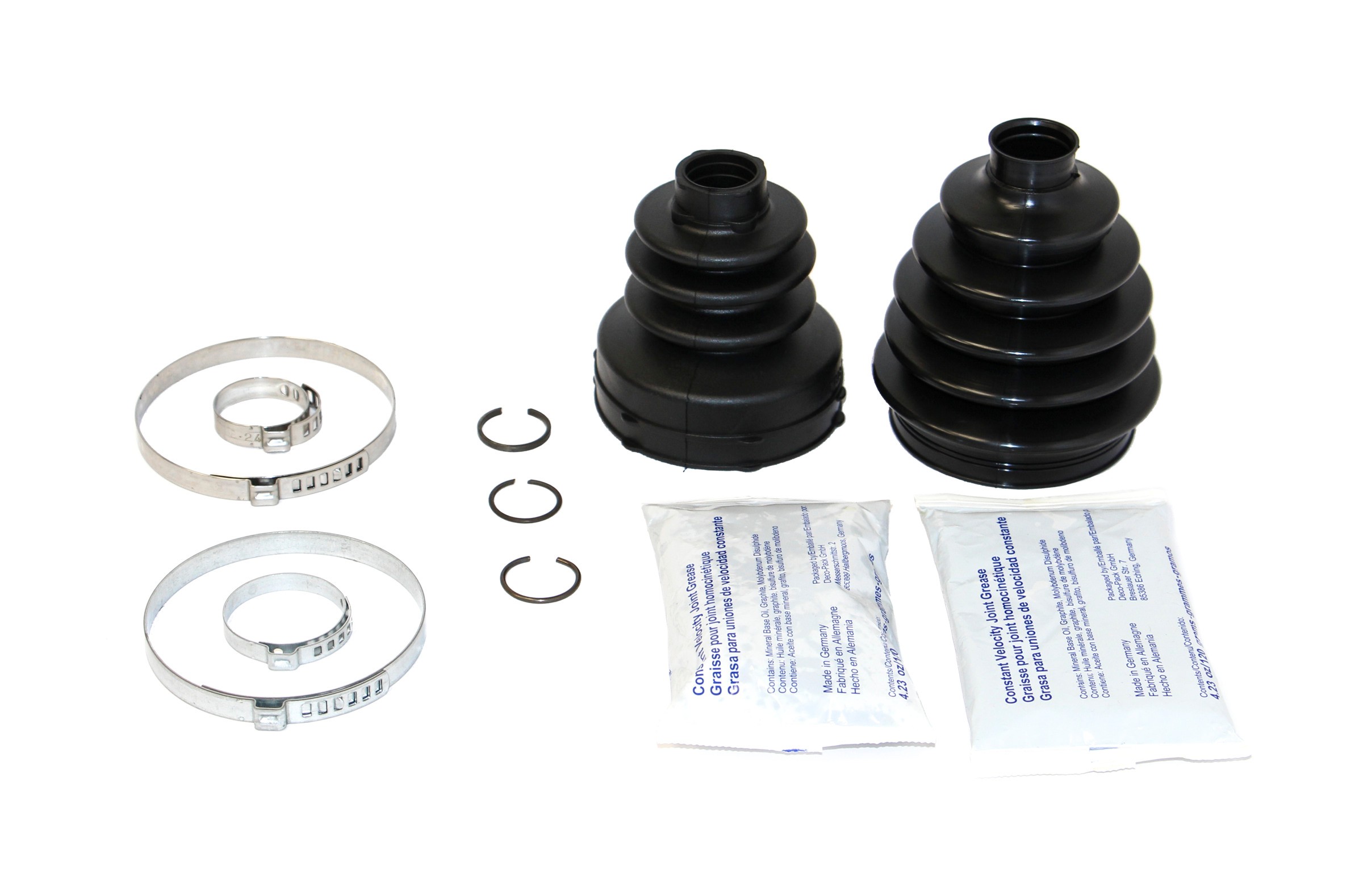 | Package Contents | Two cv boots, four clamps, three circlips, one damper, two grease packs |