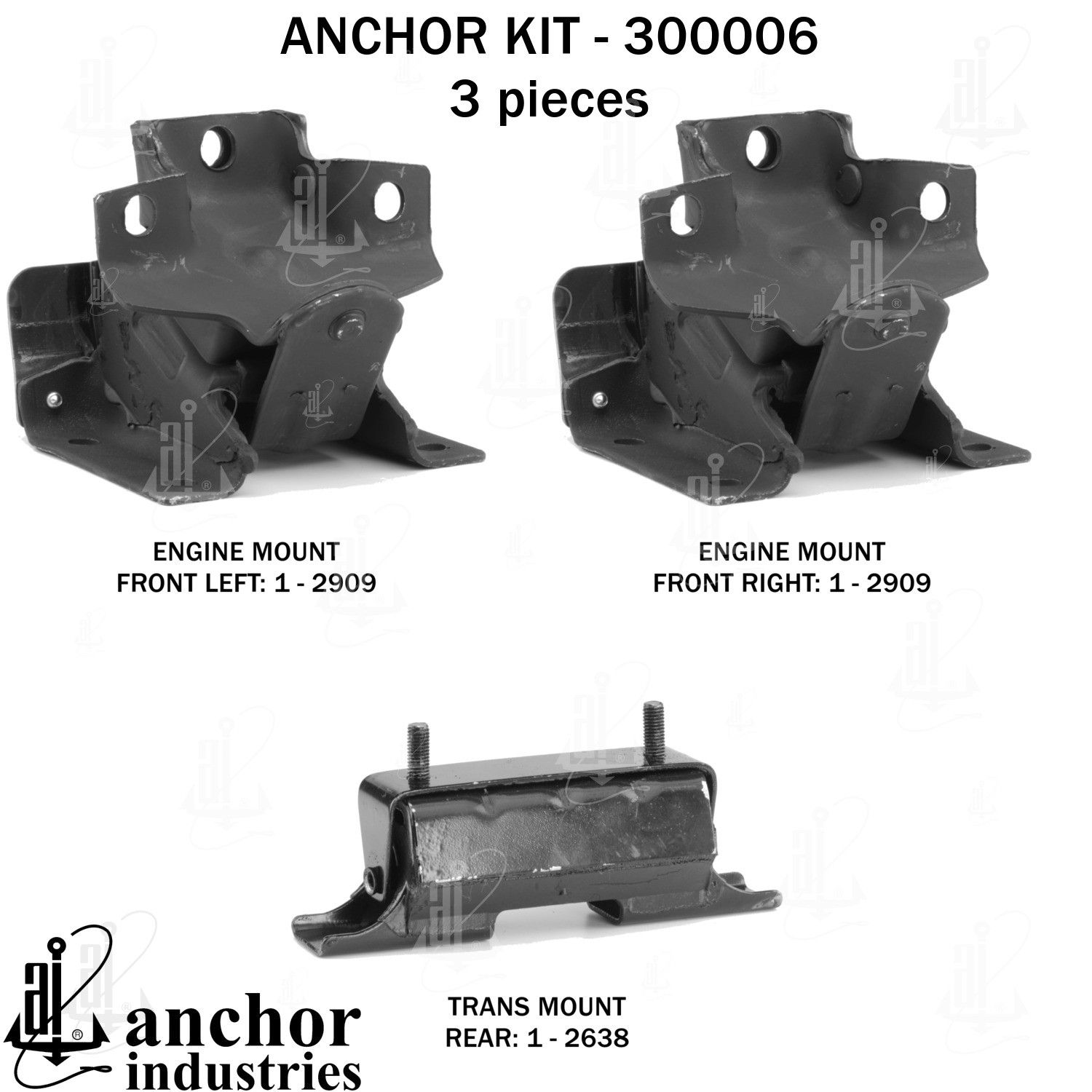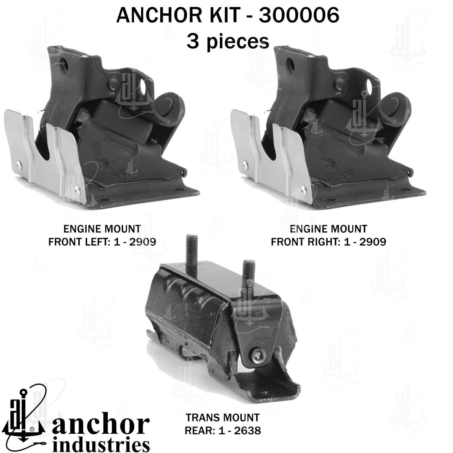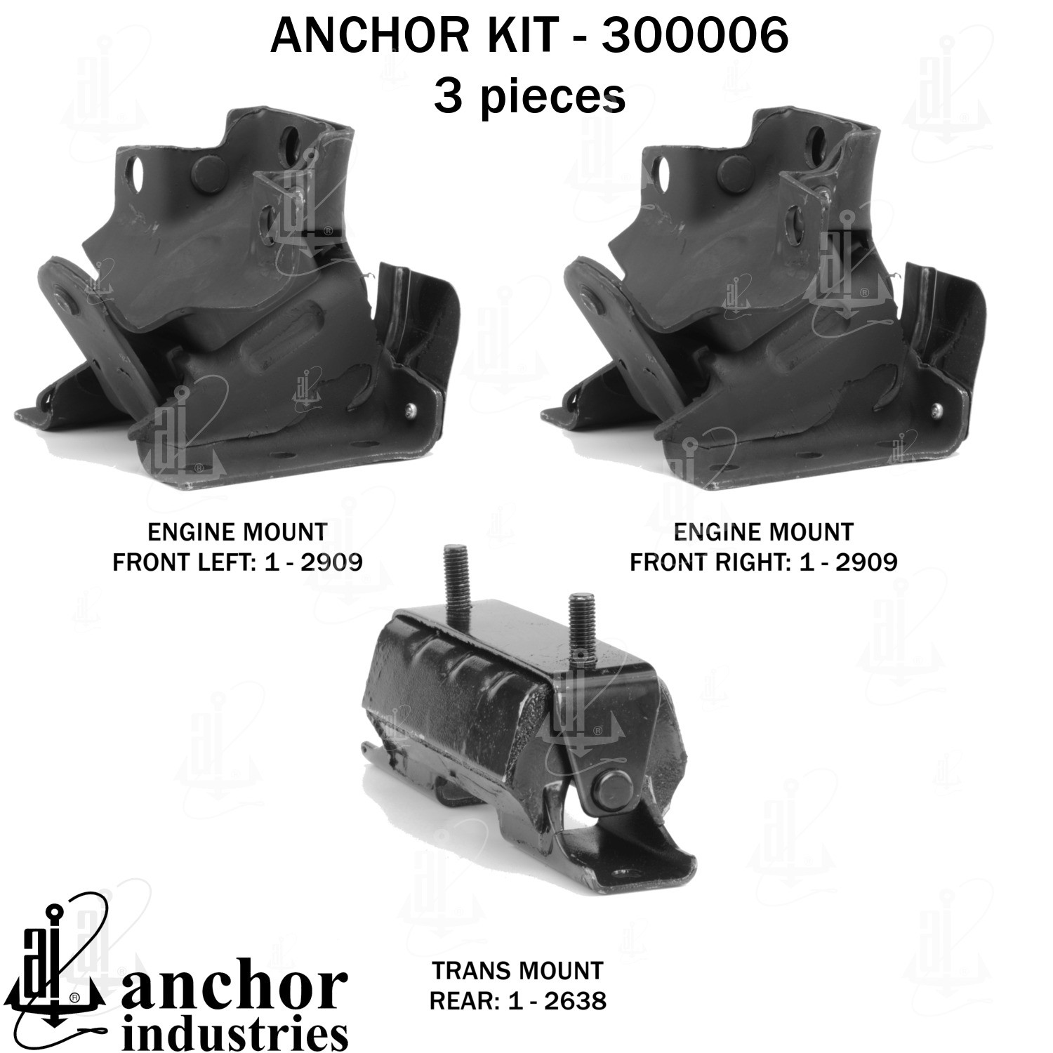 - Anchor 300006; ENGINE MNT KIT ; Each part of this kit is specifically engineered and manufactured to meet or exceed OE standards to ensure perfect fit and function. Natural and SBR rubber provide maximum life and performance. Steel fasteners are heat treated grade 5 bolts. A special bonding agent is used to ensure a rubber to metal bond. Rubber material is mixed to specific Durometer, hardness. 12 Month Warranty.