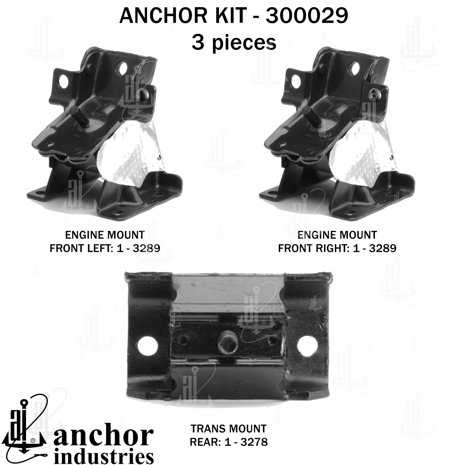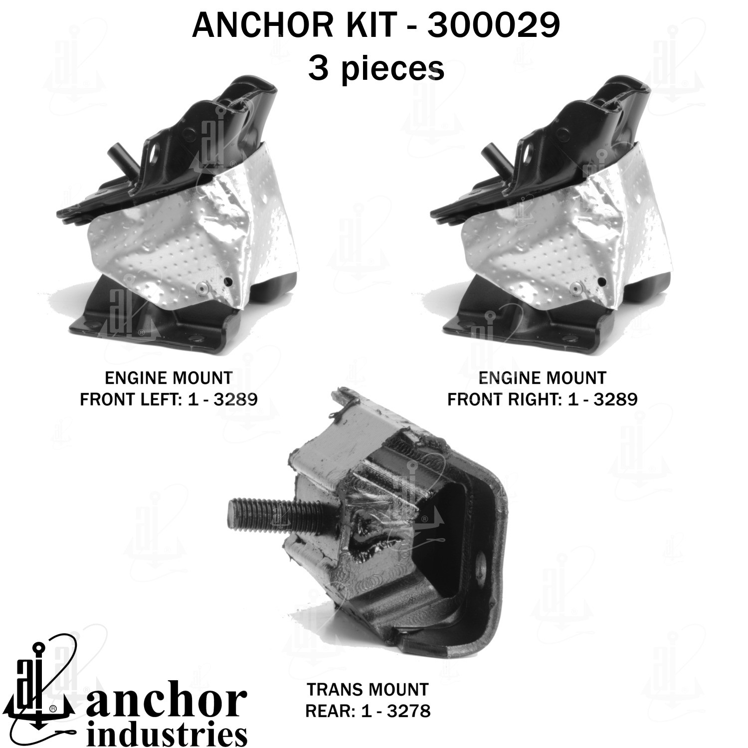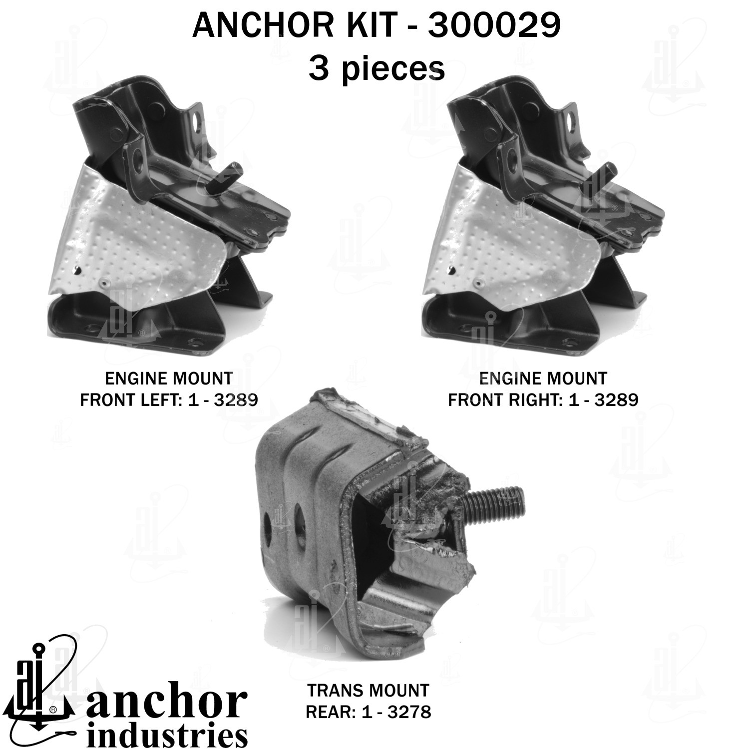 - Anchor 300029; ENGINE MNT KIT ; Each part of this kit is specifically engineered and manufactured to meet or exceed OE standards to ensure perfect fit and function. Natural and SBR rubber provide maximum life and performance. Steel fasteners are heat treated grade 5 bolts. A special bonding agent is used to ensure a rubber to metal bond. Rubber material is mixed to specific Durometer, hardness. 12 Month Warranty.