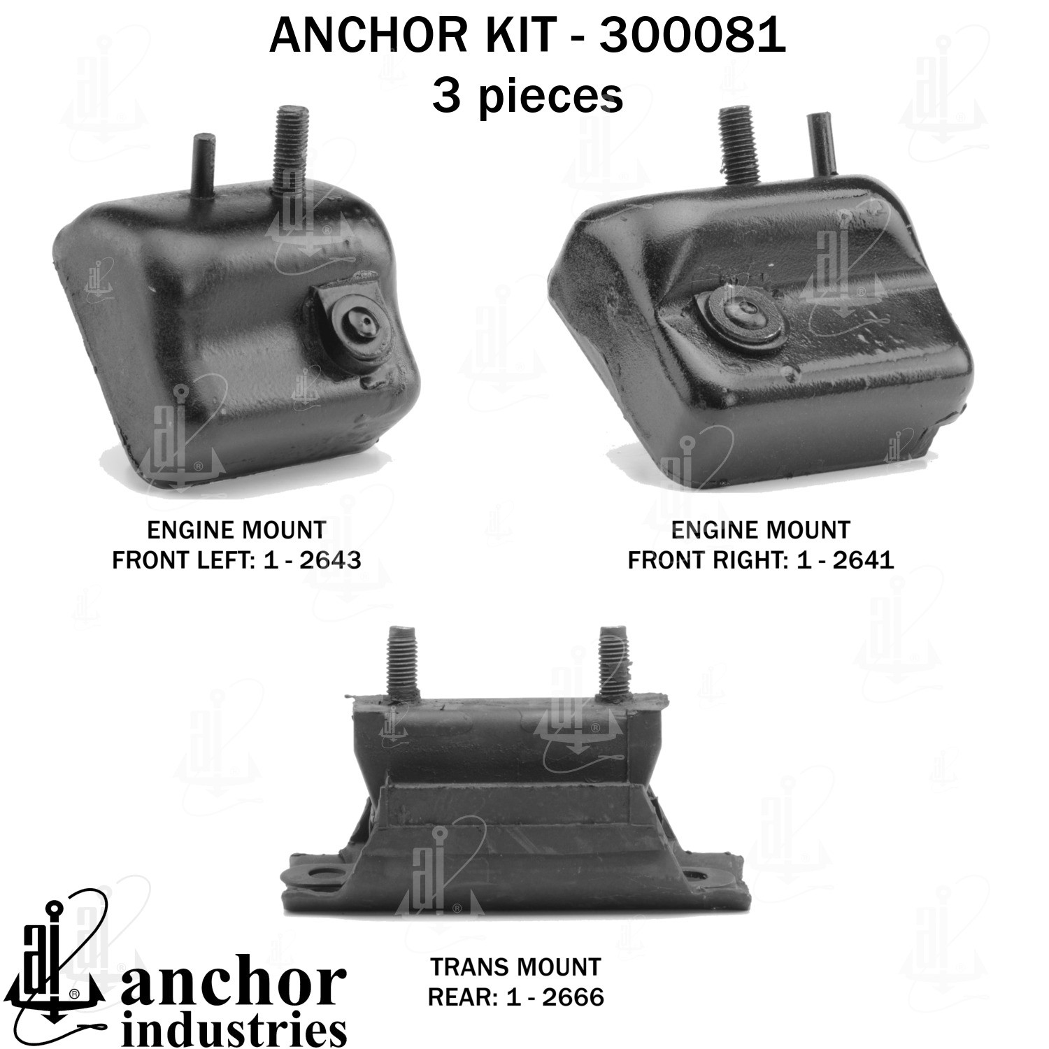 - Anchor 300081; ENGINE MNT KIT ; Each part of this kit is specifically engineered and manufactured to meet or exceed OE standards to ensure perfect fit and function. Natural and SBR rubber provide maximum life and performance. Steel fasteners are heat treated grade 5 bolts. A special bonding agent is used to ensure a rubber to metal bond. Rubber material is mixed to specific Durometer, hardness. 12 Month Warranty.
