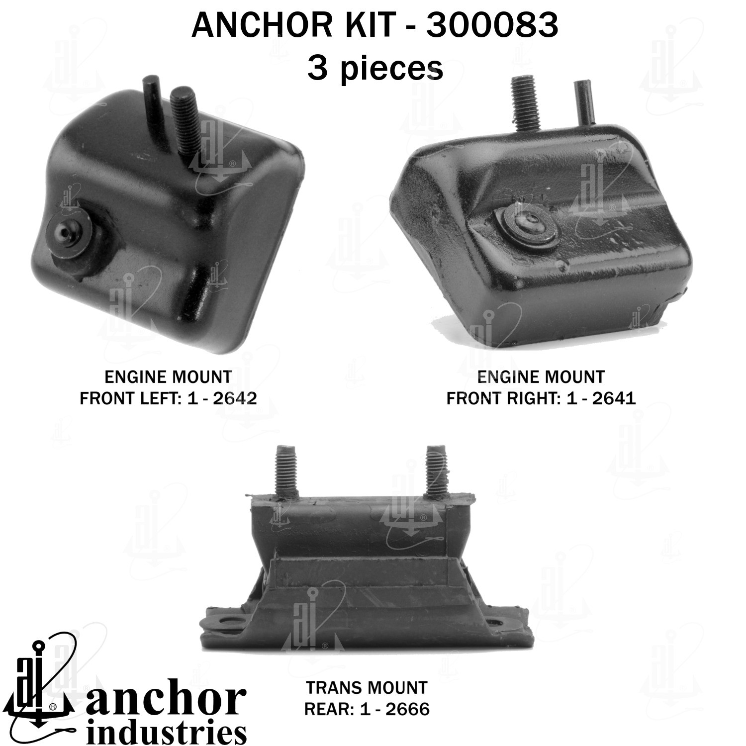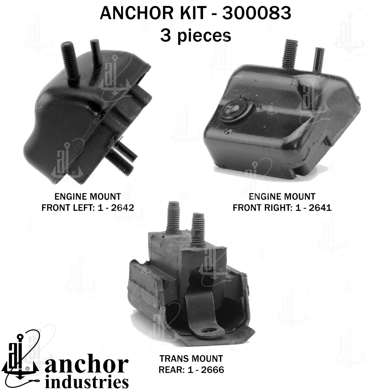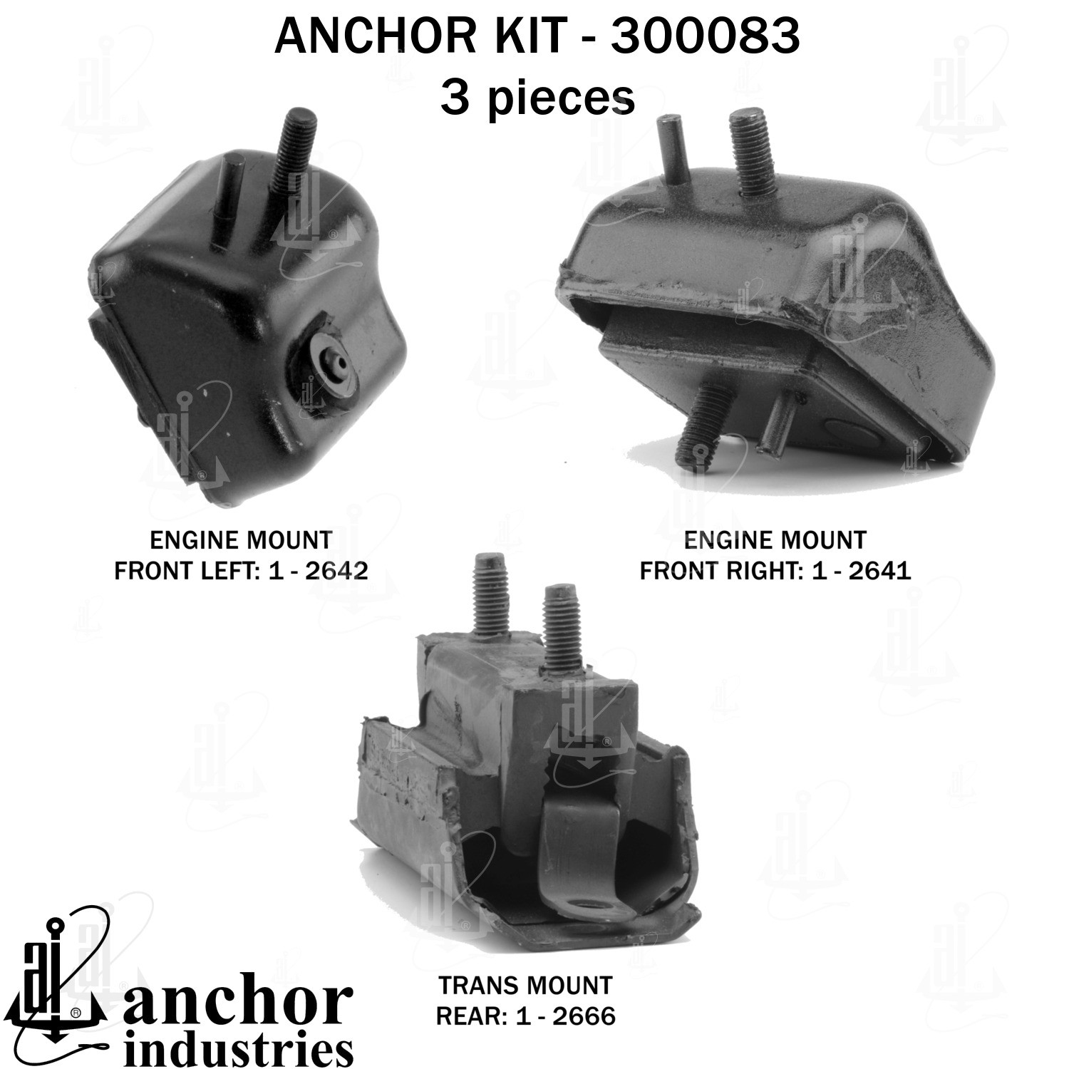 - Anchor 300083; ENGINE MNT KIT ; Each part of this kit is specifically engineered and manufactured to meet or exceed OE standards to ensure perfect fit and function. Natural and SBR rubber provide maximum life and performance. Steel fasteners are heat treated grade 5 bolts. A special bonding agent is used to ensure a rubber to metal bond. Rubber material is mixed to specific Durometer, hardness. 12 Month Warranty.