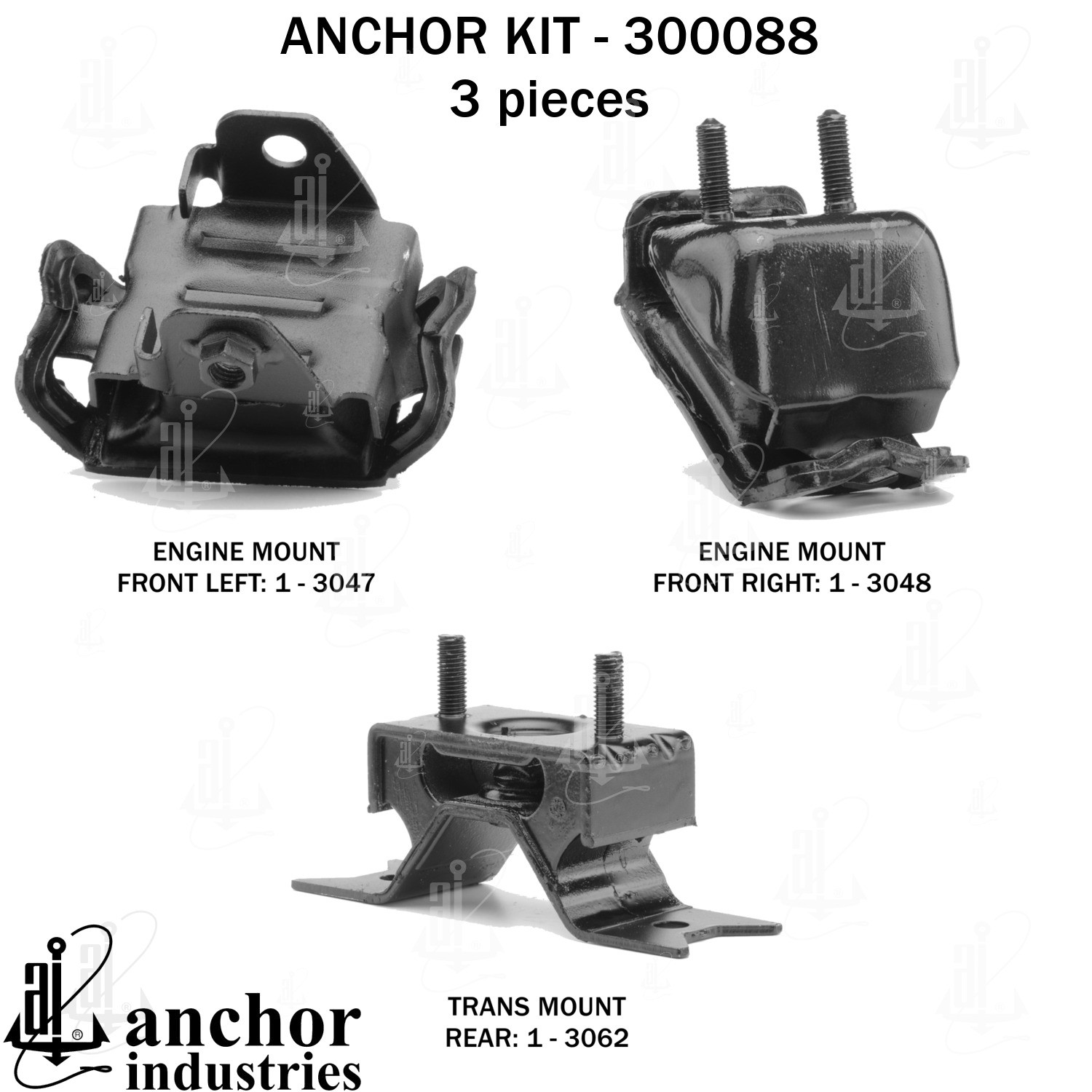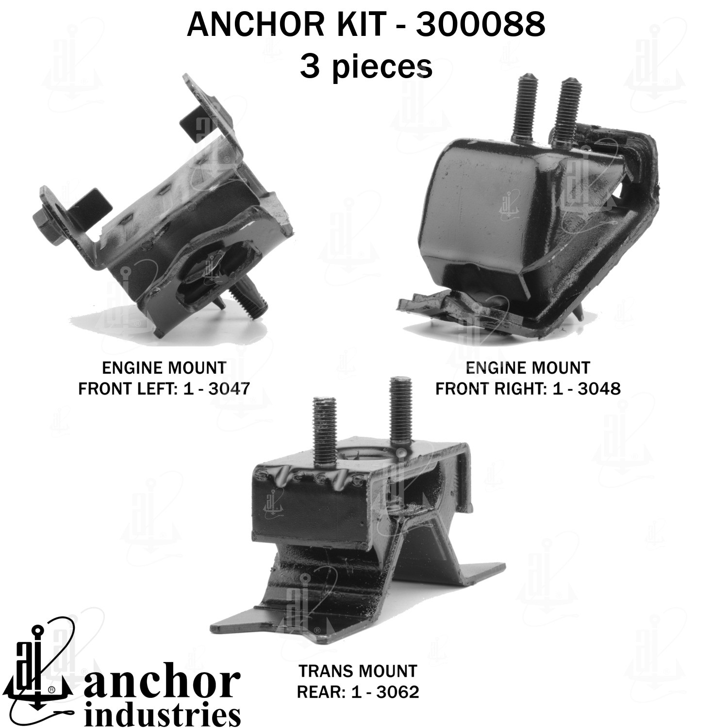 - Anchor 300088; ENGINE MNT KIT ; Each part of this kit is specifically engineered and manufactured to meet or exceed OE standards to ensure perfect fit and function. Natural and SBR rubber provide maximum life and performance. Steel fasteners are heat treated grade 5 bolts. A special bonding agent is used to ensure a rubber to metal bond. Rubber material is mixed to specific Durometer, hardness. 12 Month Warranty.