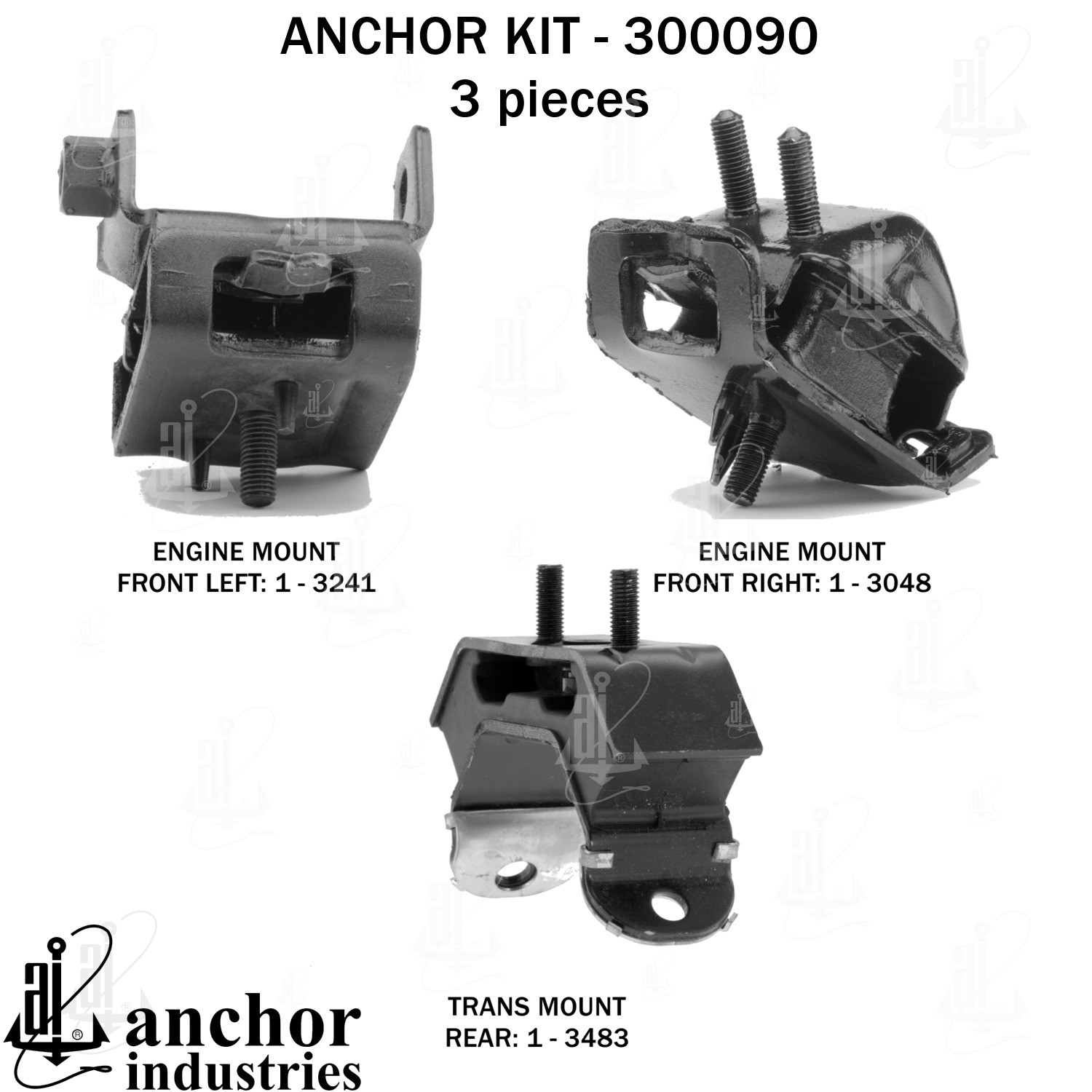 - Anchor 300090; ENGINE MNT KIT ; Each part of this kit is specifically engineered and manufactured to meet or exceed OE standards to ensure perfect fit and function. Natural and SBR rubber provide maximum life and performance. Steel fasteners are heat treated grade 5 bolts. A special bonding agent is used to ensure a rubber to metal bond. Rubber material is mixed to specific Durometer, hardness. 12 Month Warranty.