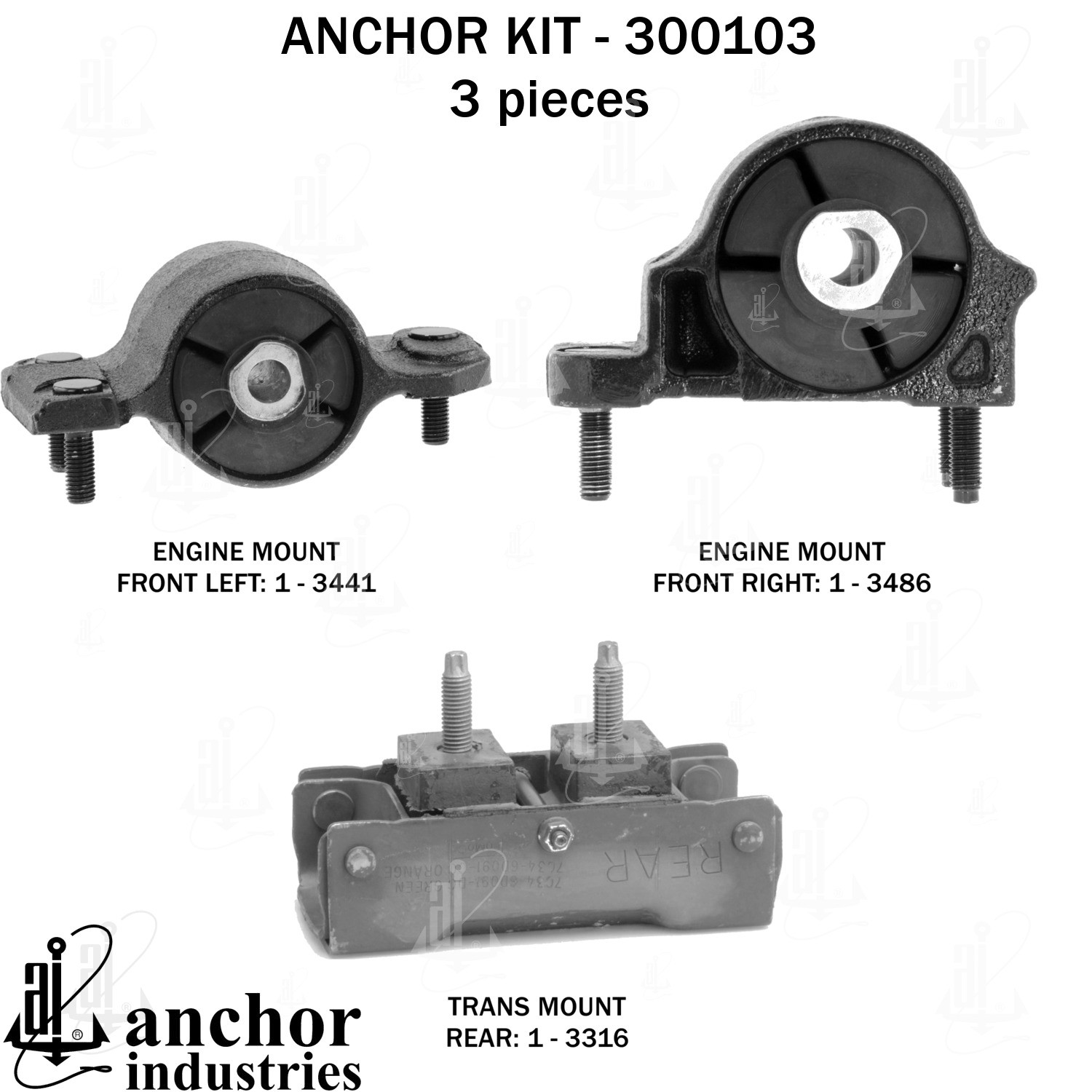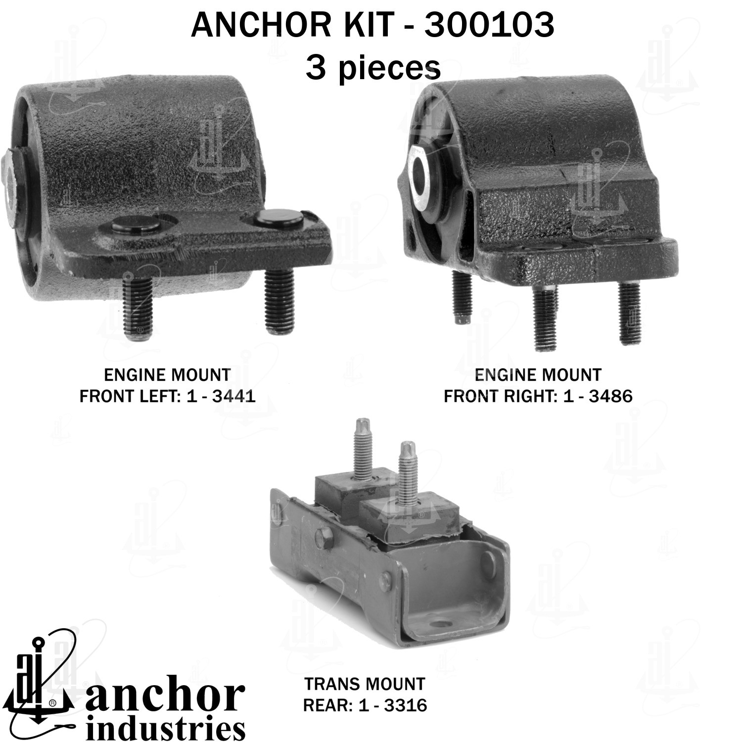 - Anchor 300103; ENGINE MNT KIT ; Each part of this kit is specifically engineered and manufactured to meet or exceed OE standards to ensure perfect fit and function. Natural and SBR rubber provide maximum life and performance. Steel fasteners are heat treated grade 5 bolts. A special bonding agent is used to ensure a rubber to metal bond. Rubber material is mixed to specific Durometer, hardness. 12 Month Warranty.