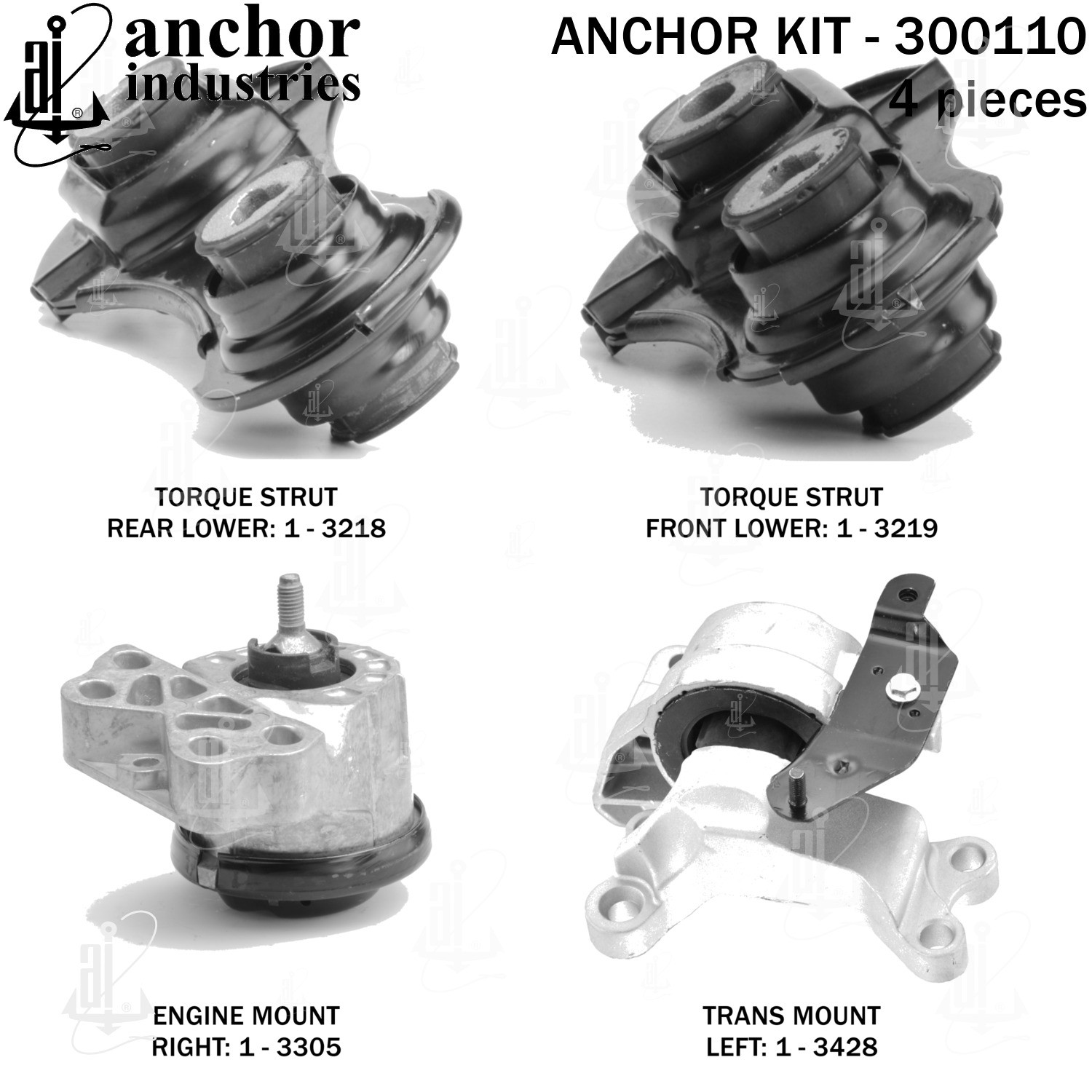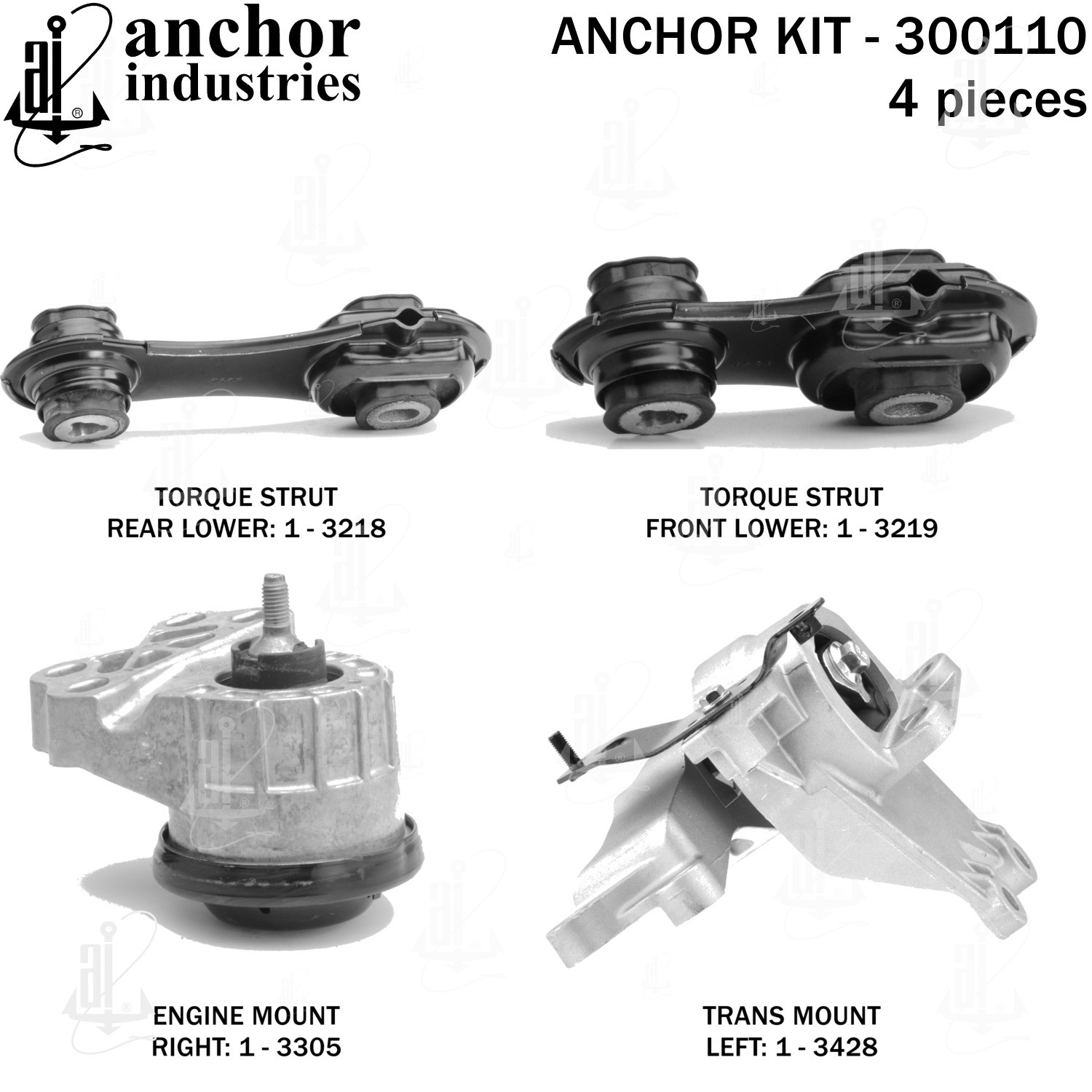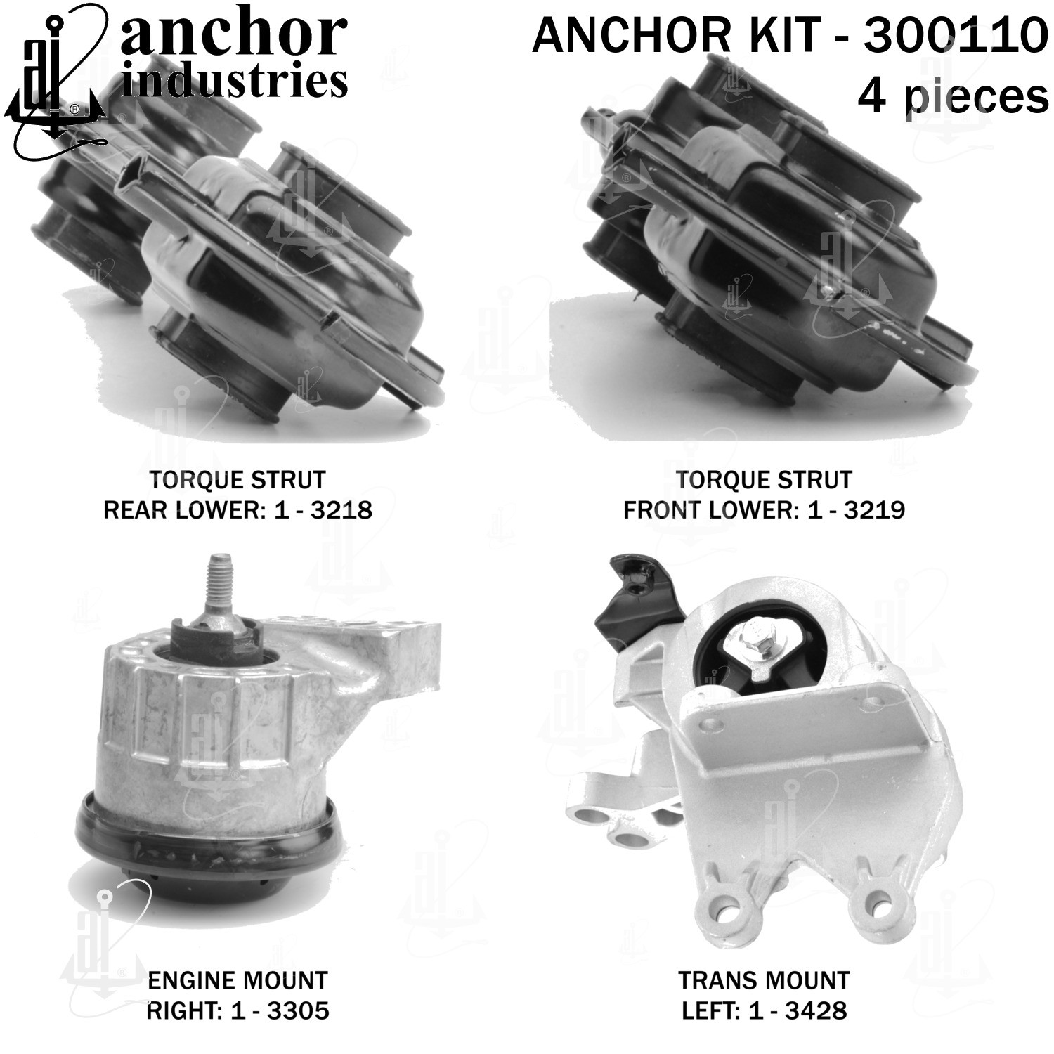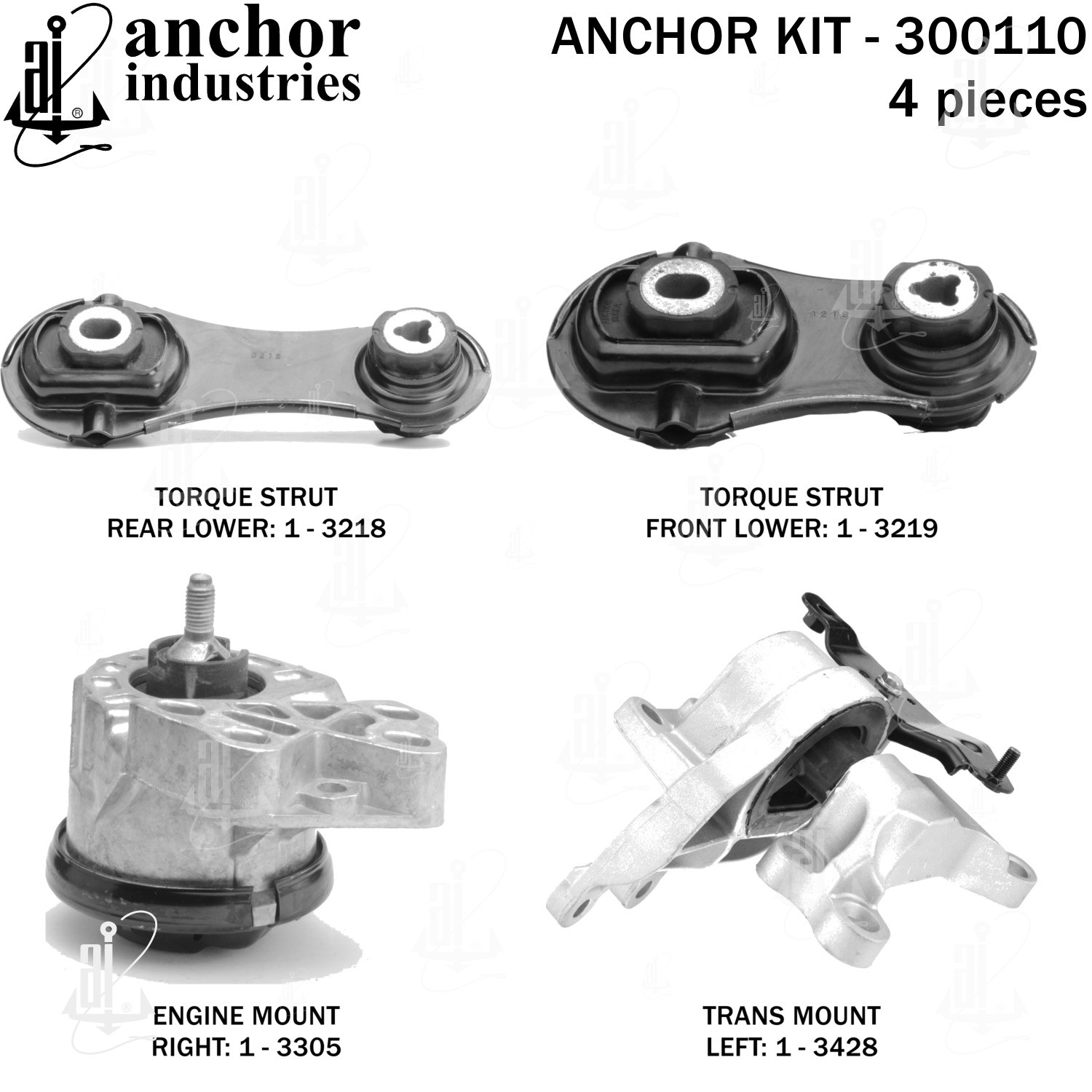 - Anchor 300110; ENGINE MNT KIT ; Each part of this kit is specifically engineered and manufactured to meet or exceed OE standards to ensure perfect fit and function. Natural and SBR rubber provide maximum life and performance. Steel fasteners are heat treated grade 5 bolts. A special bonding agent is used to ensure a rubber to metal bond. Rubber material is mixed to specific Durometer, hardness. 12 Month Warranty.
