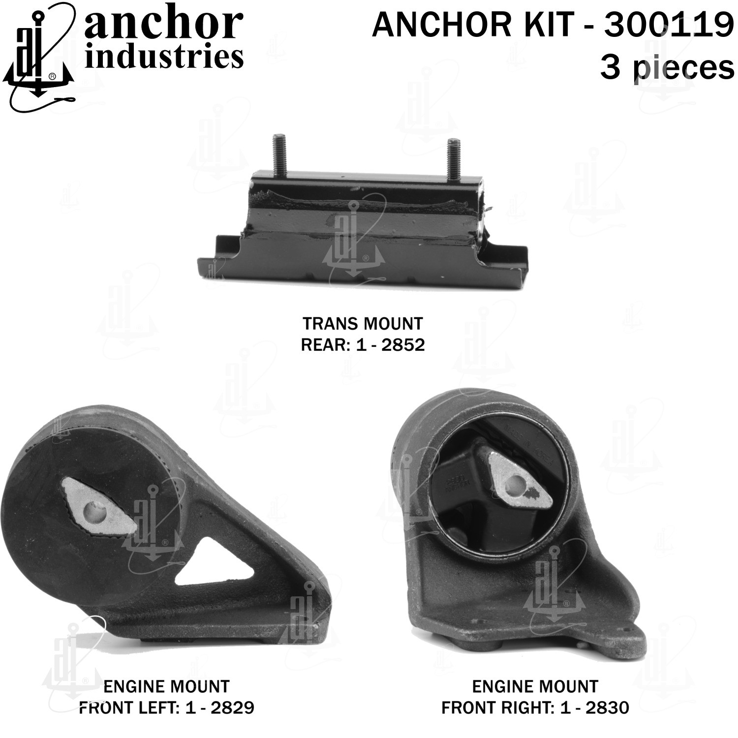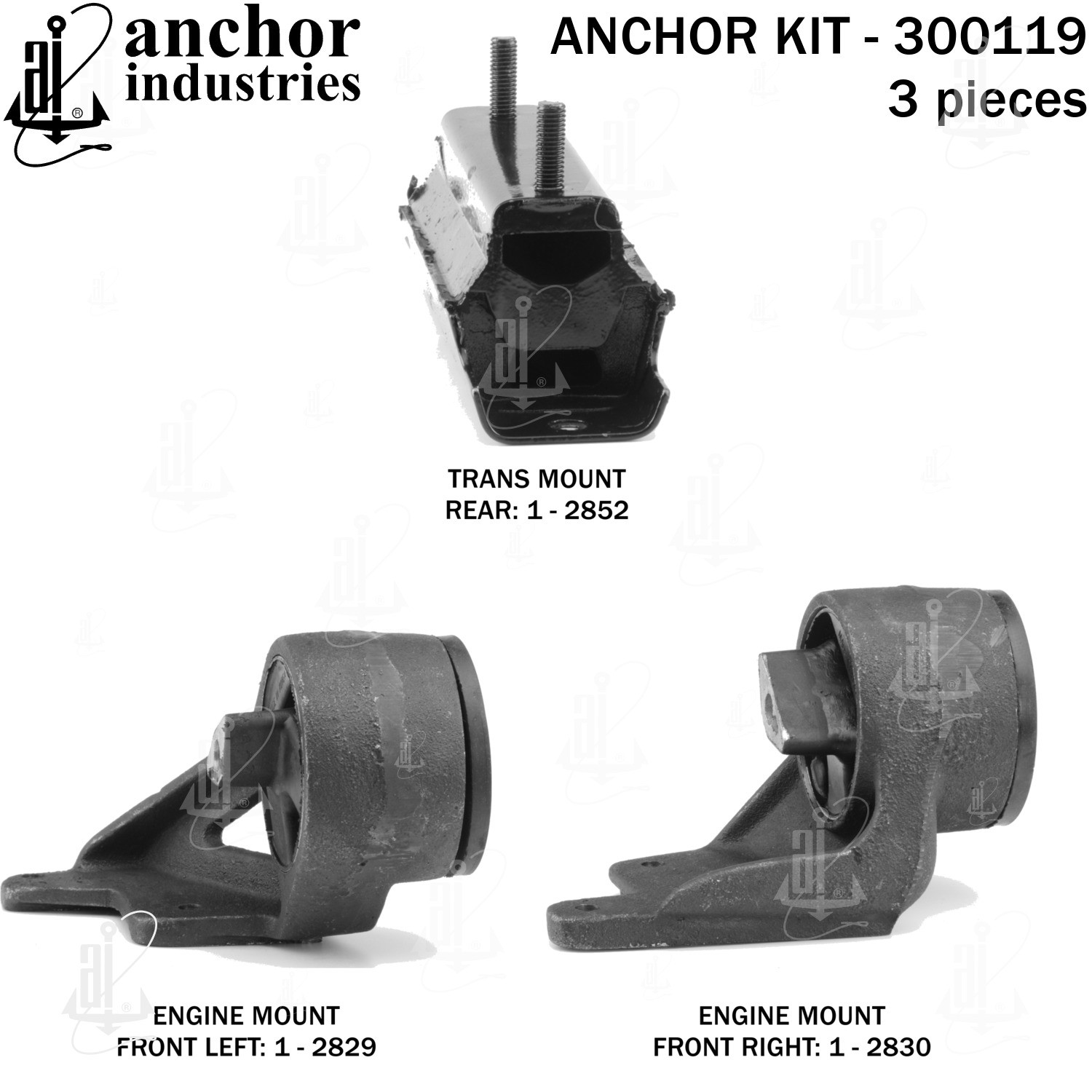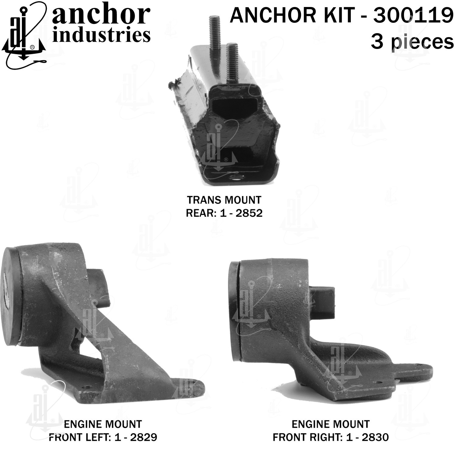 - Anchor 300119; ENGINE MNT KIT ; Each part of this kit is specifically engineered and manufactured to meet or exceed OE standards to ensure perfect fit and function. Natural and SBR rubber provide maximum life and performance. Steel fasteners are heat treated grade 5 bolts. A special bonding agent is used to ensure a rubber to metal bond. Rubber material is mixed to specific Durometer, hardness. 12 Month Warranty.