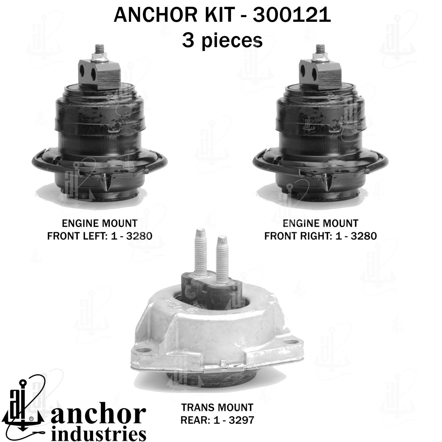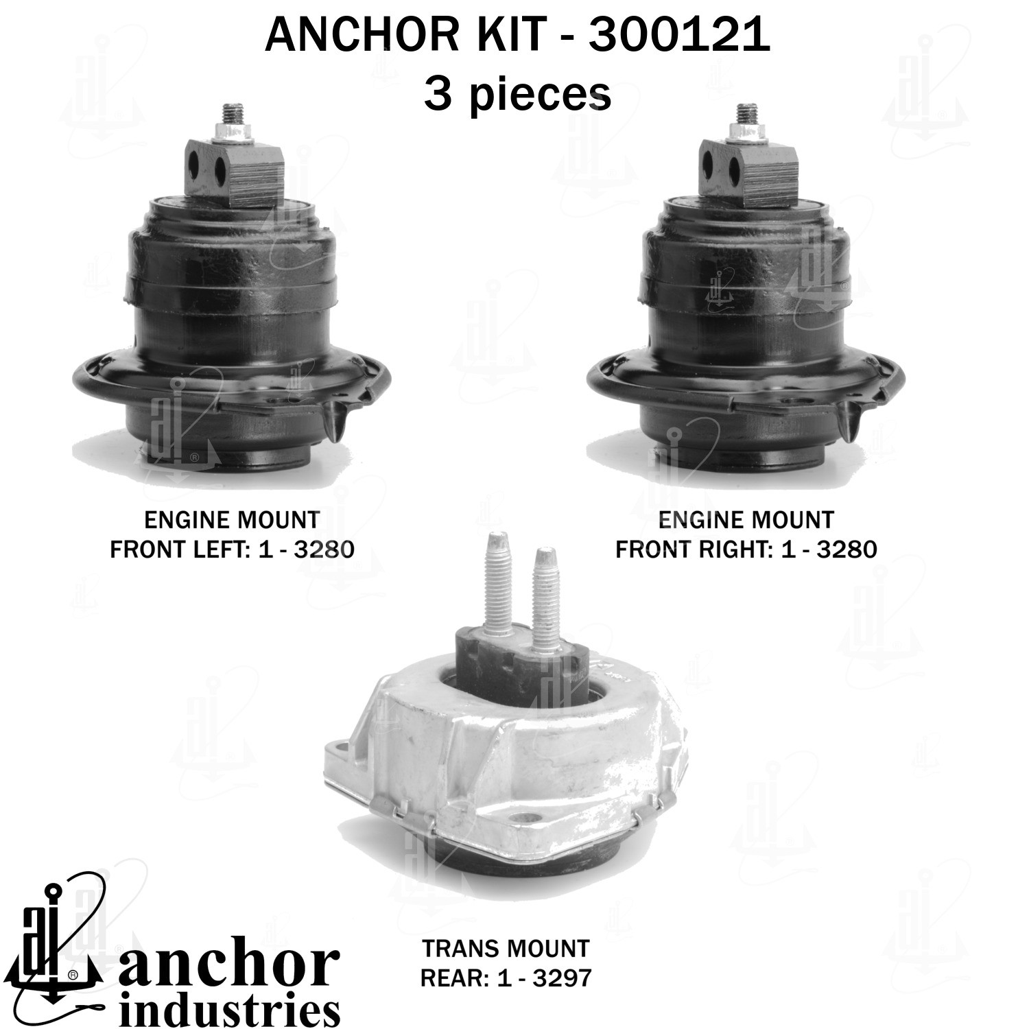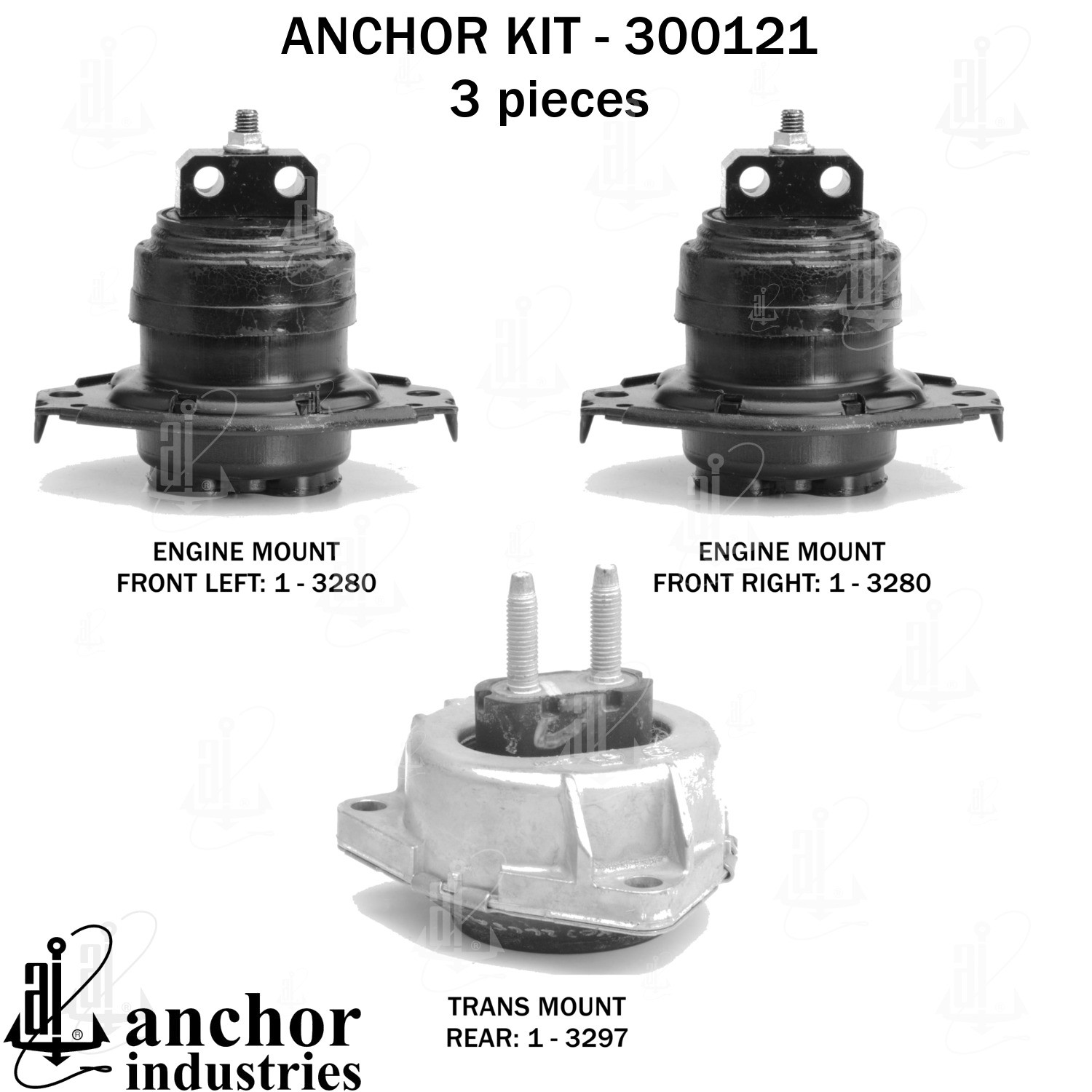- Anchor 300121; ENGINE MNT KIT ; Each part of this kit is specifically engineered and manufactured to meet or exceed OE standards to ensure perfect fit and function. Natural and SBR rubber provide maximum life and performance. Steel fasteners are heat treated grade 5 bolts. A special bonding agent is used to ensure a rubber to metal bond. Rubber material is mixed to specific Durometer, hardness. 12 Month Warranty.