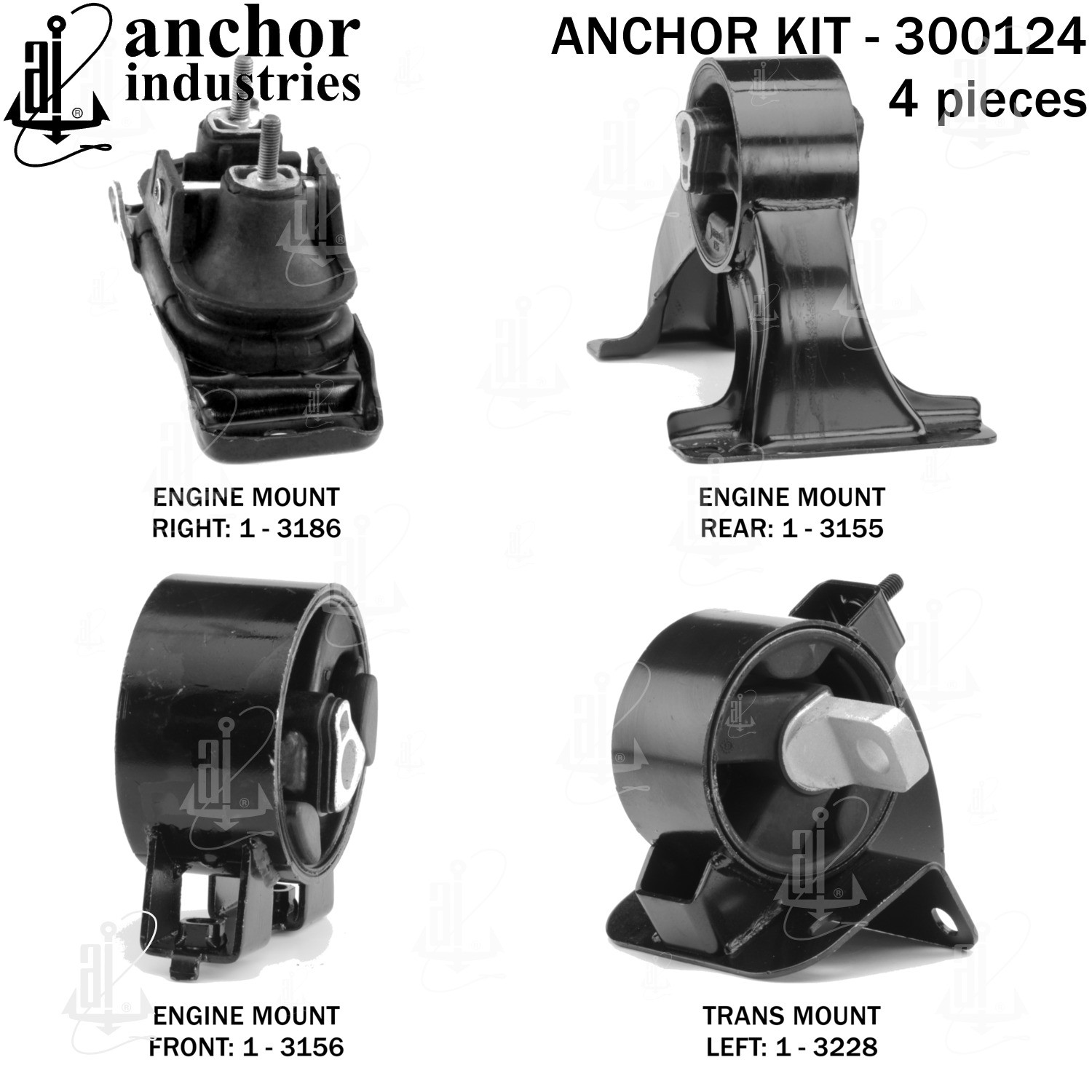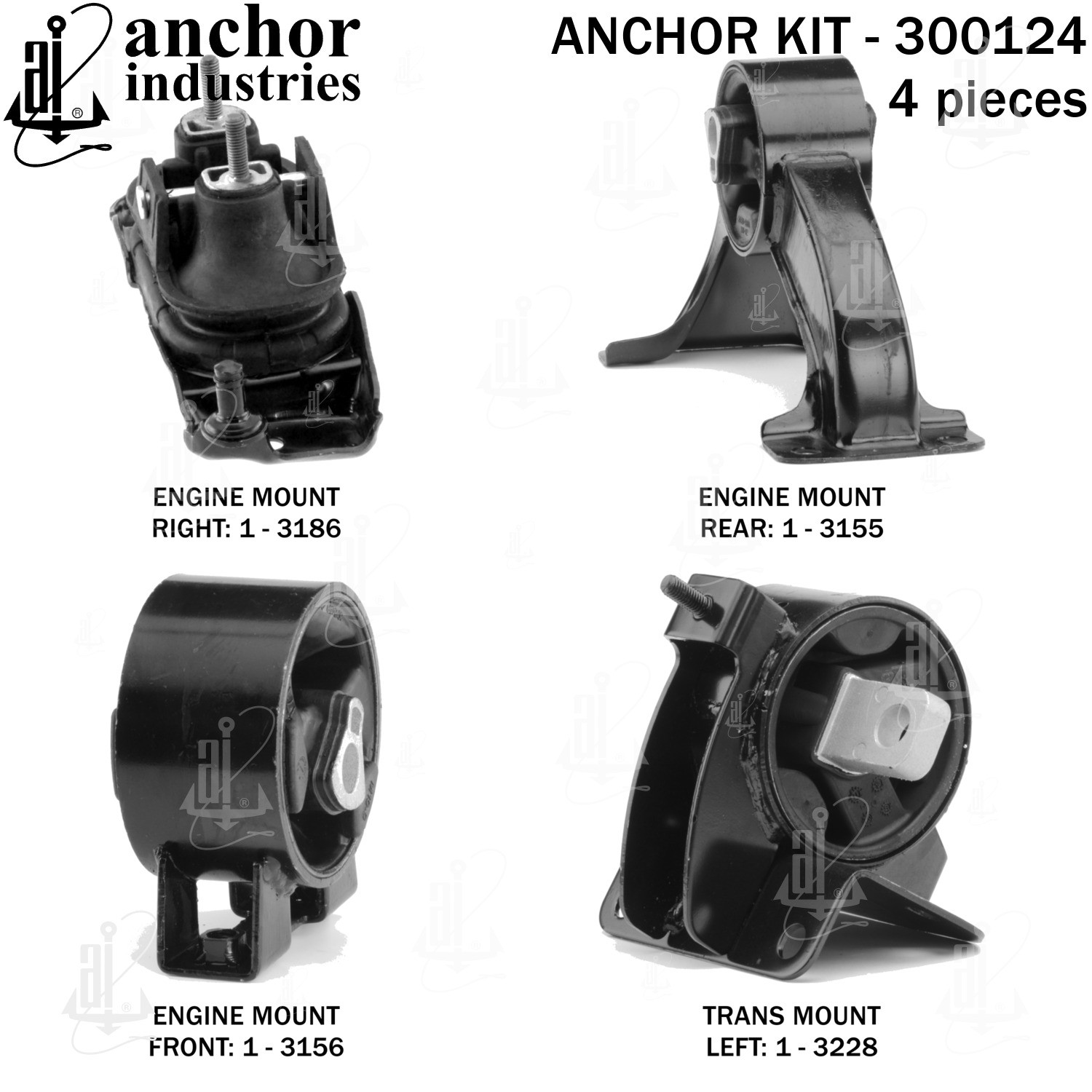 - Anchor 300124; ENGINE MNT KIT ; Each part of this kit is specifically engineered and manufactured to meet or exceed OE standards to ensure perfect fit and function. Natural and SBR rubber provide maximum life and performance. Steel fasteners are heat treated grade 5 bolts. A special bonding agent is used to ensure a rubber to metal bond. Rubber material is mixed to specific Durometer, hardness. 12 Month Warranty.