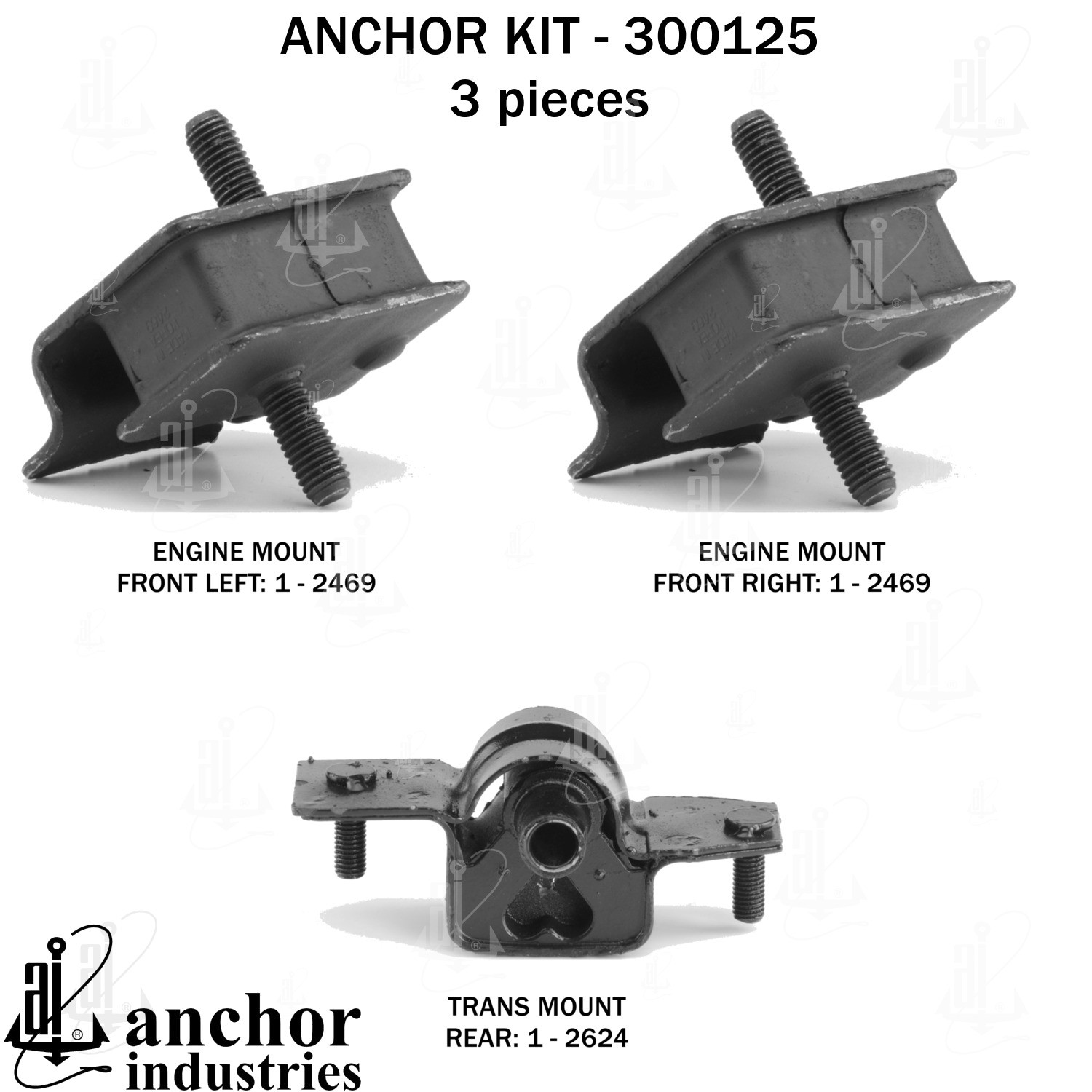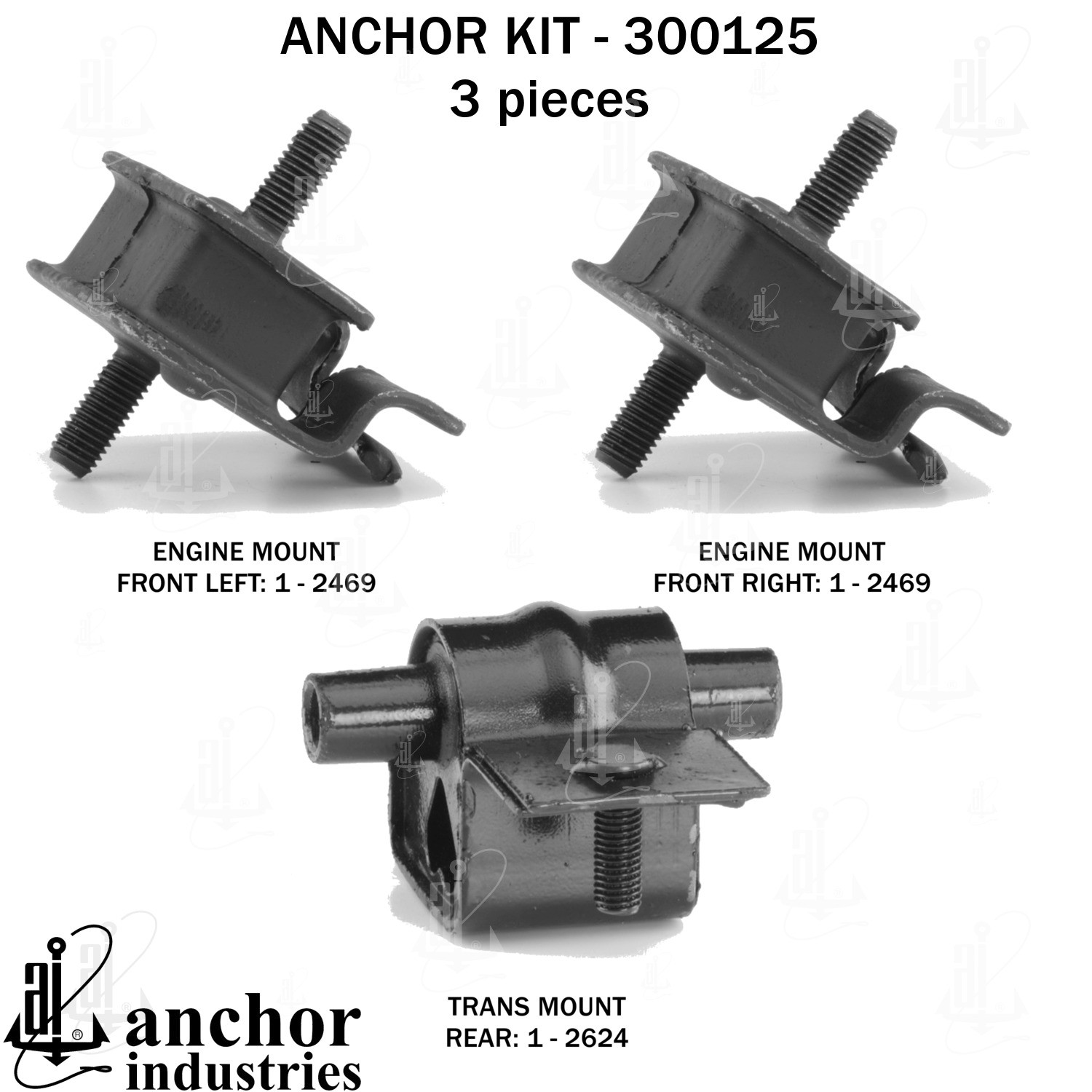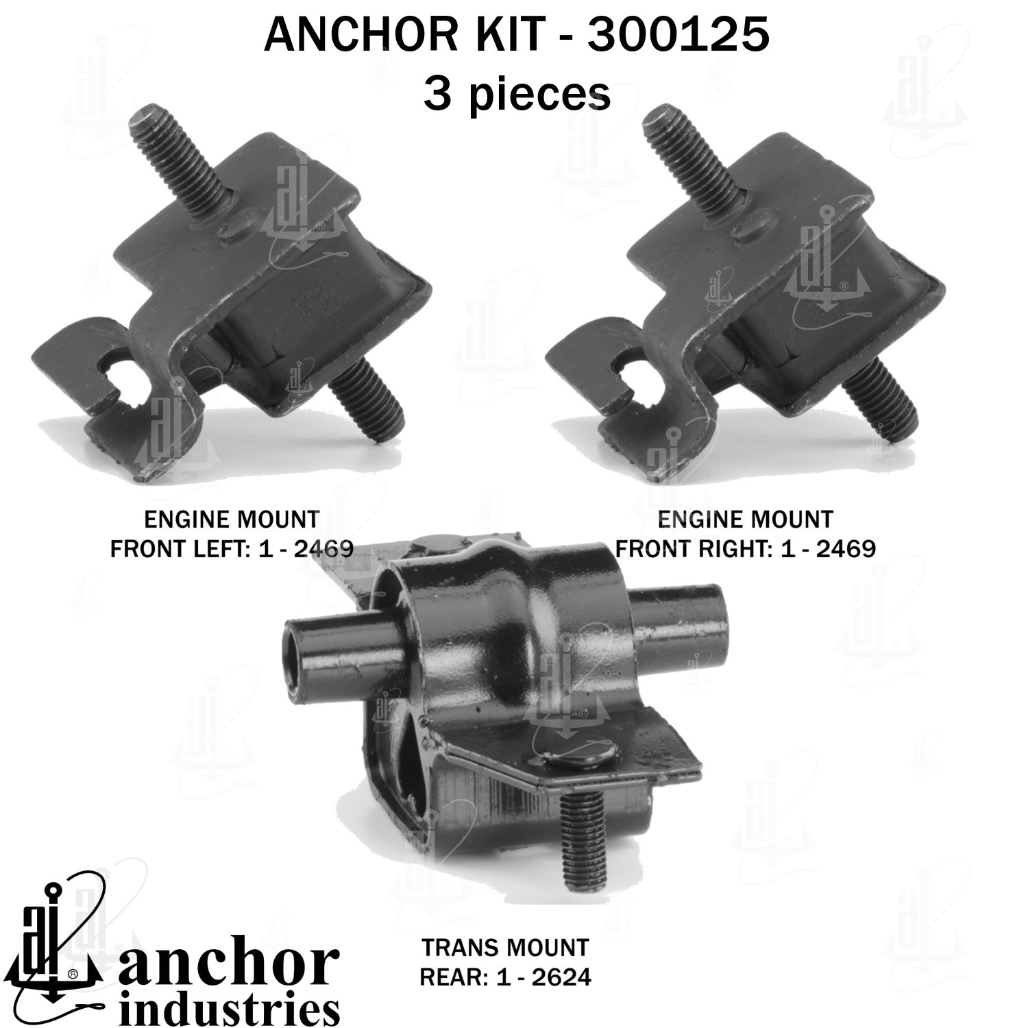 - Anchor 300125; ENGINE MNT KIT ; Each part of this kit is specifically engineered and manufactured to meet or exceed OE standards to ensure perfect fit and function. Natural and SBR rubber provide maximum life and performance. Steel fasteners are heat treated grade 5 bolts. A special bonding agent is used to ensure a rubber to metal bond. Rubber material is mixed to specific Durometer, hardness. 12 Month Warranty.