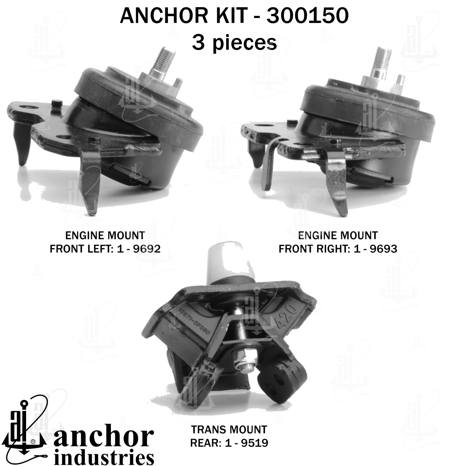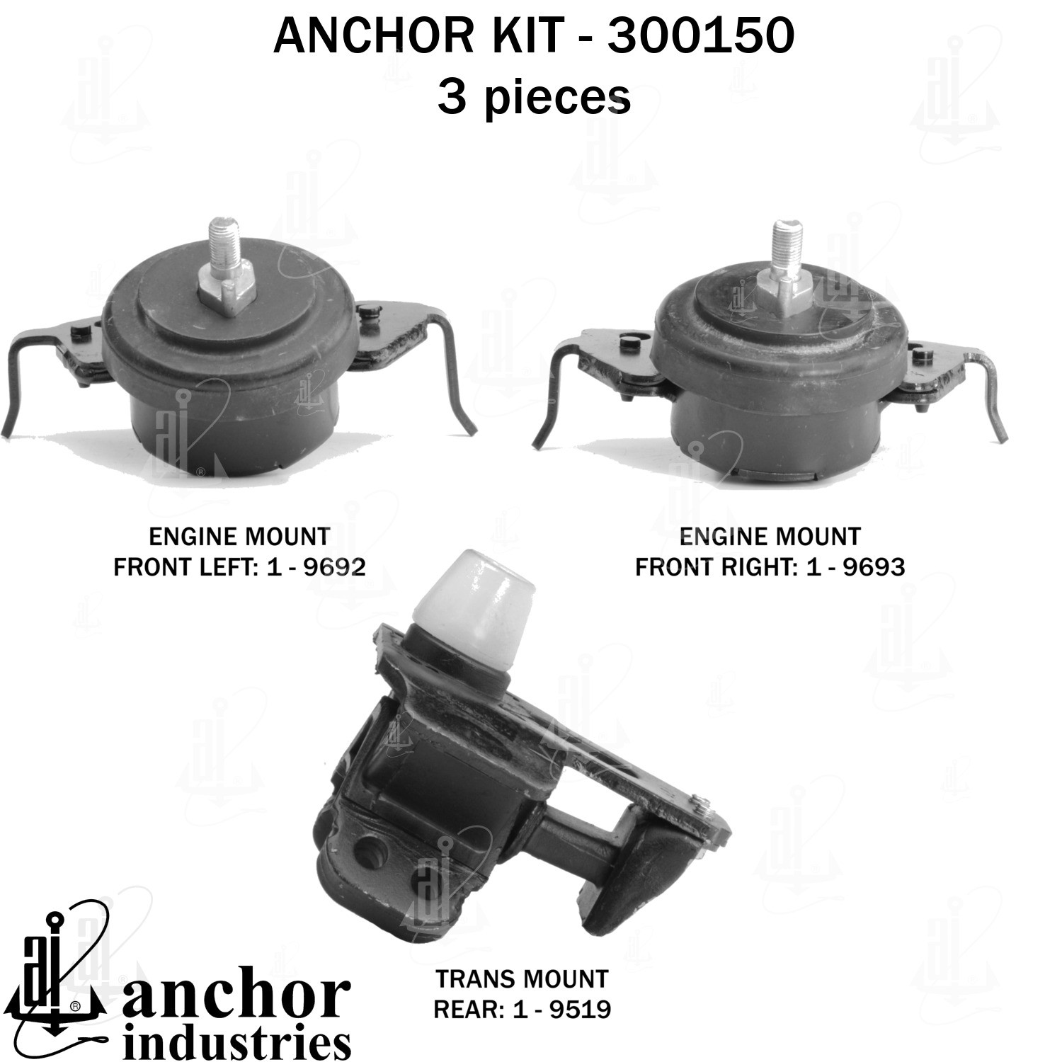 - Anchor 300150; ENGINE MNT KIT ; Each part of this kit is specifically engineered and manufactured to meet or exceed OE standards to ensure perfect fit and function. Natural and SBR rubber provide maximum life and performance. Steel fasteners are heat treated grade 5 bolts. A special bonding agent is used to ensure a rubber to metal bond. Rubber material is mixed to specific Durometer, hardness. 12 Month Warranty.