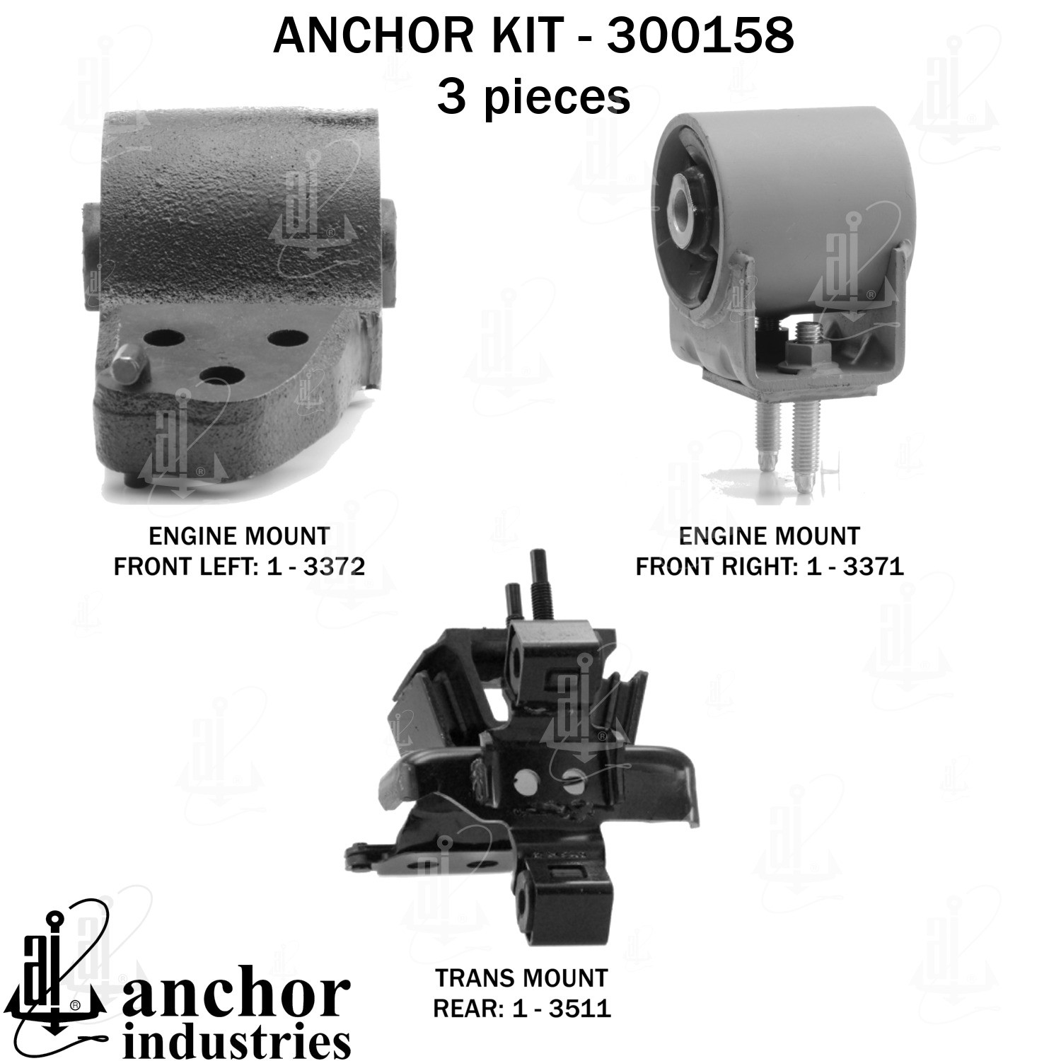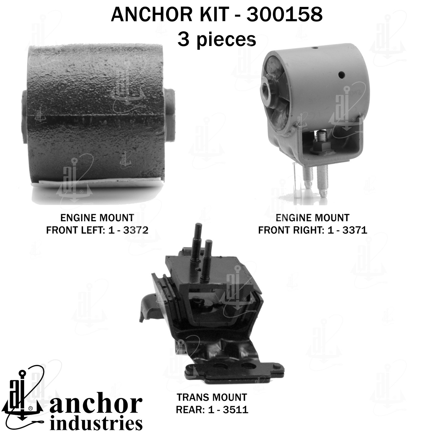 - Anchor 300158; ENGINE MNT KIT ; Each part of this kit is specifically engineered and manufactured to meet or exceed OE standards to ensure perfect fit and function. Natural and SBR rubber provide maximum life and performance. Steel fasteners are heat treated grade 5 bolts. A special bonding agent is used to ensure a rubber to metal bond. Rubber material is mixed to specific Durometer, hardness. 12 Month Warranty.