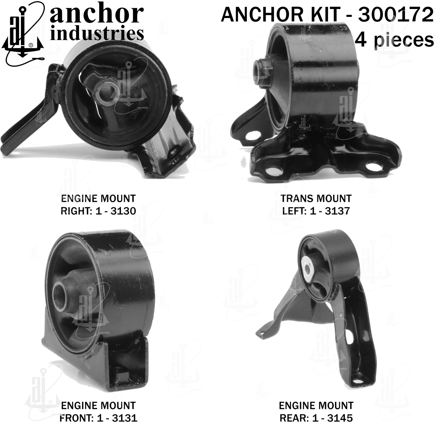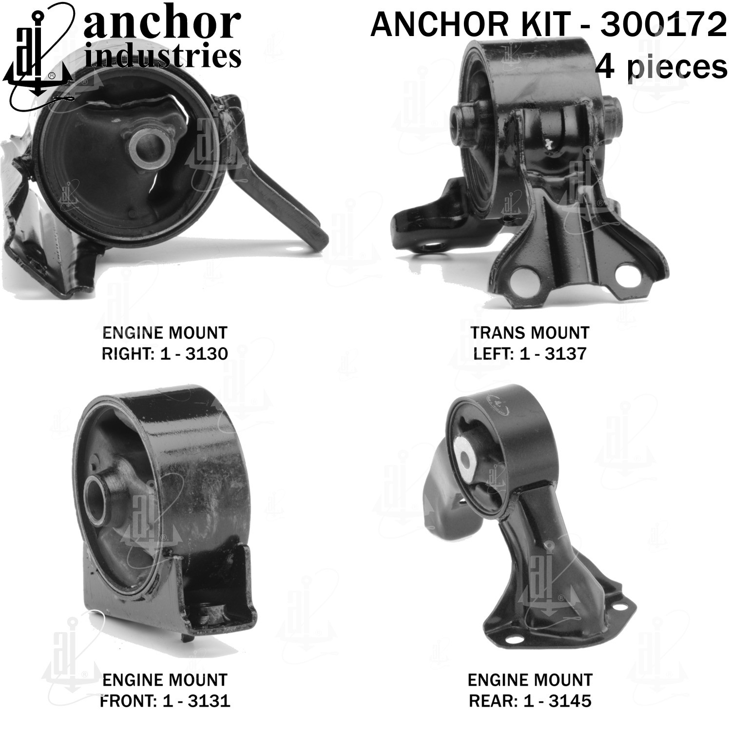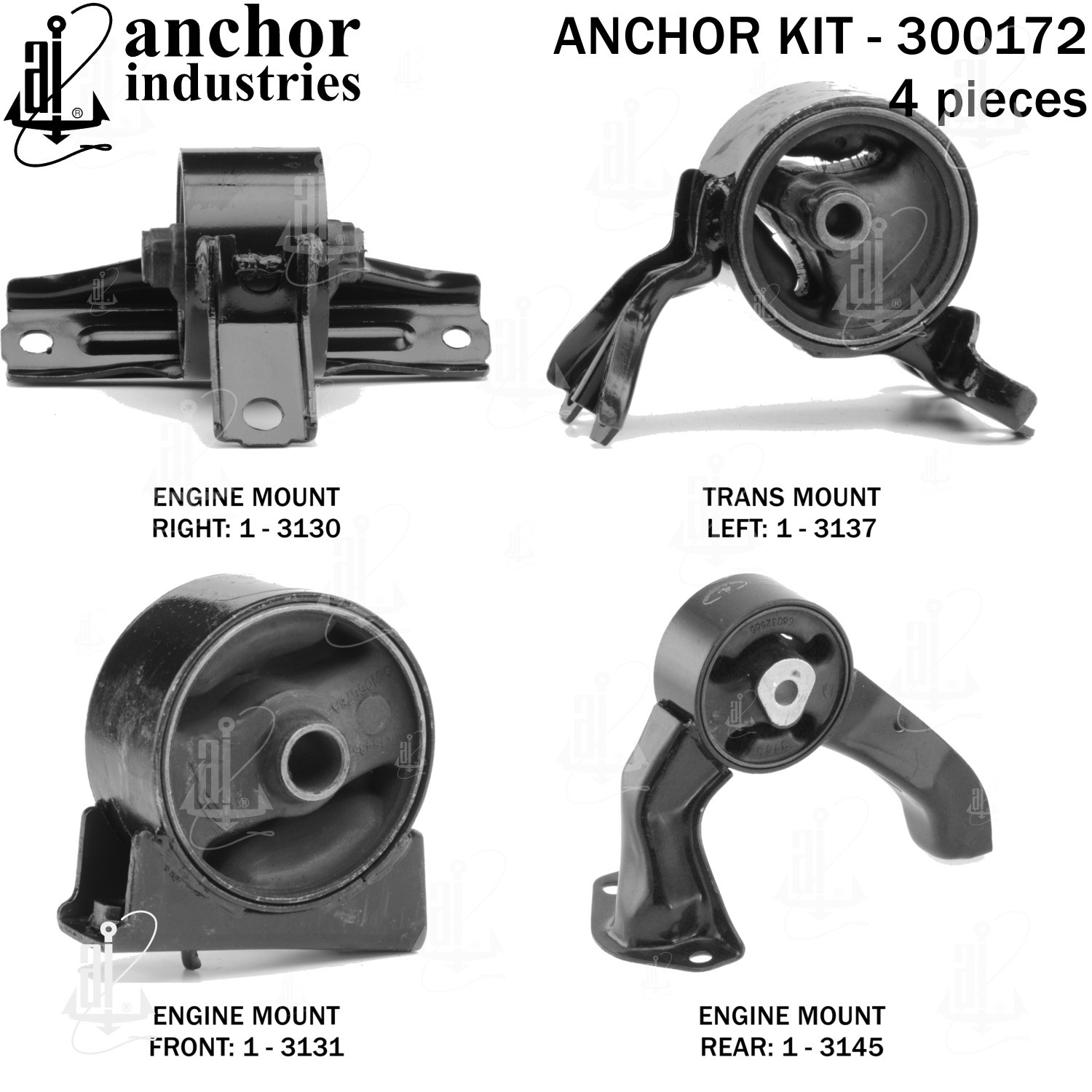 - Anchor 300172; ENGINE MNT KIT ; Each part of this kit is specifically engineered and manufactured to meet or exceed OE standards to ensure perfect fit and function. Natural and SBR rubber provide maximum life and performance. Steel fasteners are heat treated grade 5 bolts. A special bonding agent is used to ensure a rubber to metal bond. Rubber material is mixed to specific Durometer, hardness. 12 Month Warranty.