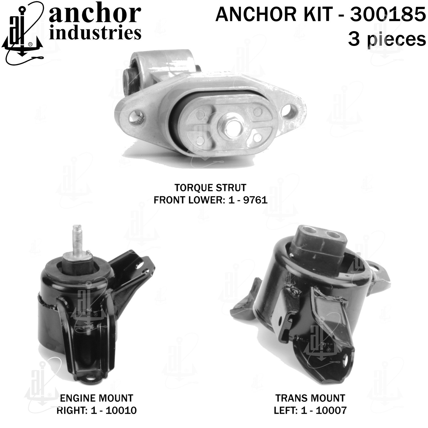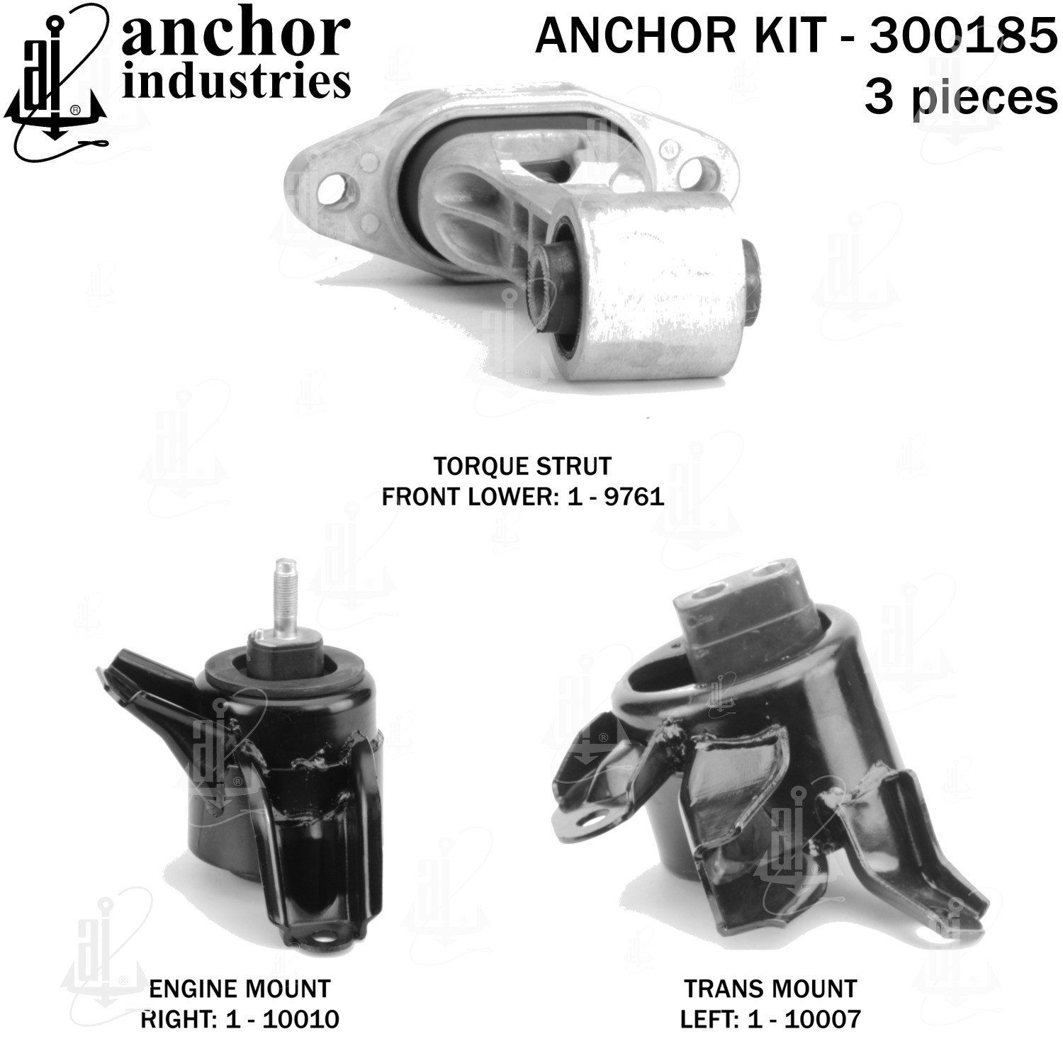 - Anchor 300185; ENGINE MNT KIT ; Each part of this kit is specifically engineered and manufactured to meet or exceed OE standards to ensure perfect fit and function. Natural and SBR rubber provide maximum life and performance. Steel fasteners are heat treated grade 5 bolts. A special bonding agent is used to ensure a rubber to metal bond. Rubber material is mixed to specific Durometer, hardness. 12 Month Warranty.