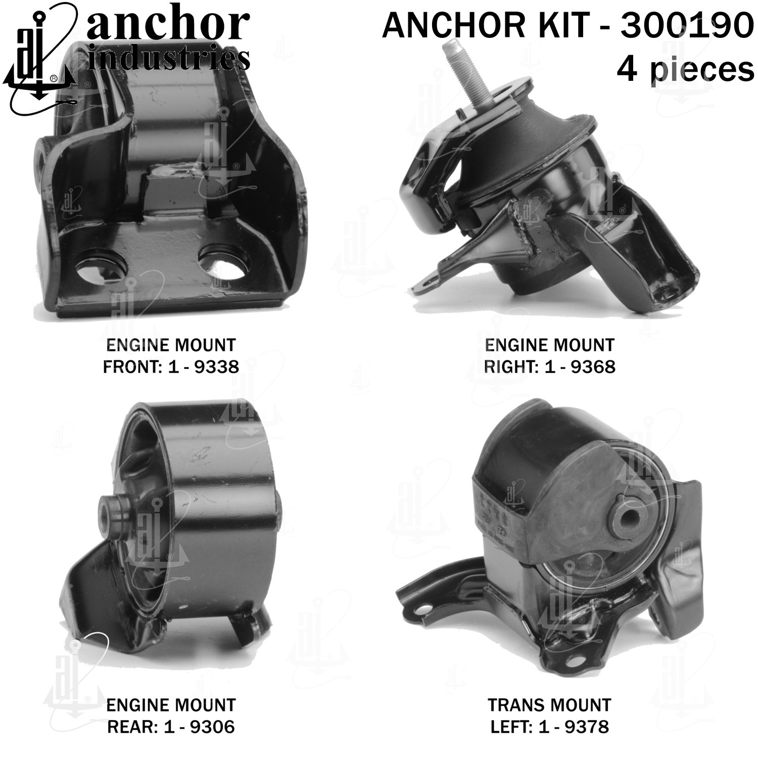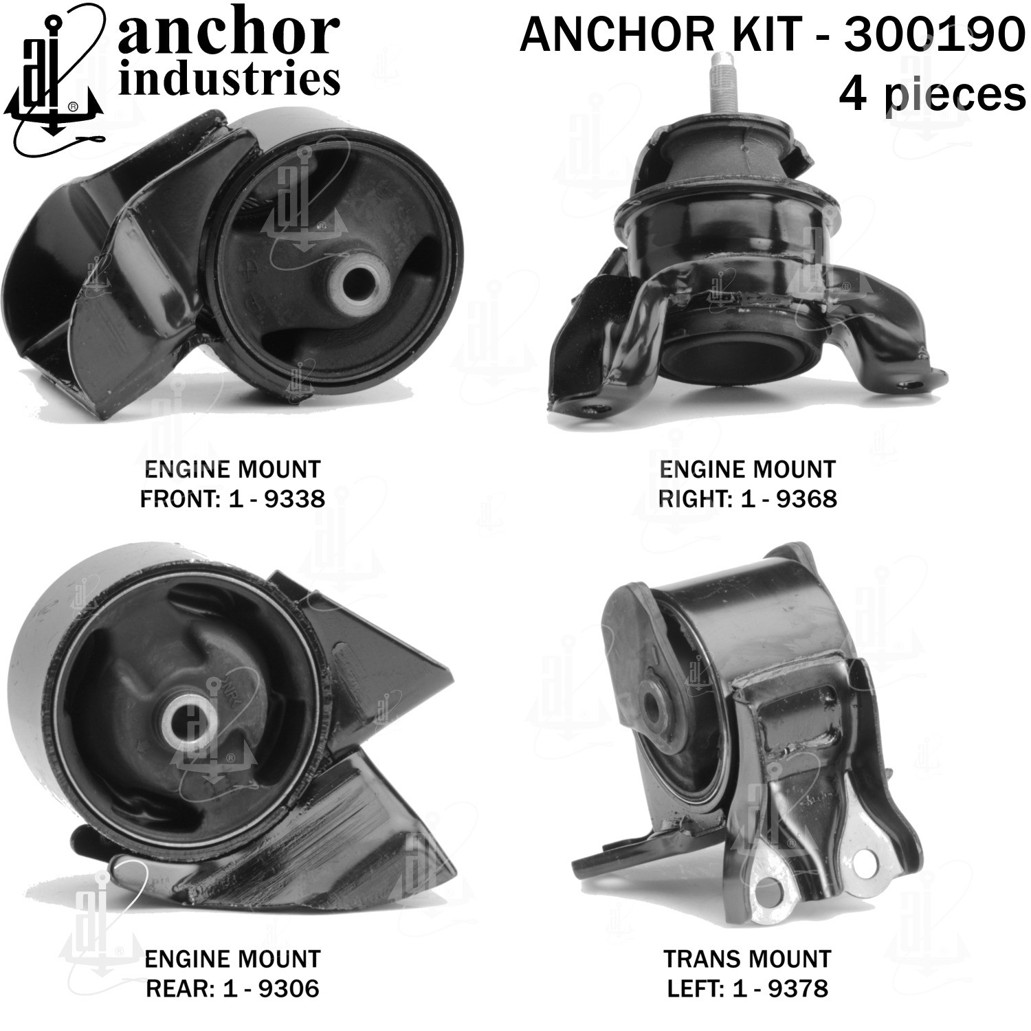 - Anchor 300190; ENGINE MNT KIT ; Each part of this kit is specifically engineered and manufactured to meet or exceed OE standards to ensure perfect fit and function. Natural and SBR rubber provide maximum life and performance. Steel fasteners are heat treated grade 5 bolts. A special bonding agent is used to ensure a rubber to metal bond. Rubber material is mixed to specific Durometer, hardness. 12 Month Warranty.