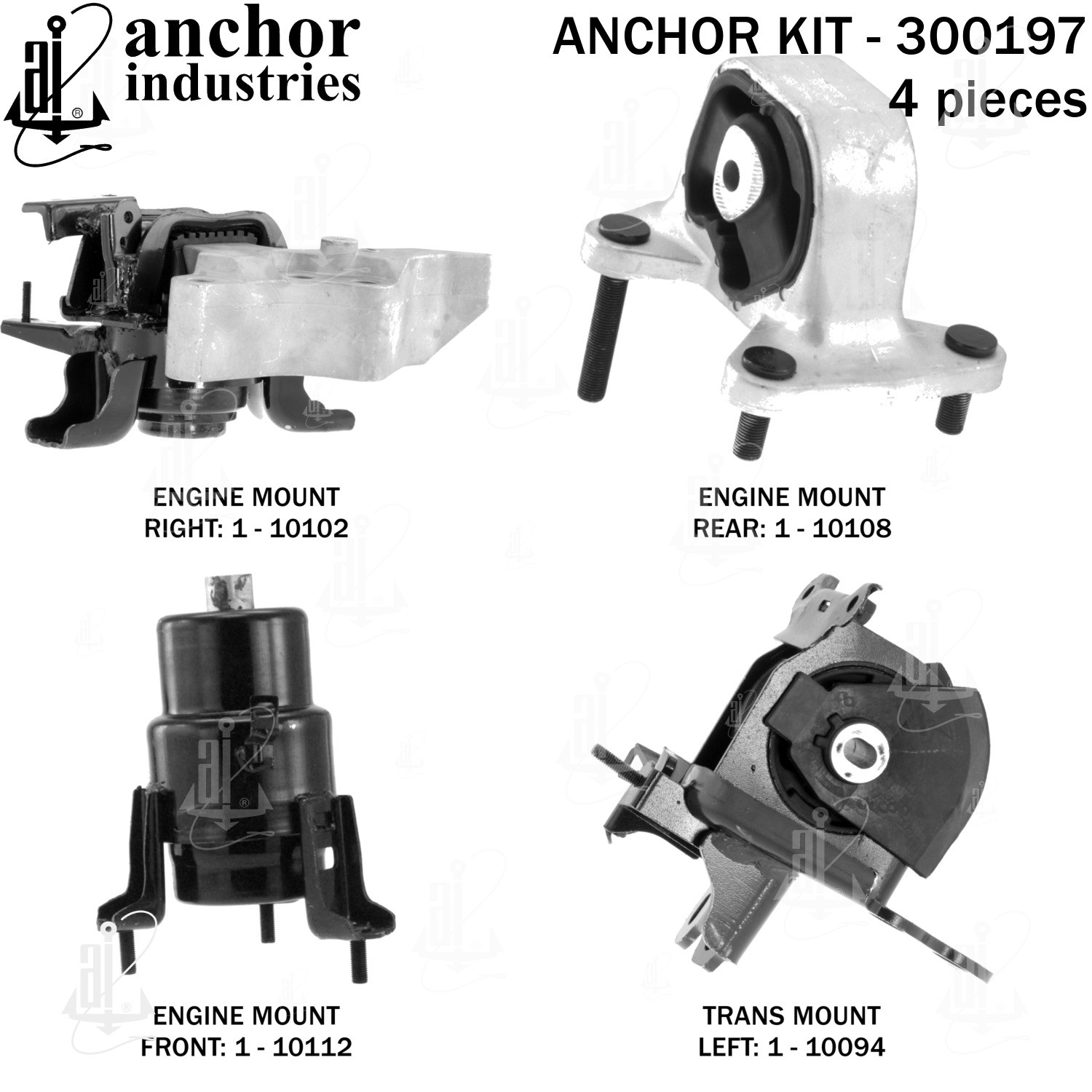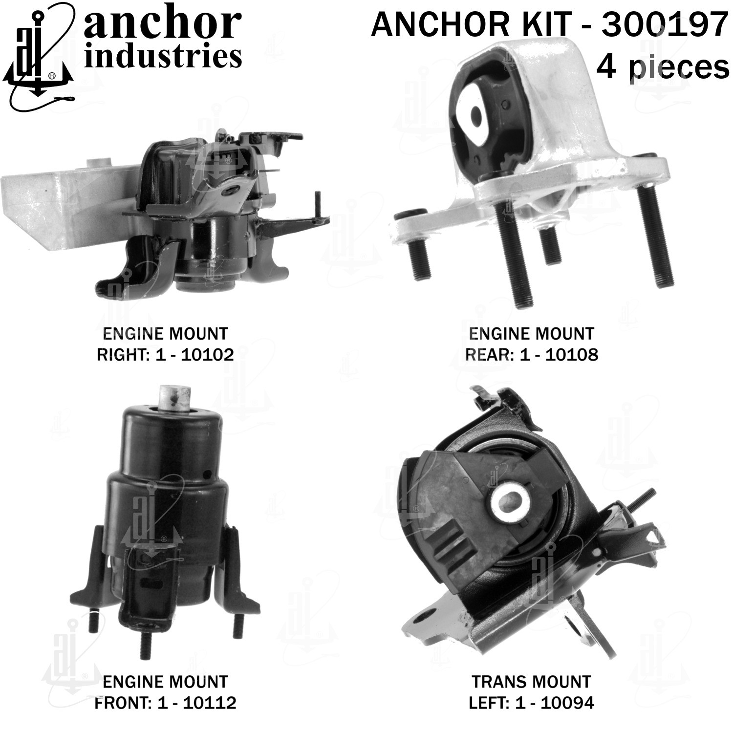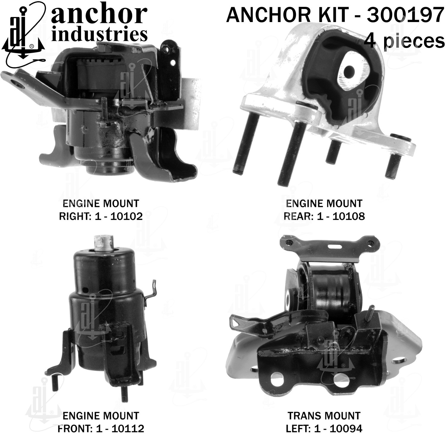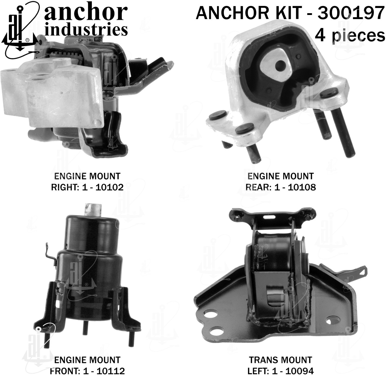 - Anchor 300197; ENGINE MNT KIT ; Each part of this kit is specifically engineered and manufactured to meet or exceed OE standards to ensure perfect fit and function. Natural and SBR rubber provide maximum life and performance. Steel fasteners are heat treated grade 5 bolts. A special bonding agent is used to ensure a rubber to metal bond. Rubber material is mixed to specific Durometer, hardness. 12 Month Warranty.