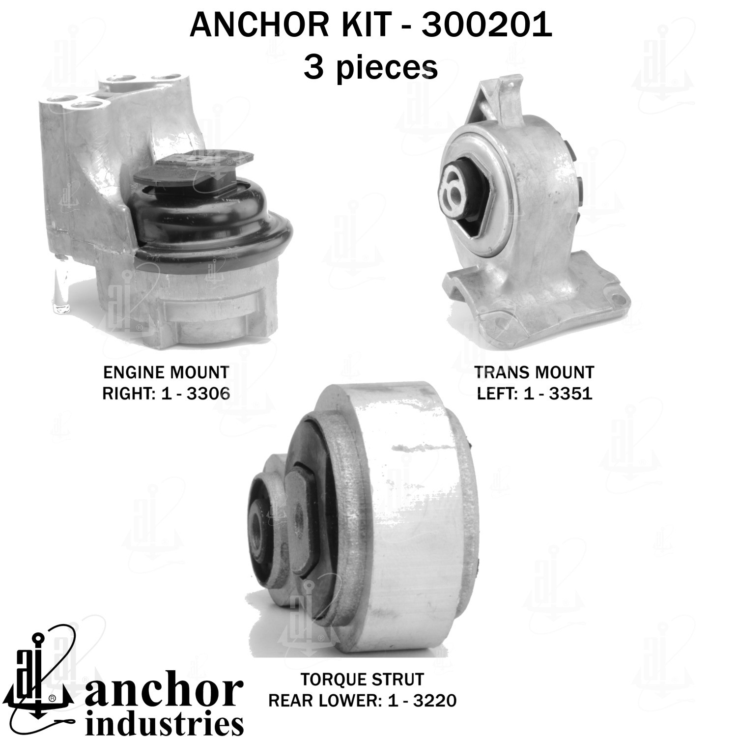 - Anchor 300201; ENGINE MNT KIT ; Each part of this kit is specifically engineered and manufactured to meet or exceed OE standards to ensure perfect fit and function. Natural and SBR rubber provide maximum life and performance. Steel fasteners are heat treated grade 5 bolts. A special bonding agent is used to ensure a rubber to metal bond. Rubber material is mixed to specific Durometer, hardness. 12 Month Warranty.