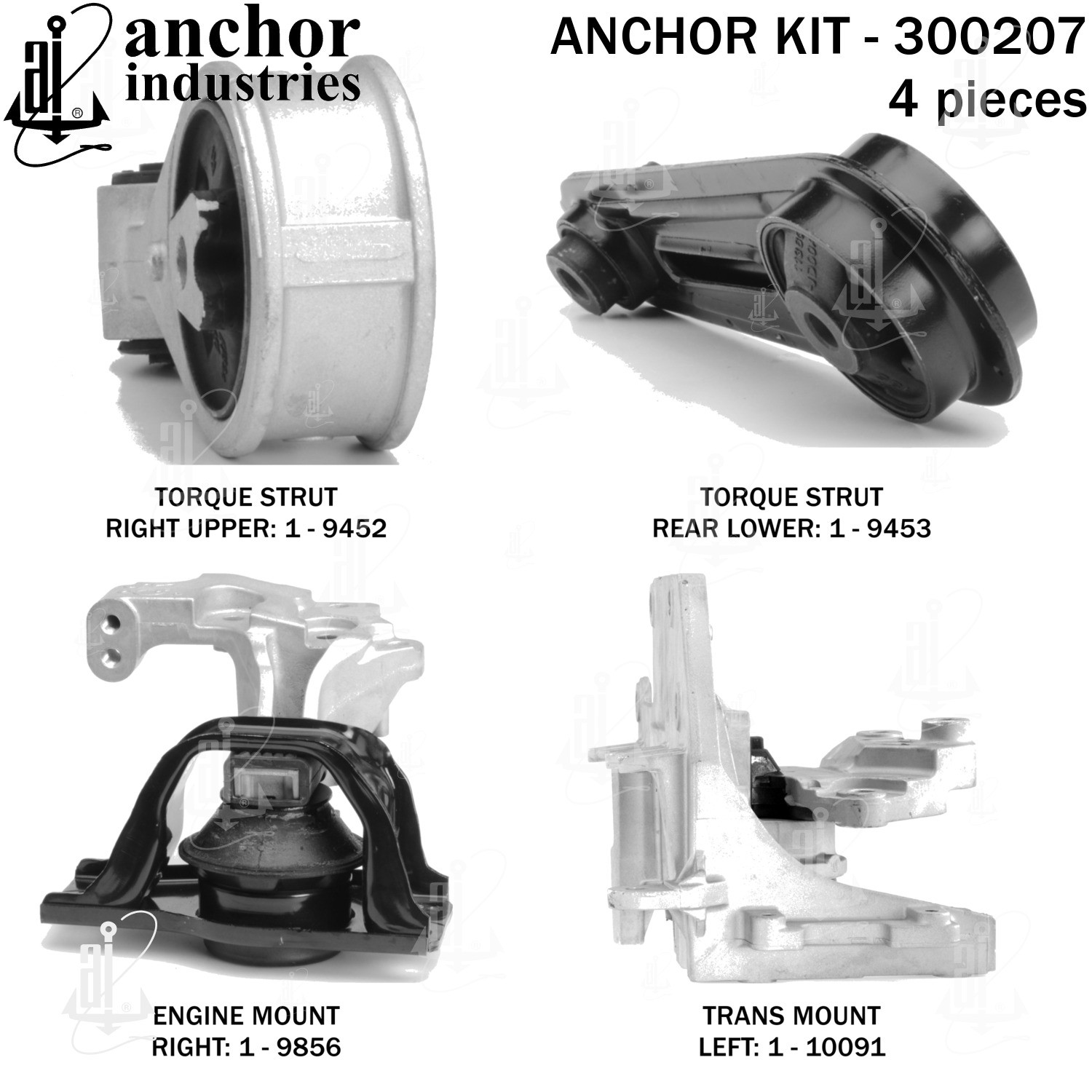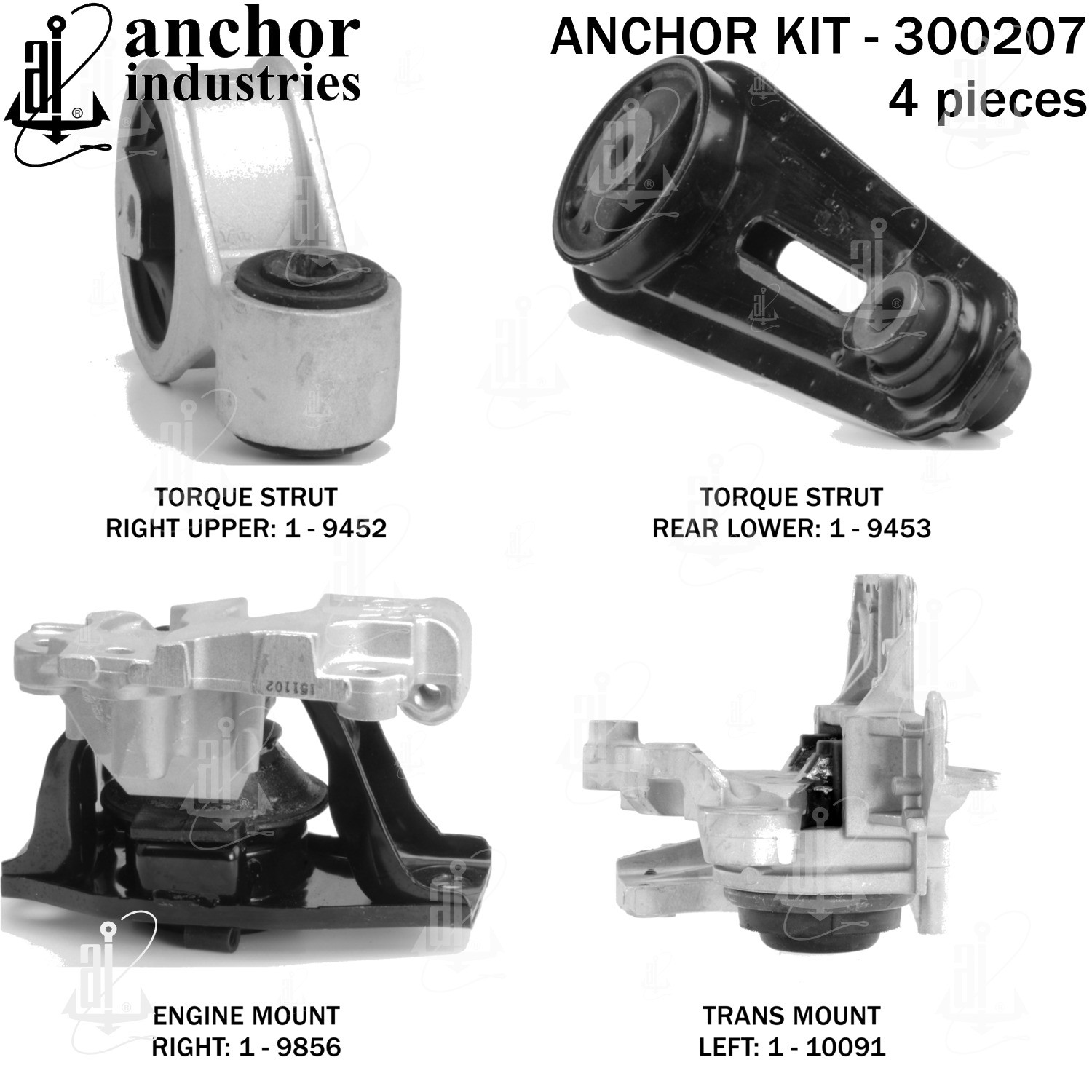 - Anchor 300207; ENGINE MNT KIT ; Each part of this kit is specifically engineered and manufactured to meet or exceed OE standards to ensure perfect fit and function. Natural and SBR rubber provide maximum life and performance. Steel fasteners are heat treated grade 5 bolts. A special bonding agent is used to ensure a rubber to metal bond. Rubber material is mixed to specific Durometer, hardness. 12 Month Warranty.