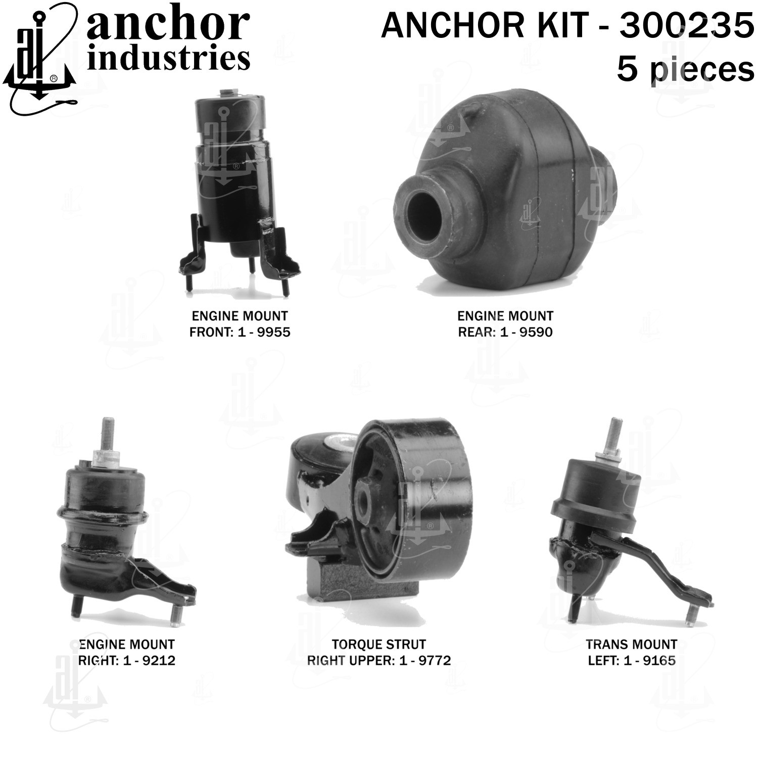 - Anchor 300235; ENGINE MNT KIT ; Each part of this kit is specifically engineered and manufactured to meet or exceed OE standards to ensure perfect fit and function. Natural and SBR rubber provide maximum life and performance. Steel fasteners are heat treated grade 5 bolts. A special bonding agent is used to ensure a rubber to metal bond. Rubber material is mixed to specific Durometer, hardness. 12 Month Warranty.