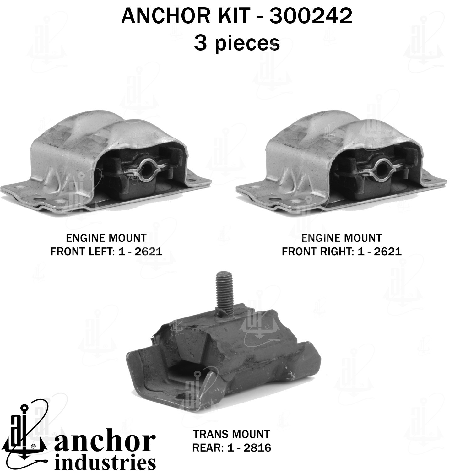 - Anchor 300242; ENGINE MNT KIT ; Each part of this kit is specifically engineered and manufactured to meet or exceed OE standards to ensure perfect fit and function. Natural and SBR rubber provide maximum life and performance. Steel fasteners are heat treated grade 5 bolts. A special bonding agent is used to ensure a rubber to metal bond. Rubber material is mixed to specific Durometer, hardness. 12 Month Warranty.