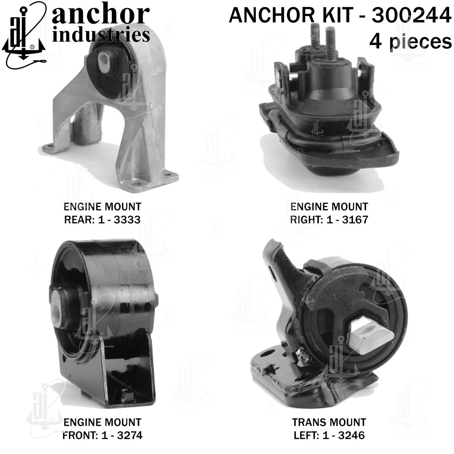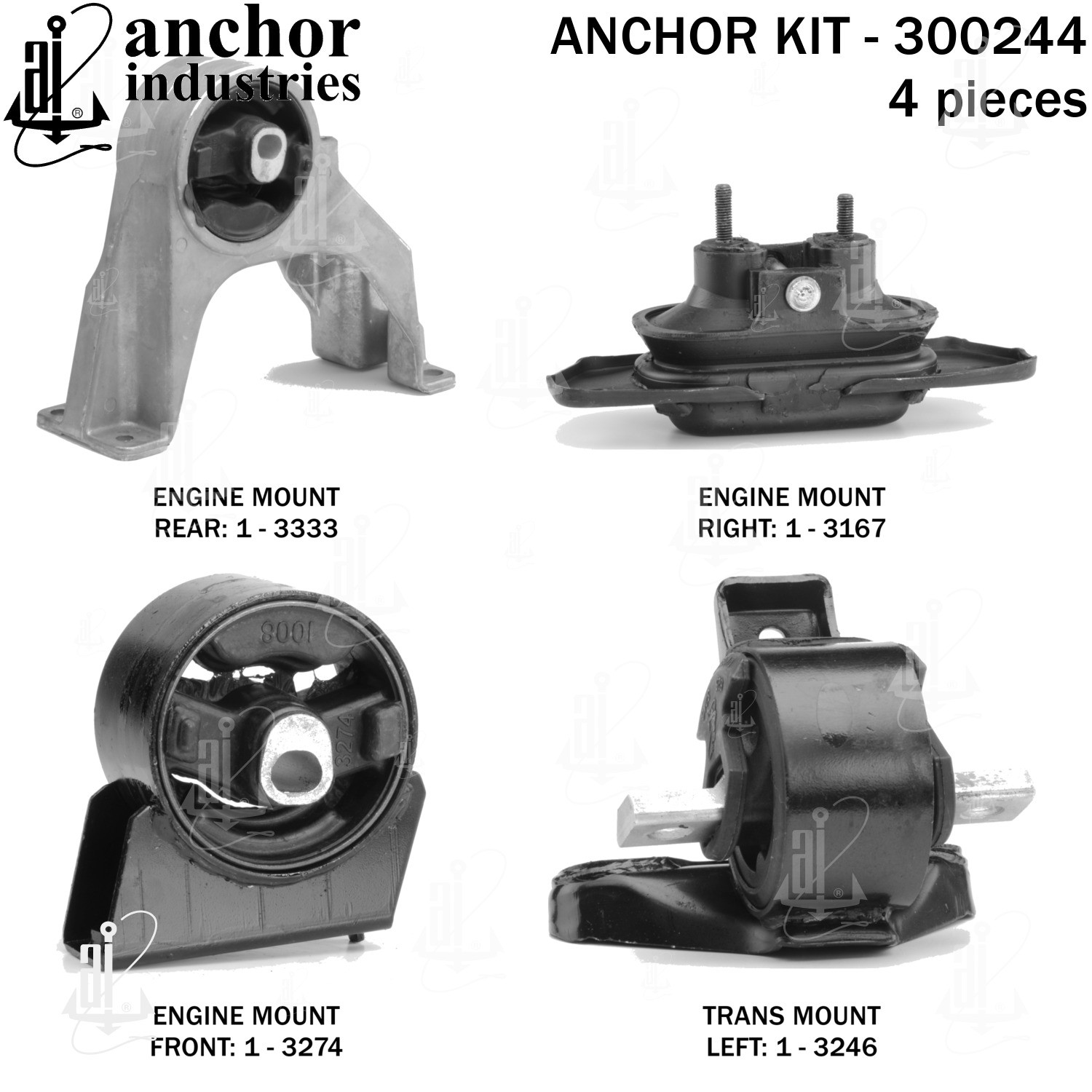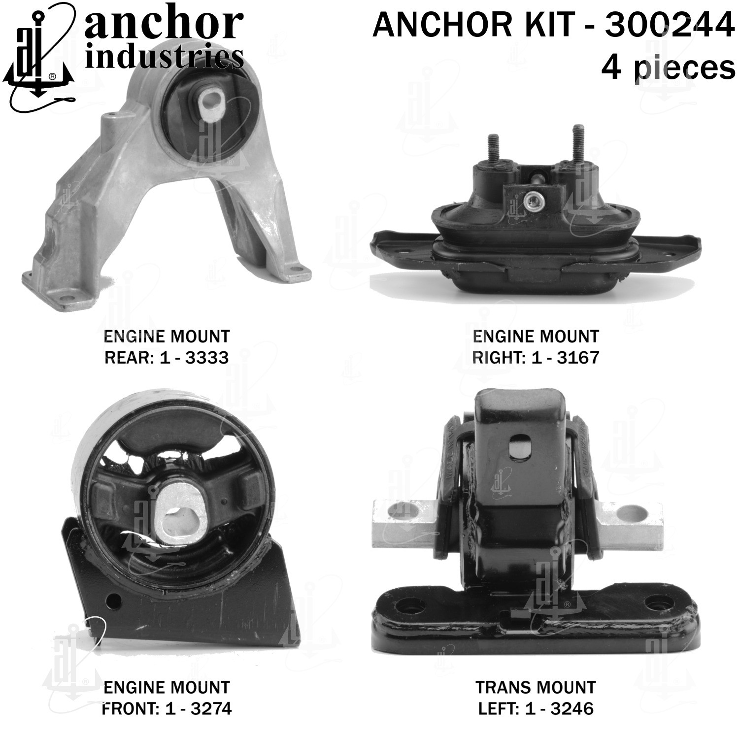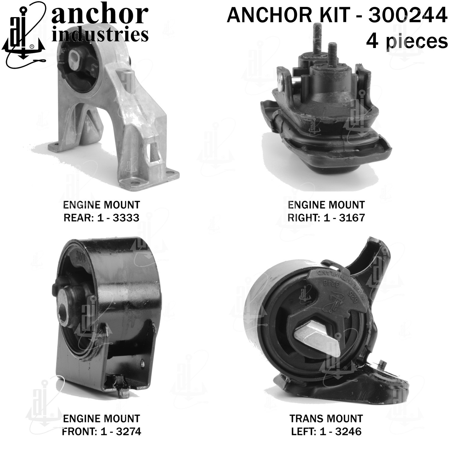 - Anchor 300244; ENGINE MNT KIT ; Each part of this kit is specifically engineered and manufactured to meet or exceed OE standards to ensure perfect fit and function. Natural and SBR rubber provide maximum life and performance. Steel fasteners are heat treated grade 5 bolts. A special bonding agent is used to ensure a rubber to metal bond. Rubber material is mixed to specific Durometer, hardness. 12 Month Warranty.