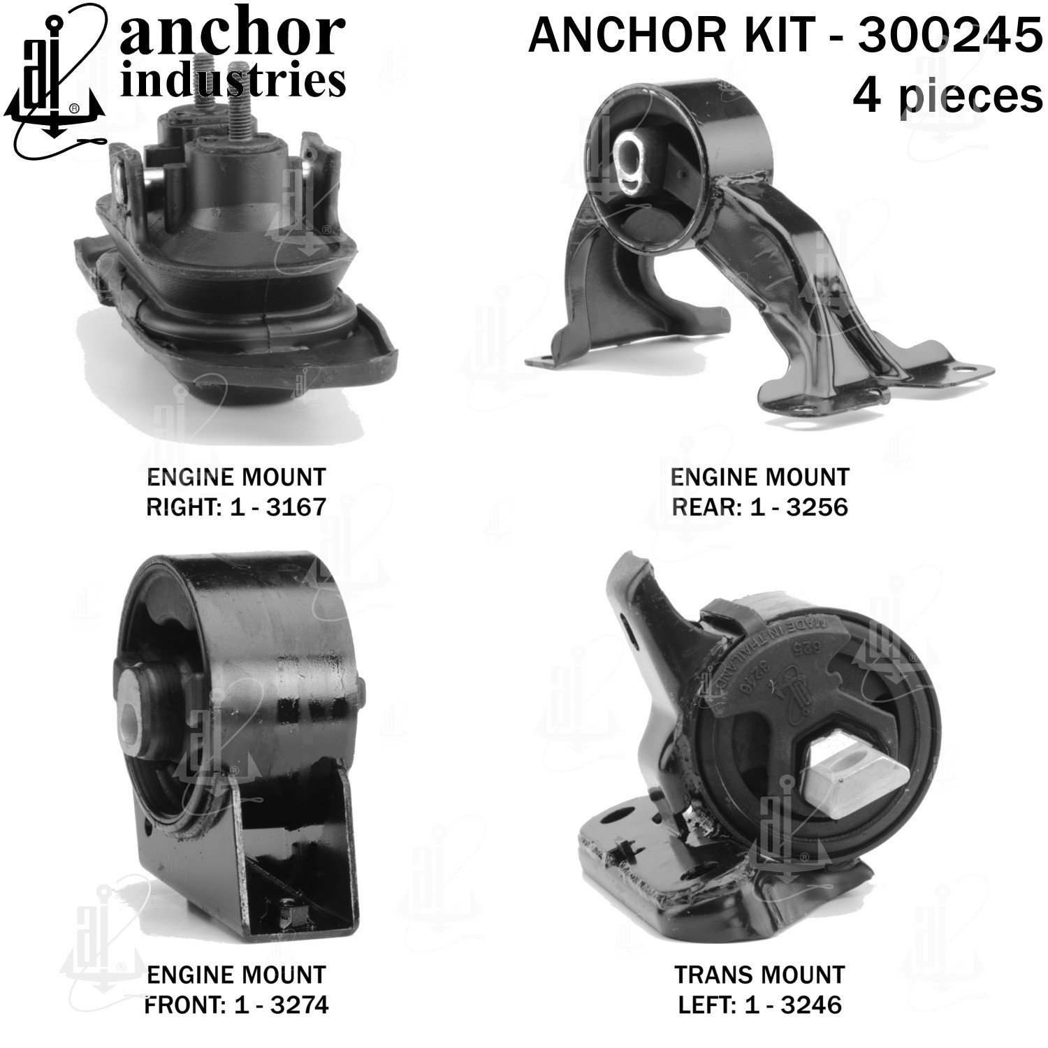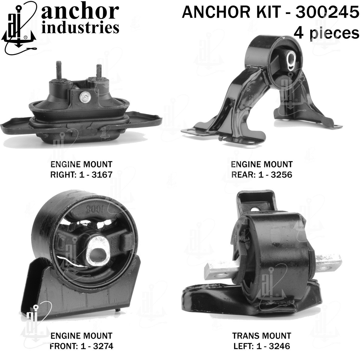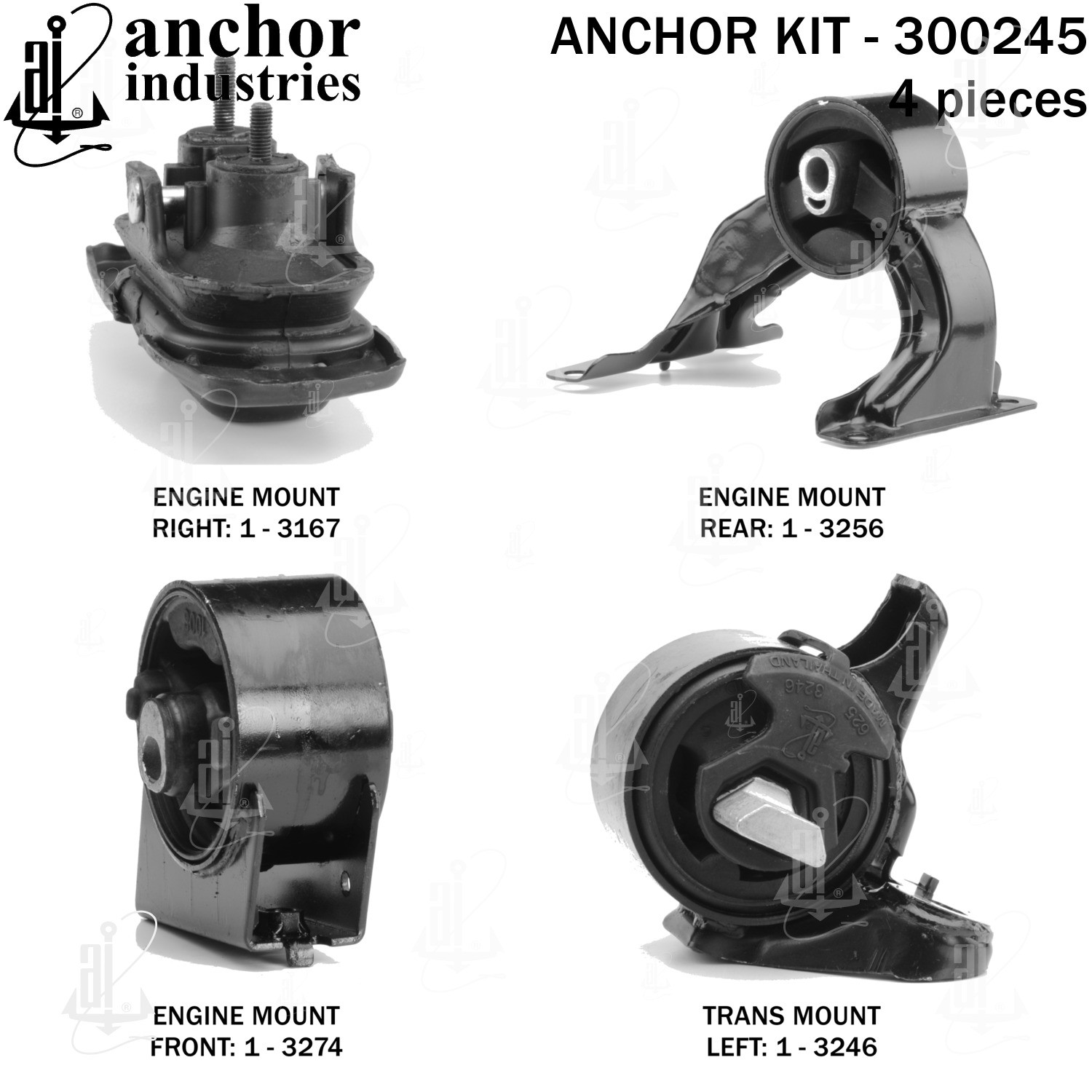 - Anchor 300245; ENGINE MNT KIT ; Each part of this kit is specifically engineered and manufactured to meet or exceed OE standards to ensure perfect fit and function. Natural and SBR rubber provide maximum life and performance. Steel fasteners are heat treated grade 5 bolts. A special bonding agent is used to ensure a rubber to metal bond. Rubber material is mixed to specific Durometer, hardness. 12 Month Warranty.