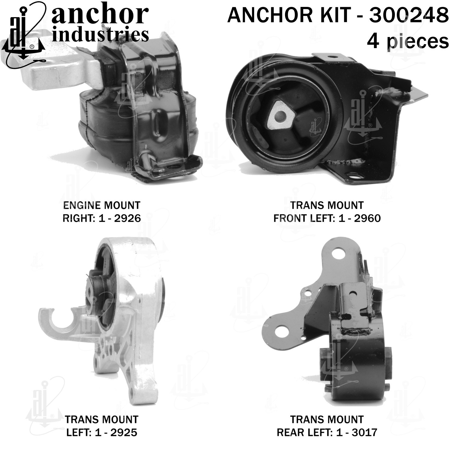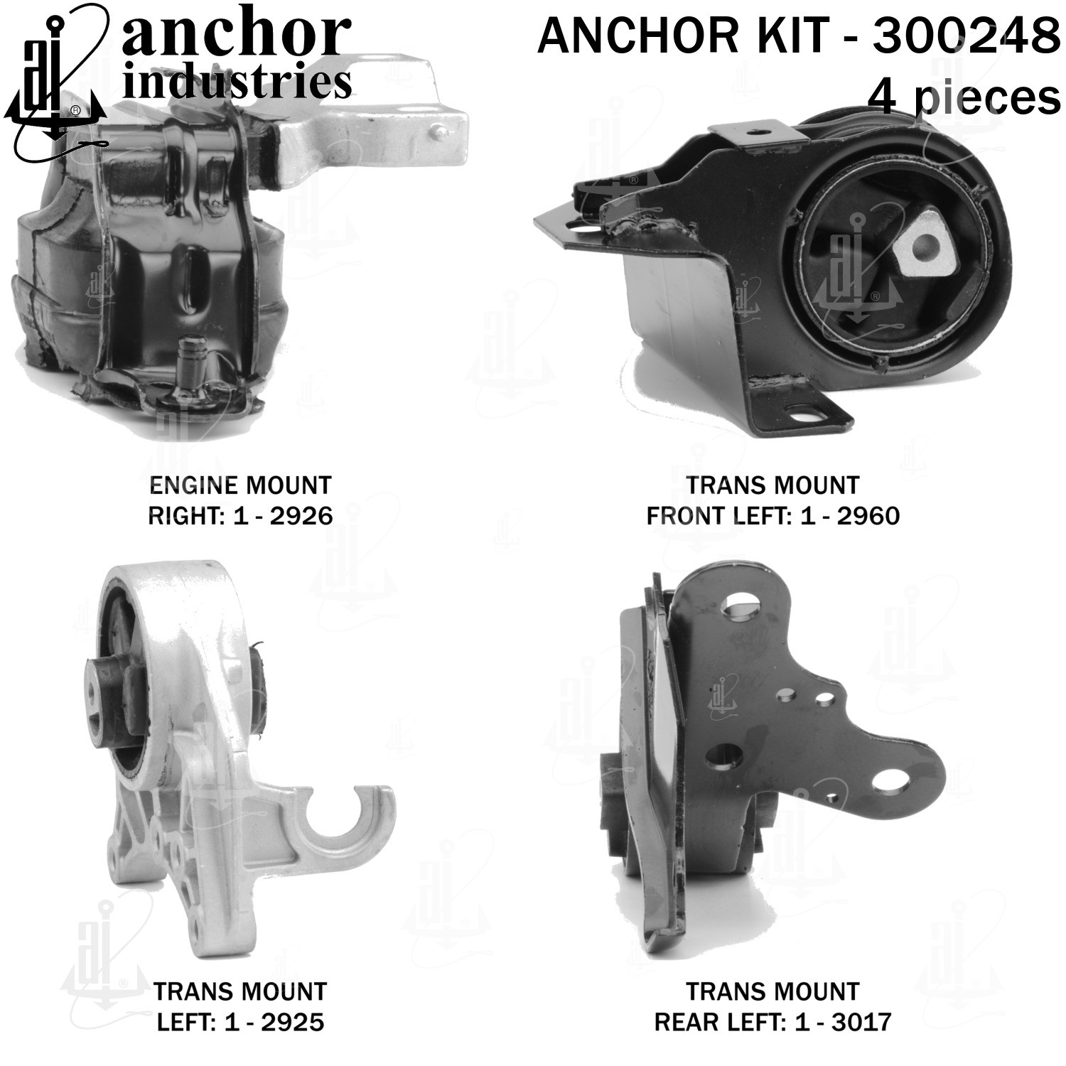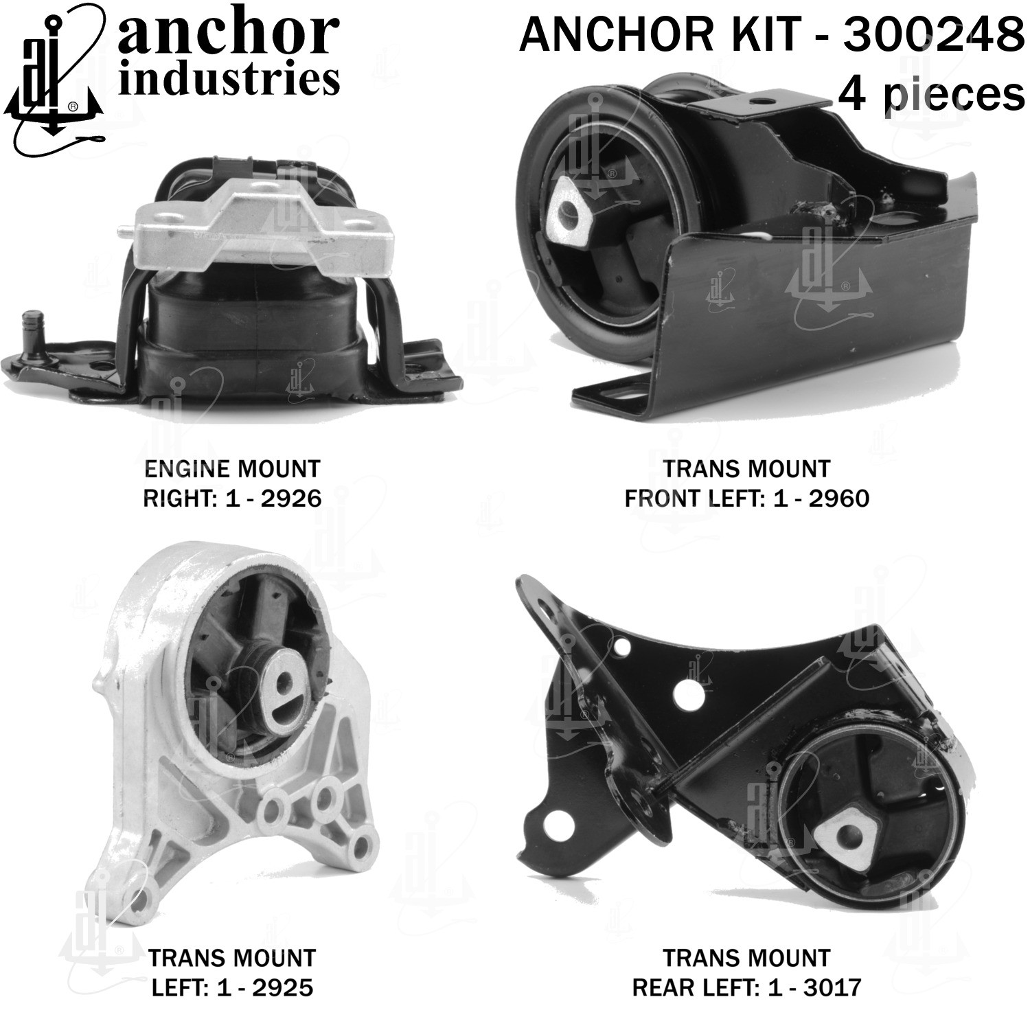 - Anchor 300248; ENGINE MNT KIT ; Each part of this kit is specifically engineered and manufactured to meet or exceed OE standards to ensure perfect fit and function. Natural and SBR rubber provide maximum life and performance. Steel fasteners are heat treated grade 5 bolts. A special bonding agent is used to ensure a rubber to metal bond. Rubber material is mixed to specific Durometer, hardness. 12 Month Warranty.