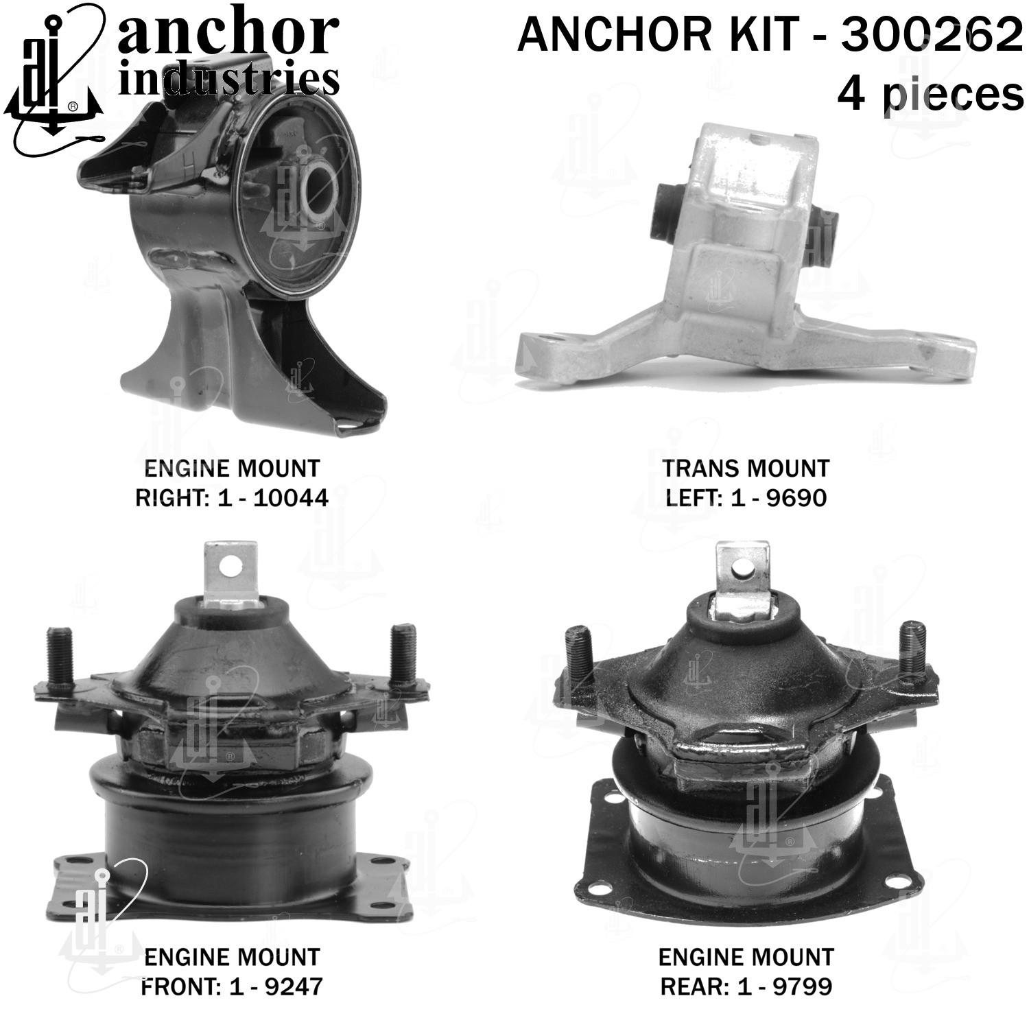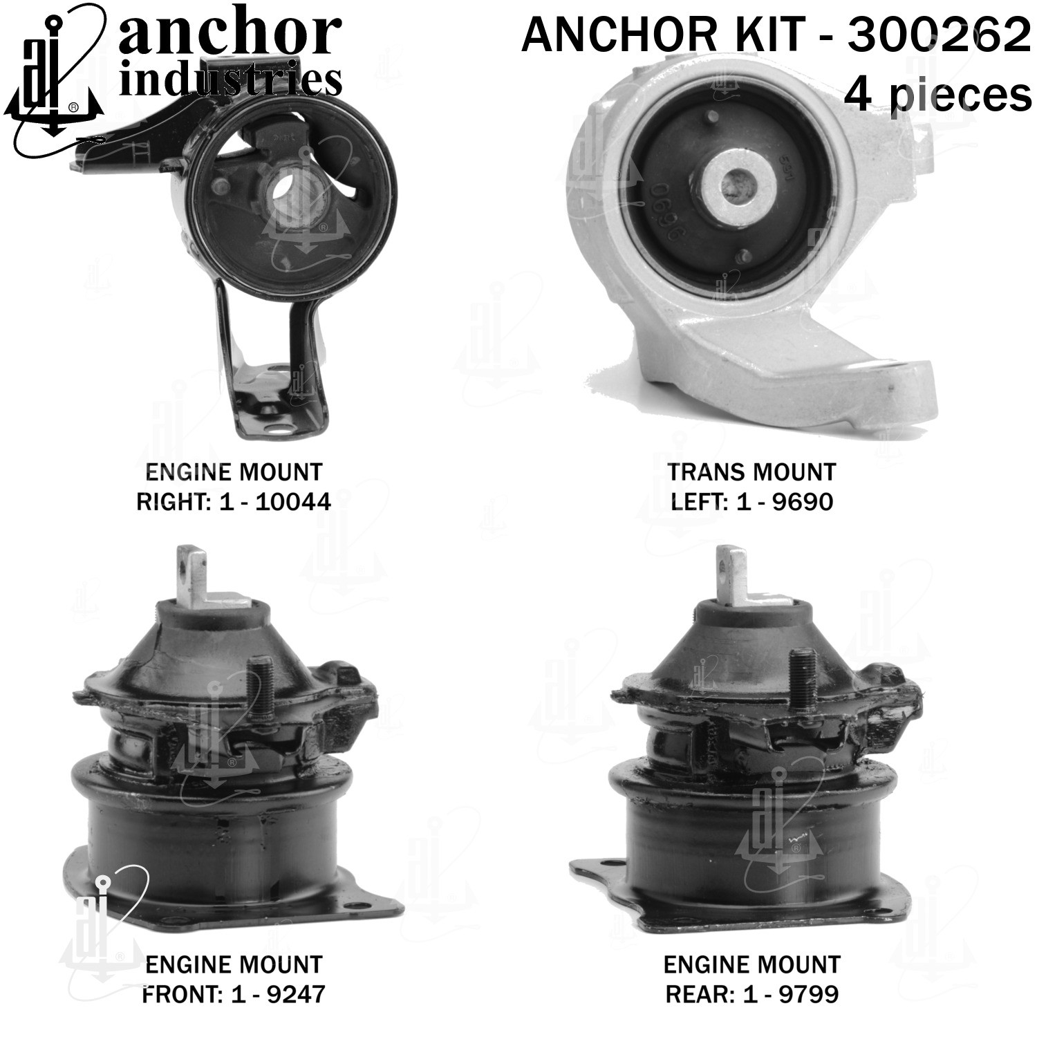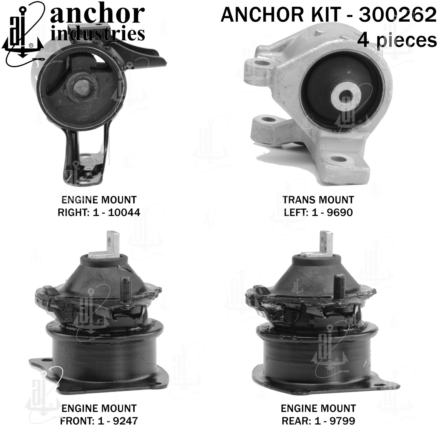 - Anchor 300262; ENGINE MNT KIT ; Each part of this kit is specifically engineered and manufactured to meet or exceed OE standards to ensure perfect fit and function. Natural and SBR rubber provide maximum life and performance. Steel fasteners are heat treated grade 5 bolts. A special bonding agent is used to ensure a rubber to metal bond. Rubber material is mixed to specific Durometer, hardness. 12 Month Warranty.