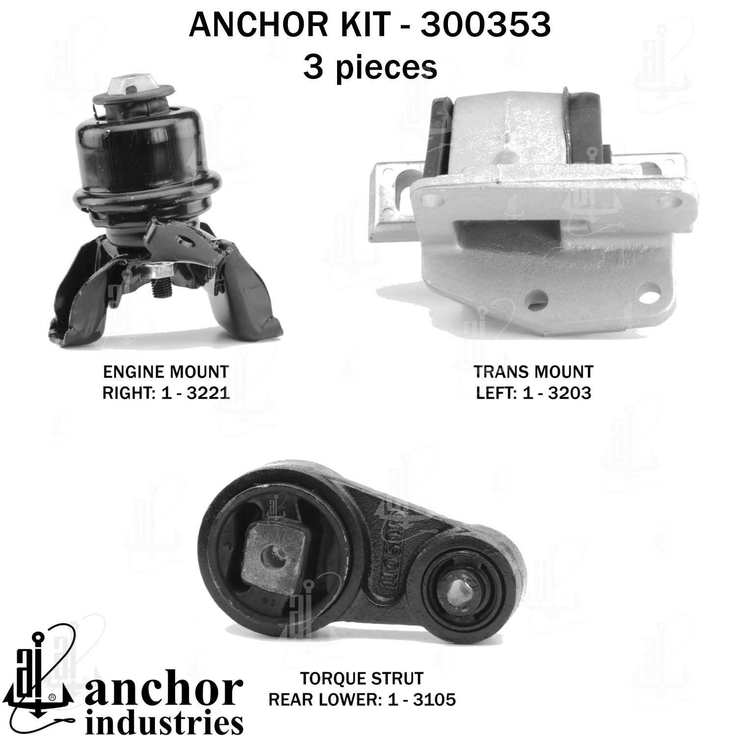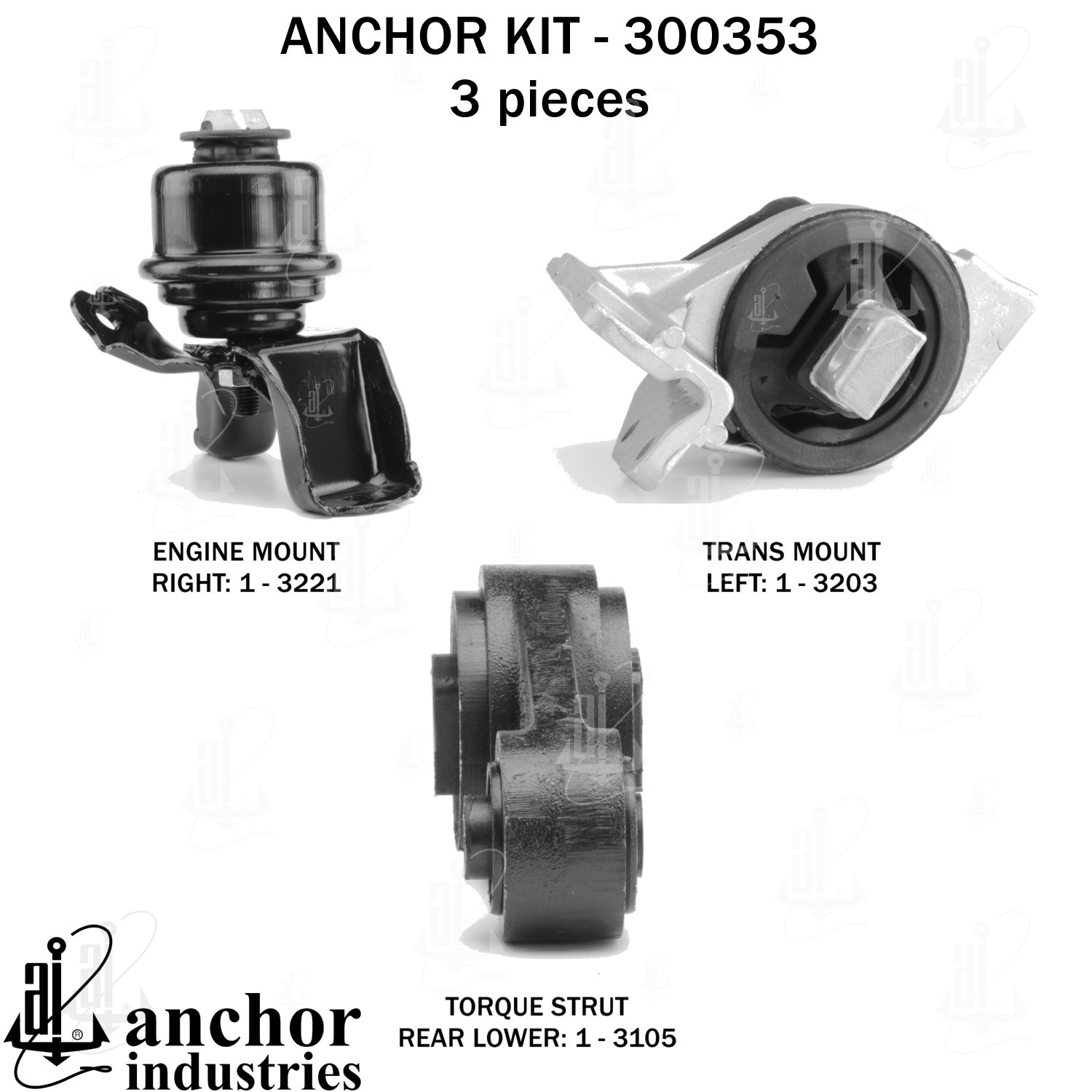 - Anchor 300353; ENGINE MNT KIT ; Each part of this kit is specifically engineered and manufactured to meet or exceed OE standards to ensure perfect fit and function. Natural and SBR rubber provide maximum life and performance. Steel fasteners are heat treated grade 5 bolts. A special bonding agent is used to ensure a rubber to metal bond. Rubber material is mixed to specific Durometer, hardness. 12 Month Warranty.