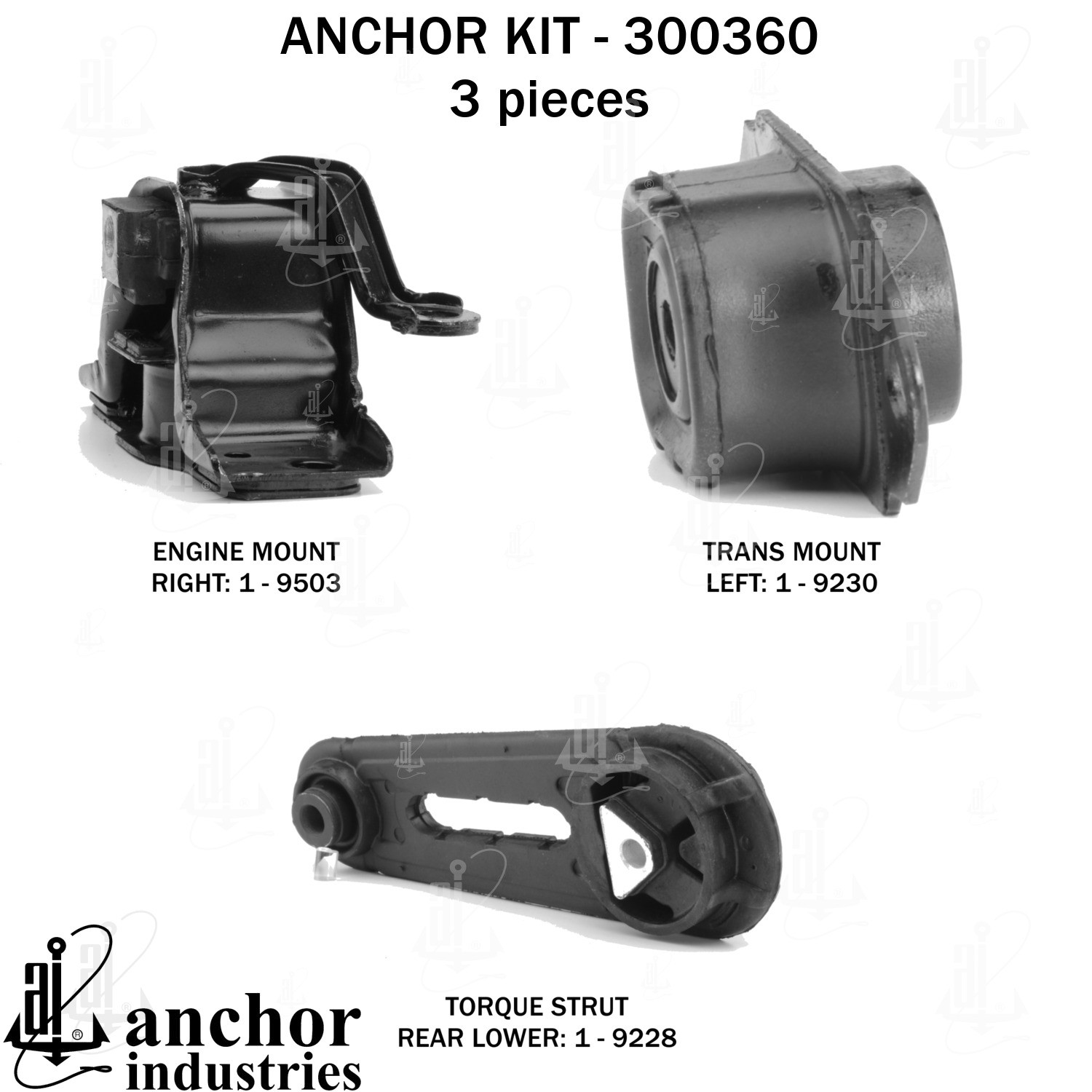 | KIT | 1-9503 engine mount right / 1-9230 trans mount left / 1-9228 torque strut rear lower |