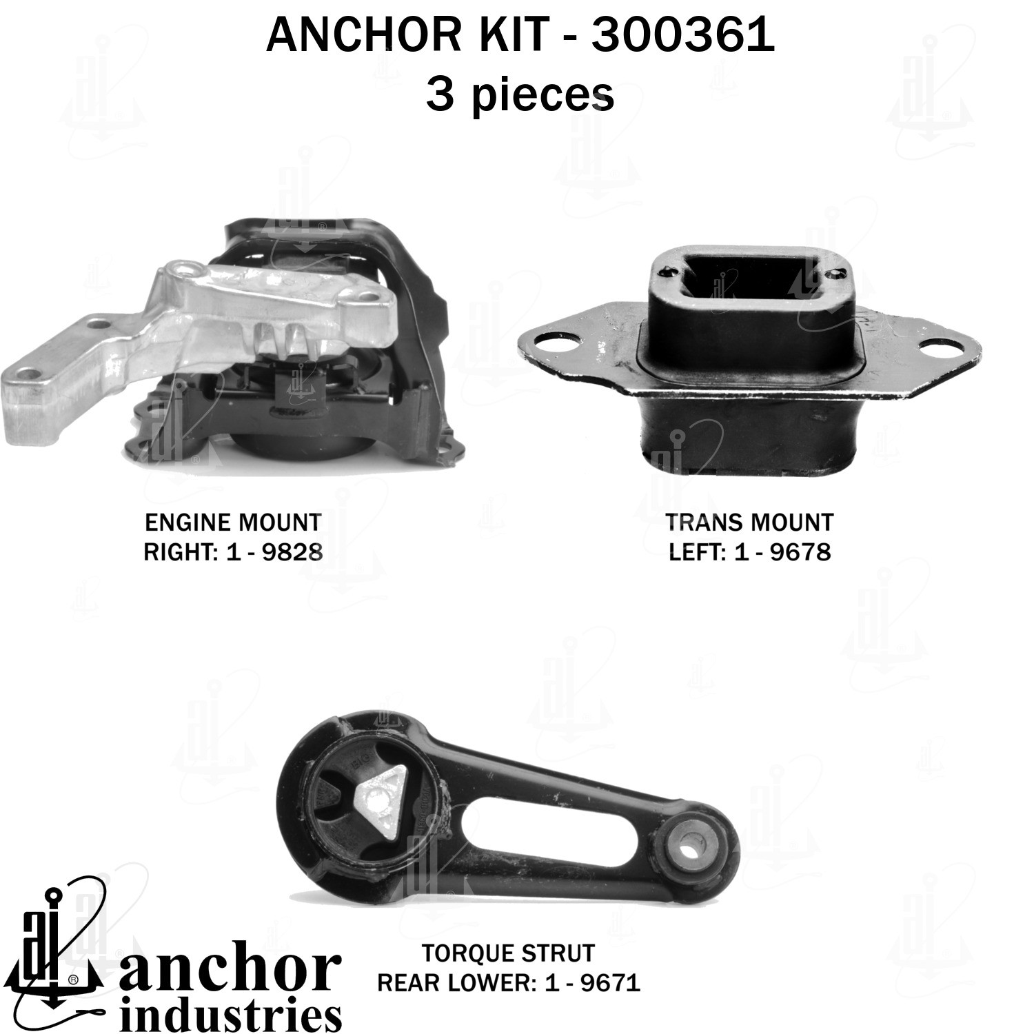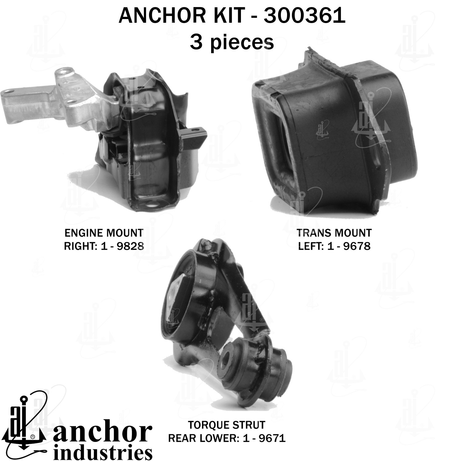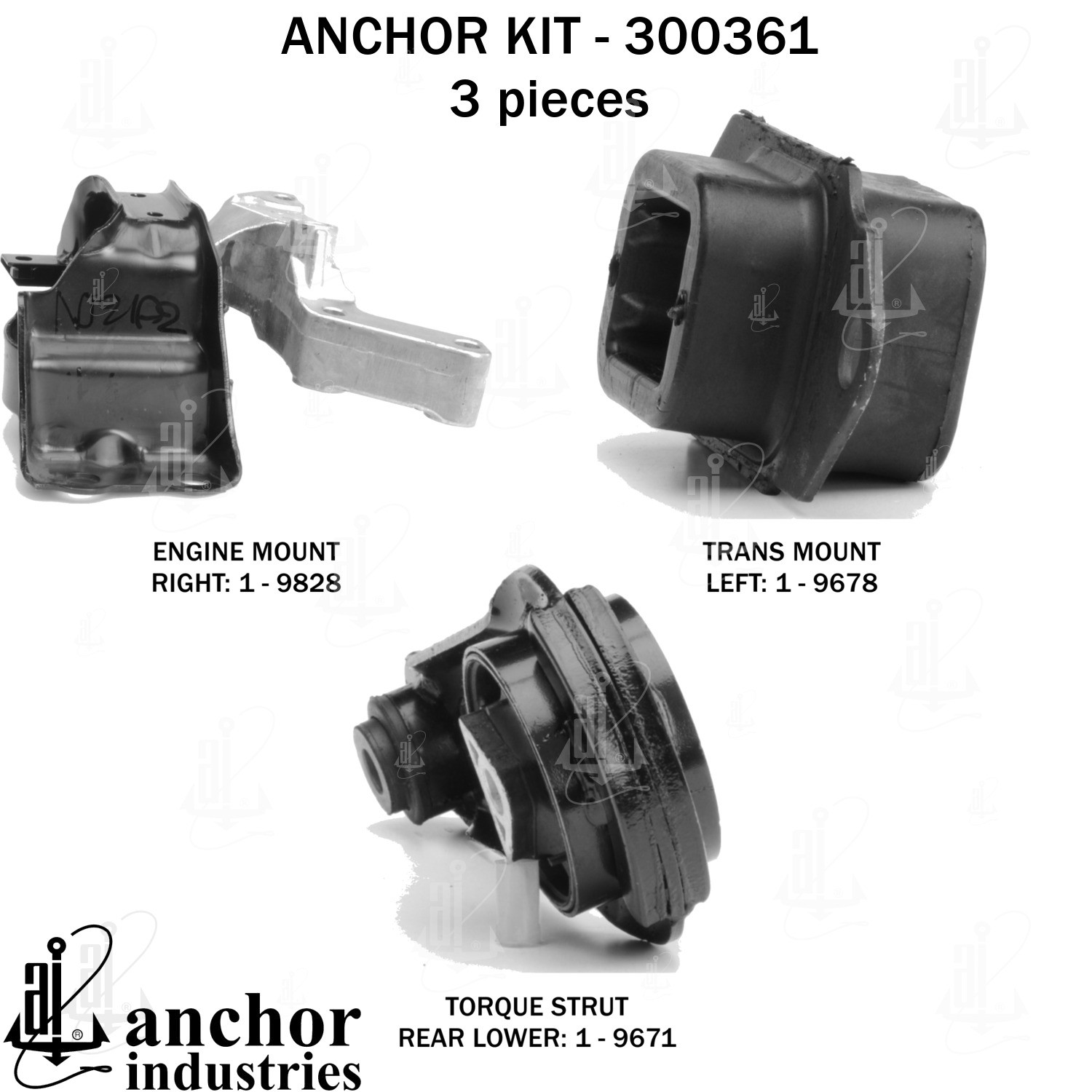 - Anchor 300361; ENGINE MNT KIT ; Each part of this kit is specifically engineered and manufactured to meet or exceed OE standards to ensure perfect fit and function. Natural and SBR rubber provide maximum life and performance. Steel fasteners are heat treated grade 5 bolts. A special bonding agent is used to ensure a rubber to metal bond. Rubber material is mixed to specific Durometer, hardness. 12 Month Warranty.