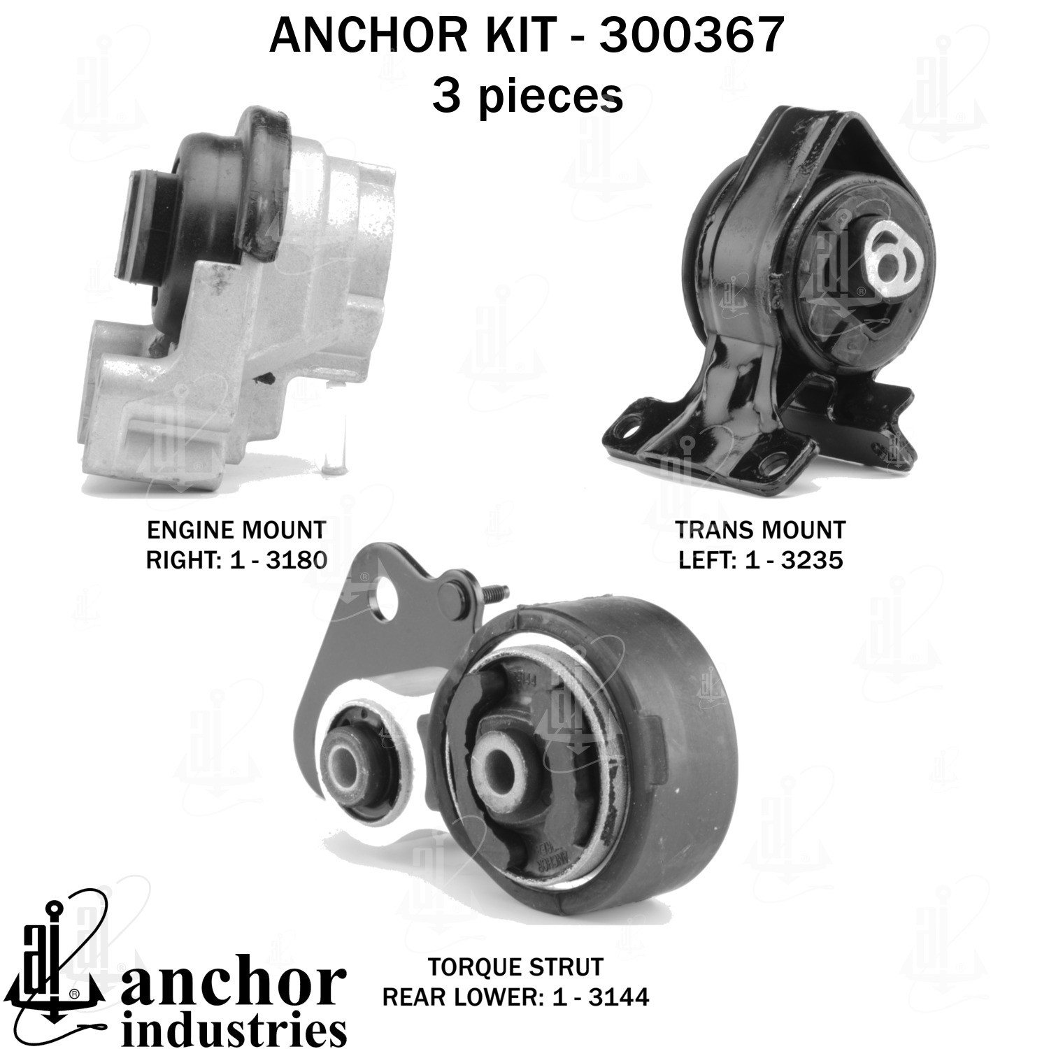 - Anchor 300367; ENGINE MNT KIT ; Each part of this kit is specifically engineered and manufactured to meet or exceed OE standards to ensure perfect fit and function. Natural and SBR rubber provide maximum life and performance. Steel fasteners are heat treated grade 5 bolts. A special bonding agent is used to ensure a rubber to metal bond. Rubber material is mixed to specific Durometer, hardness. 12 Month Warranty.