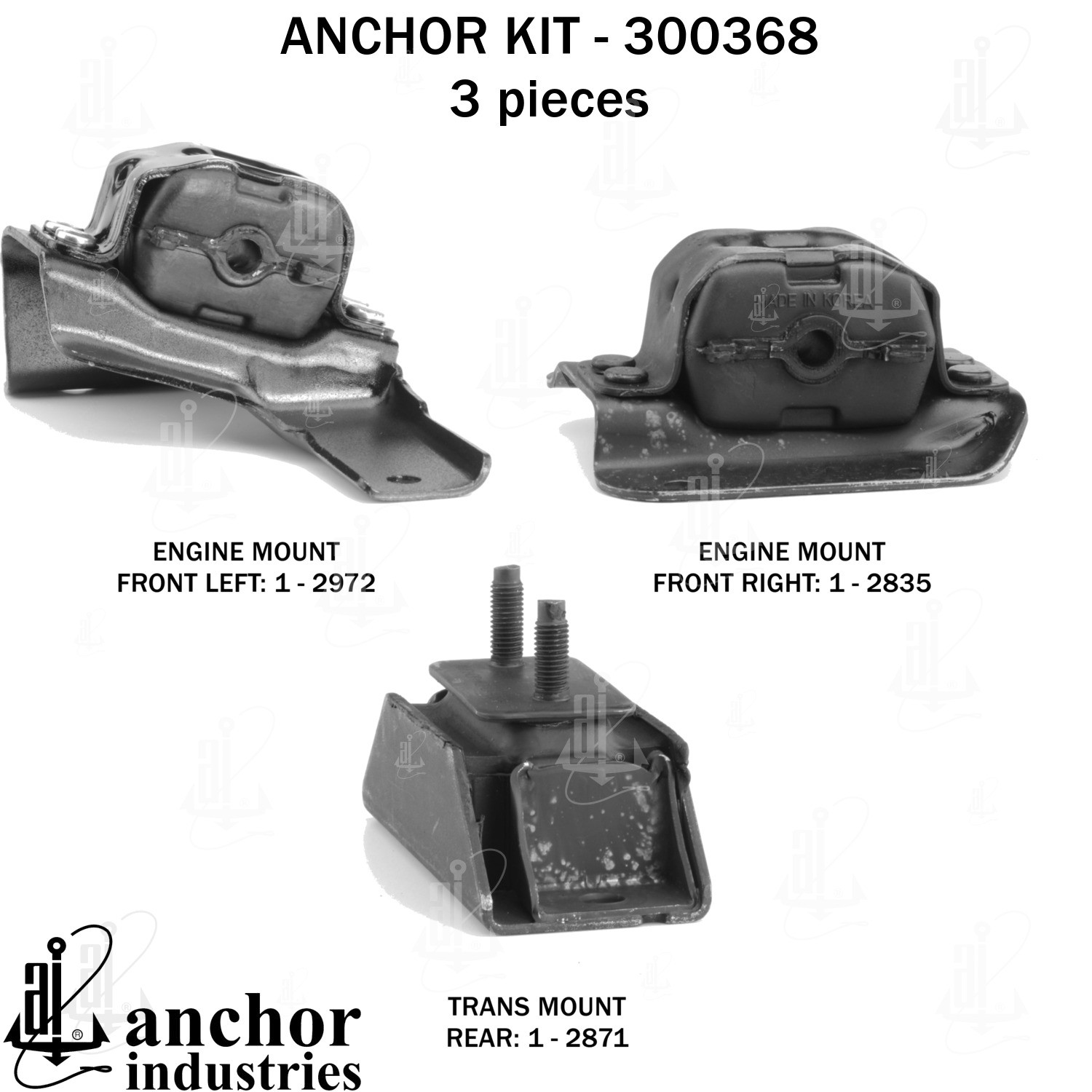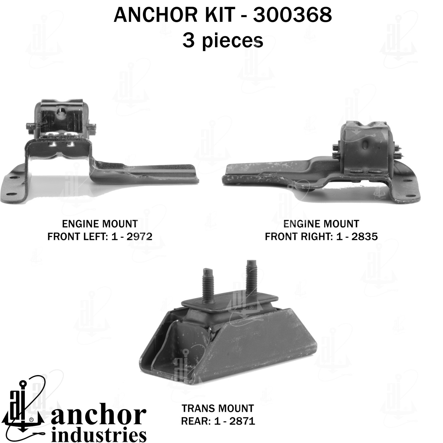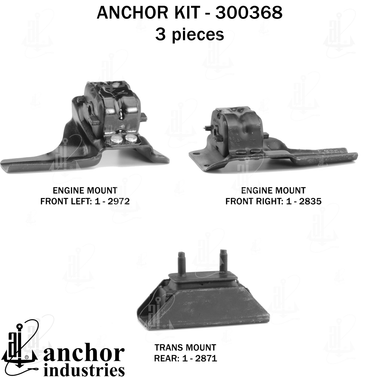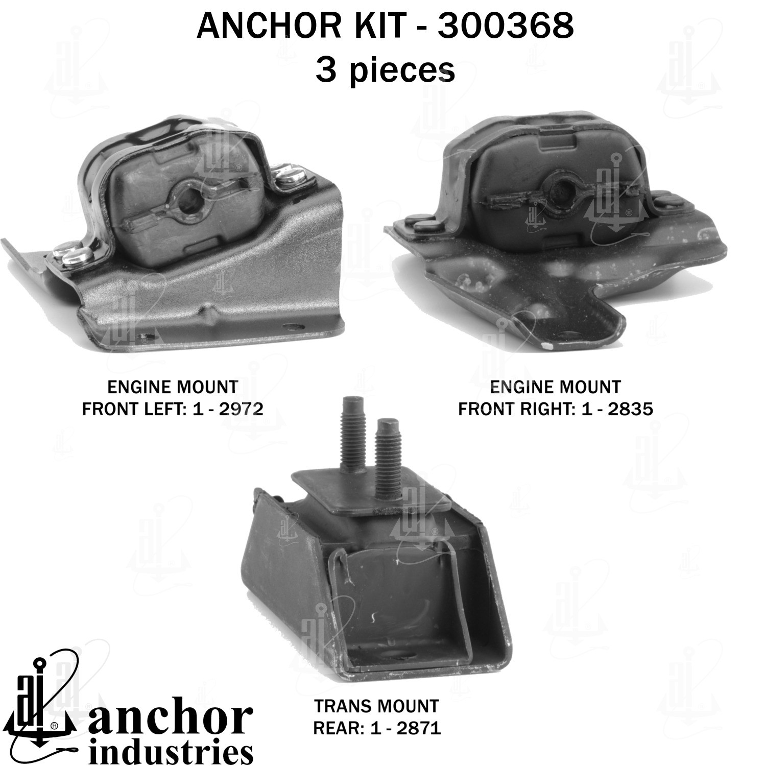 - Anchor 300368; ENGINE MNT KIT ; Each part of this kit is specifically engineered and manufactured to meet or exceed OE standards to ensure perfect fit and function. Natural and SBR rubber provide maximum life and performance. Steel fasteners are heat treated grade 5 bolts. A special bonding agent is used to ensure a rubber to metal bond. Rubber material is mixed to specific Durometer, hardness. 12 Month Warranty.