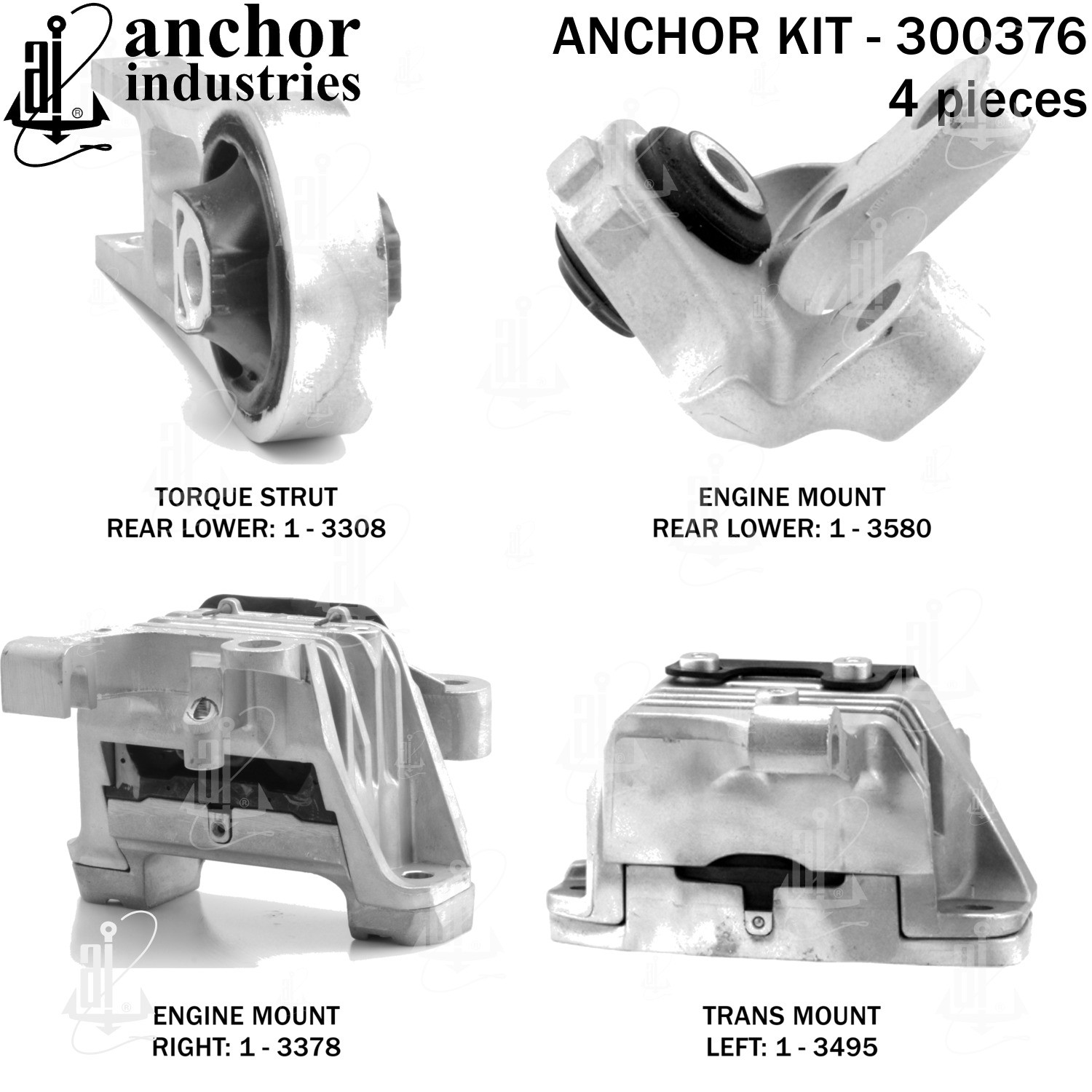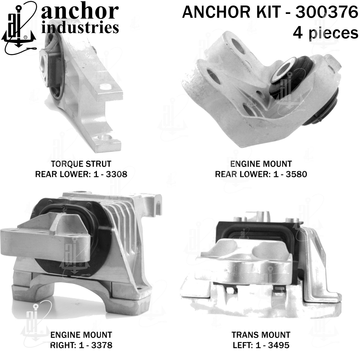 - Anchor 300376; ENGINE MNT KIT ; Each part of this kit is specifically engineered and manufactured to meet or exceed OE standards to ensure perfect fit and function. Natural and SBR rubber provide maximum life and performance. Steel fasteners are heat treated grade 5 bolts. A special bonding agent is used to ensure a rubber to metal bond. Rubber material is mixed to specific Durometer, hardness. 12 Month Warranty.