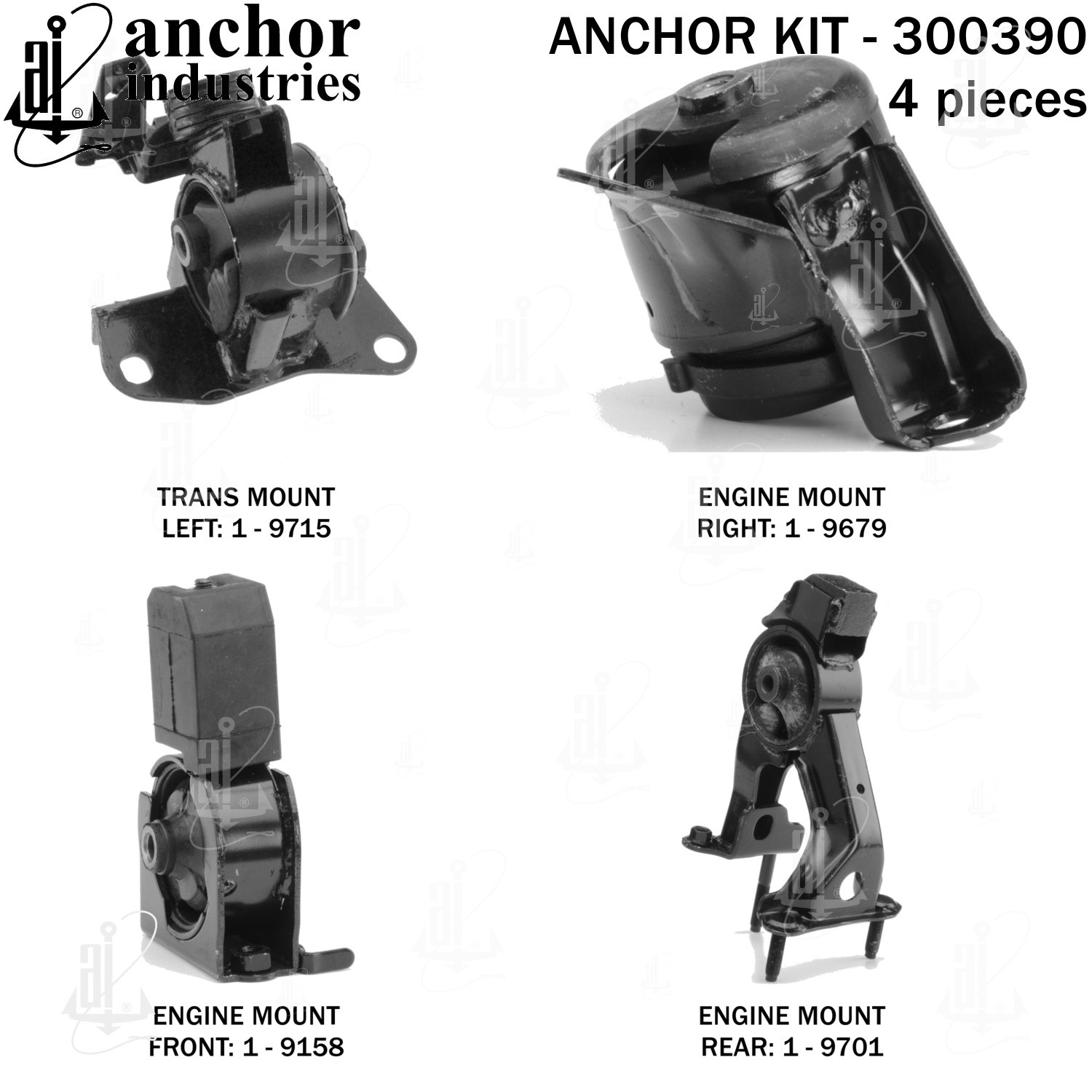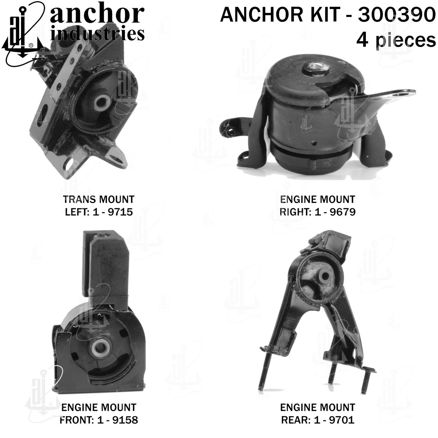 - Anchor 300390; ENGINE MNT KIT ; Each part of this kit is specifically engineered and manufactured to meet or exceed OE standards to ensure perfect fit and function. Natural and SBR rubber provide maximum life and performance. Steel fasteners are heat treated grade 5 bolts. A special bonding agent is used to ensure a rubber to metal bond. Rubber material is mixed to specific Durometer, hardness. 12 Month Warranty.