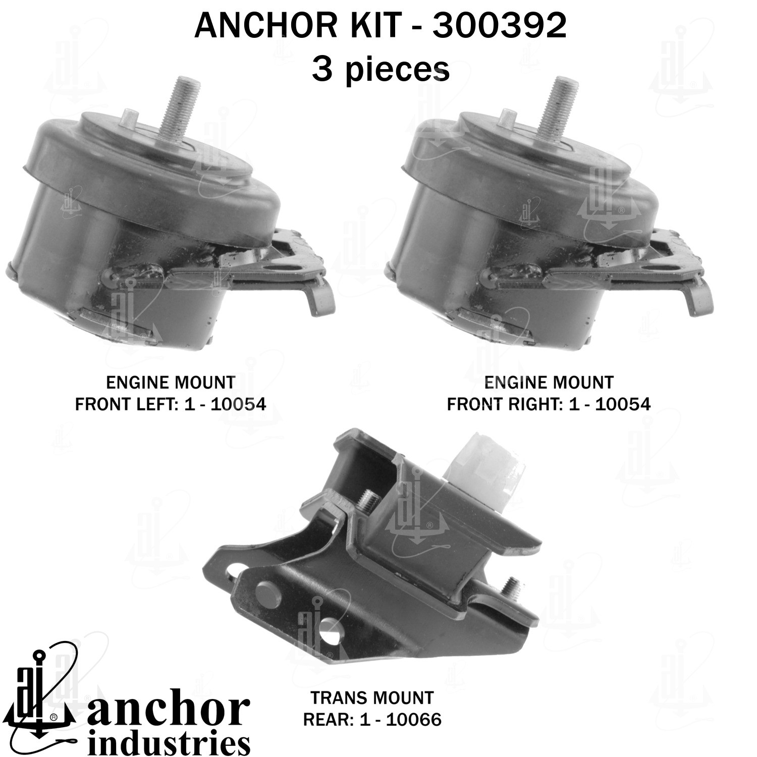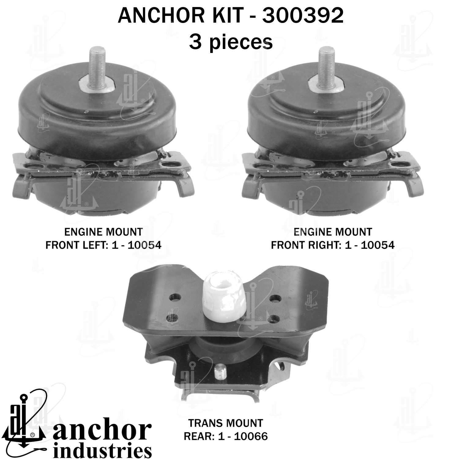- Anchor 300392; ENGINE MNT KIT ; Each part of this kit is specifically engineered and manufactured to meet or exceed OE standards to ensure perfect fit and function. Natural and SBR rubber provide maximum life and performance. Steel fasteners are heat treated grade 5 bolts. A special bonding agent is used to ensure a rubber to metal bond. Rubber material is mixed to specific Durometer, hardness. 12 Month Warranty.