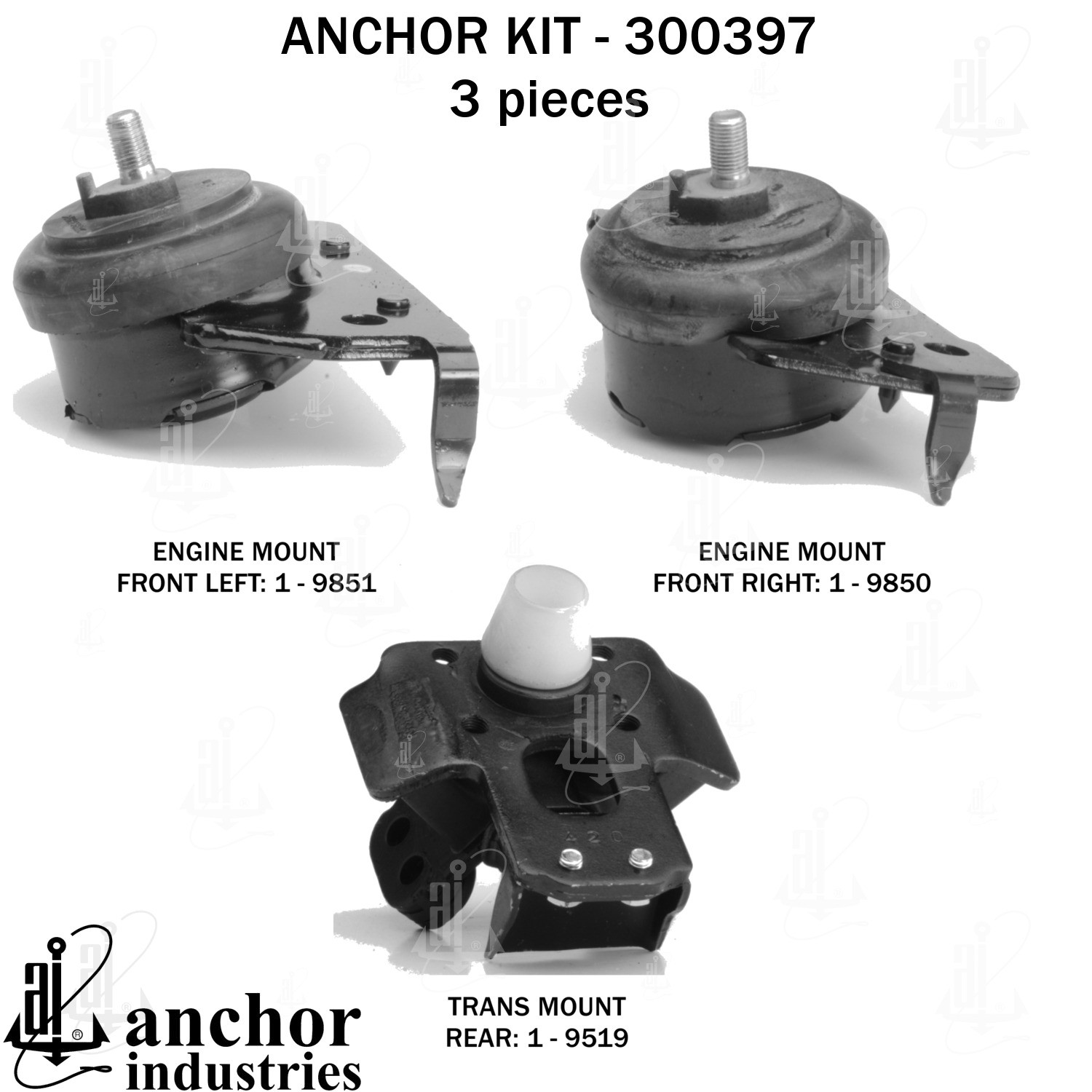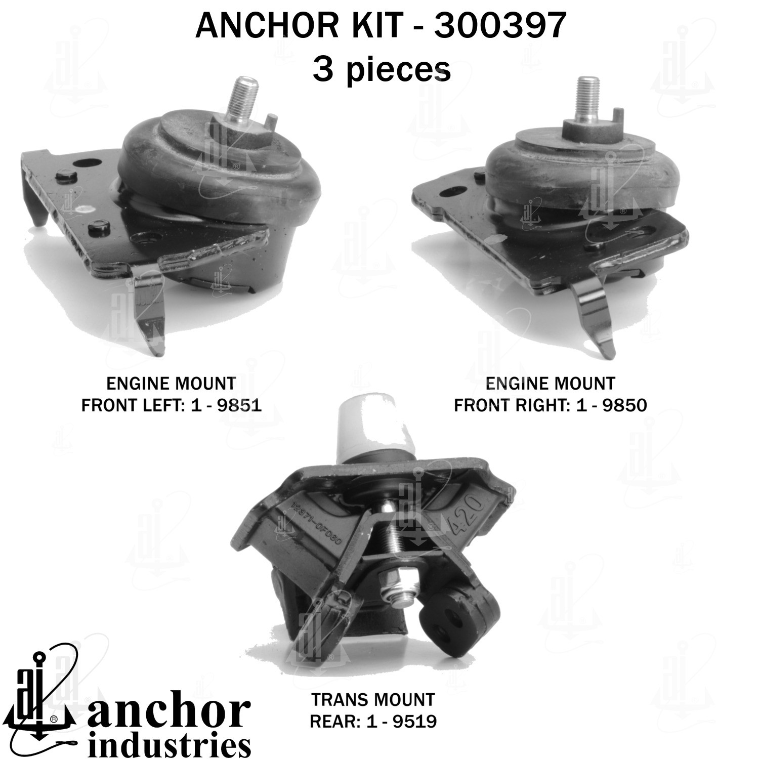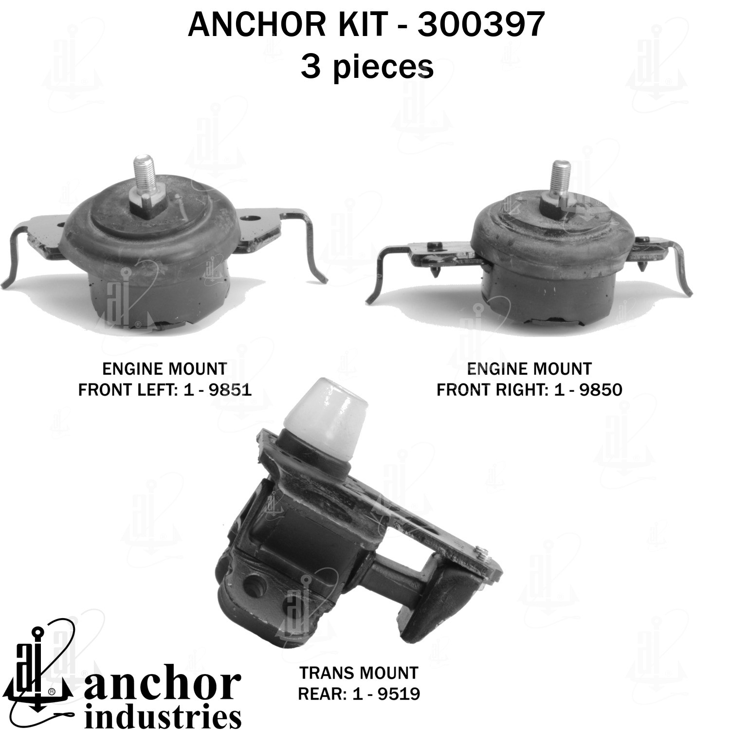 - Anchor 300397; ENGINE MNT KIT ; Each part of this kit is specifically engineered and manufactured to meet or exceed OE standards to ensure perfect fit and function. Natural and SBR rubber provide maximum life and performance. Steel fasteners are heat treated grade 5 bolts. A special bonding agent is used to ensure a rubber to metal bond. Rubber material is mixed to specific Durometer, hardness. 12 Month Warranty.