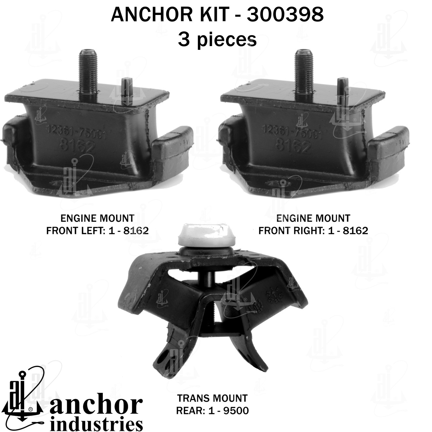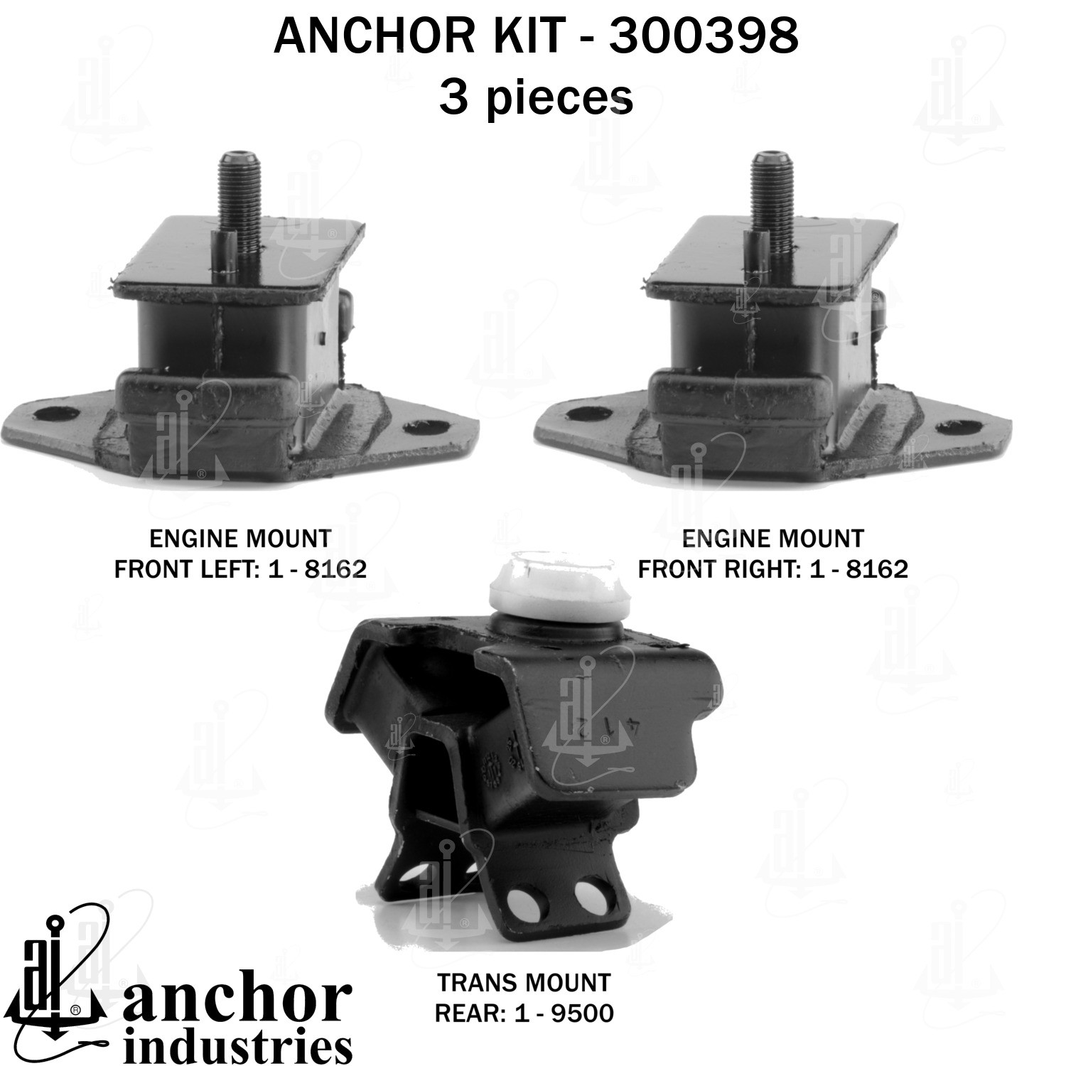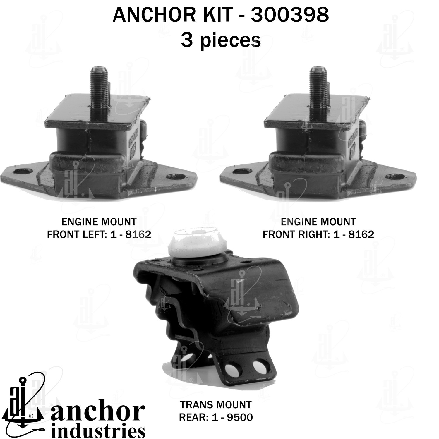 - Anchor 300398; ENGINE MNT KIT ; Each part of this kit is specifically engineered and manufactured to meet or exceed OE standards to ensure perfect fit and function. Natural and SBR rubber provide maximum life and performance. Steel fasteners are heat treated grade 5 bolts. A special bonding agent is used to ensure a rubber to metal bond. Rubber material is mixed to specific Durometer, hardness. 12 Month Warranty.