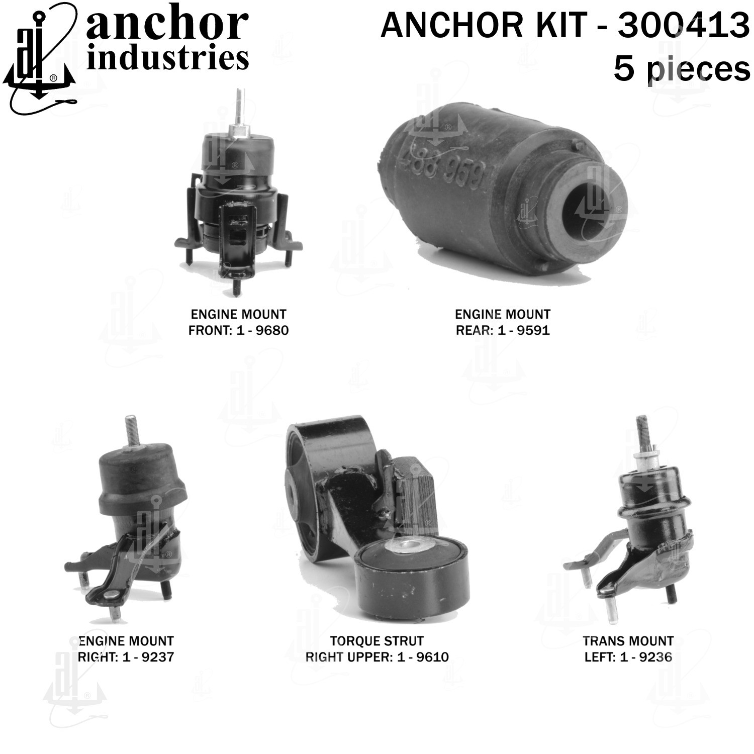 - Anchor 300413; ENGINE MNT KIT ; Each part of this kit is specifically engineered and manufactured to meet or exceed OE standards to ensure perfect fit and function. Natural and SBR rubber provide maximum life and performance. Steel fasteners are heat treated grade 5 bolts. A special bonding agent is used to ensure a rubber to metal bond. Rubber material is mixed to specific Durometer, hardness. 12 Month Warranty.