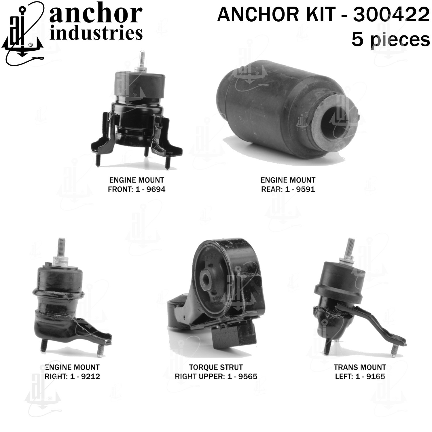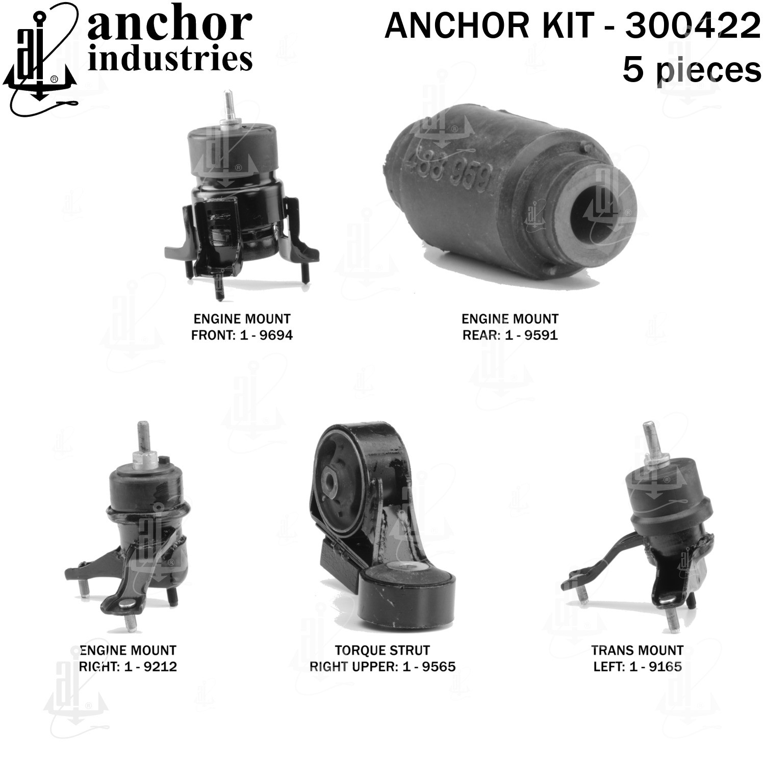 - Anchor 300422; ENGINE MNT KIT ; Each part of this kit is specifically engineered and manufactured to meet or exceed OE standards to ensure perfect fit and function. Natural and SBR rubber provide maximum life and performance. Steel fasteners are heat treated grade 5 bolts. A special bonding agent is used to ensure a rubber to metal bond. Rubber material is mixed to specific Durometer, hardness. 12 Month Warranty.