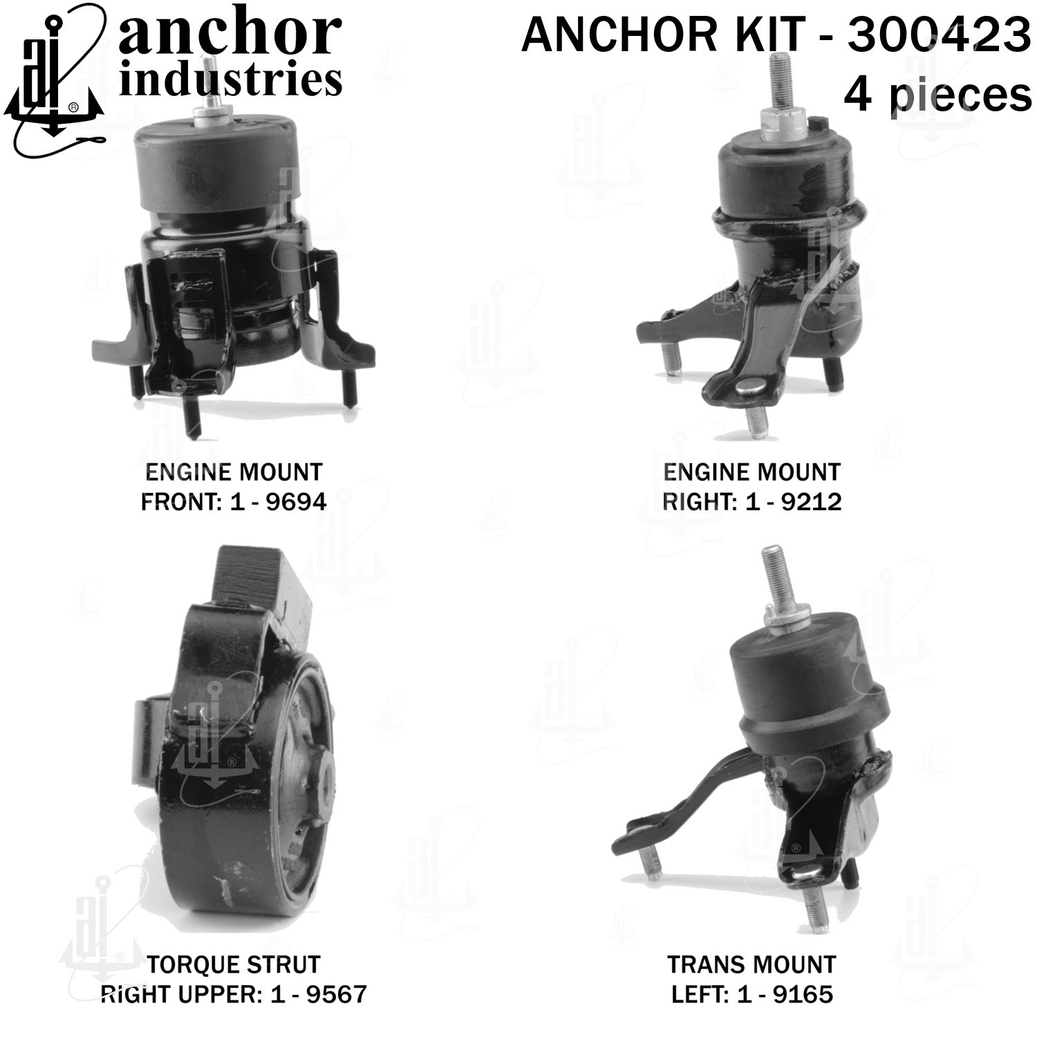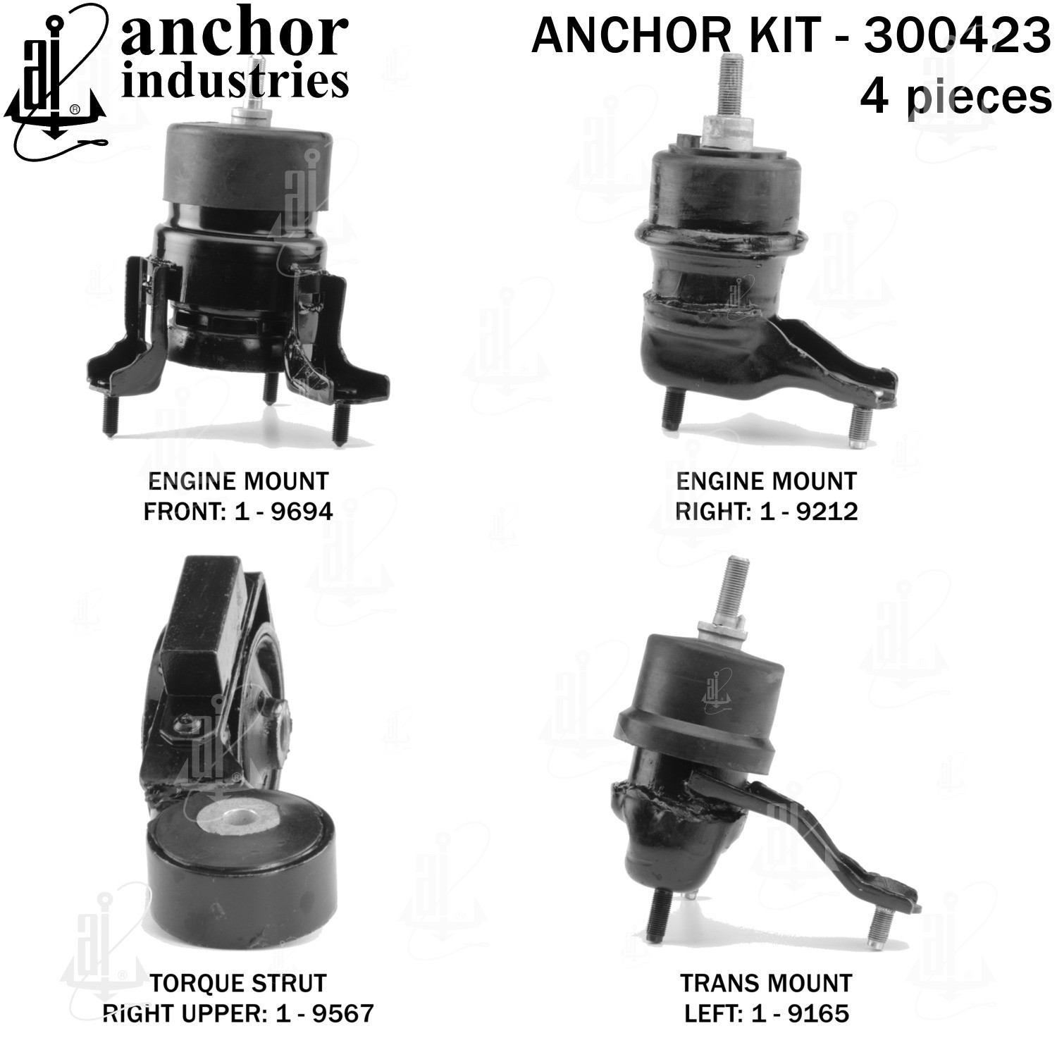 - Anchor 300423; ENGINE MNT KIT ; Each part of this kit is specifically engineered and manufactured to meet or exceed OE standards to ensure perfect fit and function. Natural and SBR rubber provide maximum life and performance. Steel fasteners are heat treated grade 5 bolts. A special bonding agent is used to ensure a rubber to metal bond. Rubber material is mixed to specific Durometer, hardness. 12 Month Warranty.