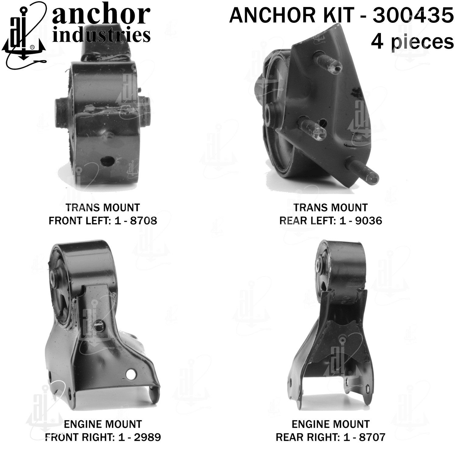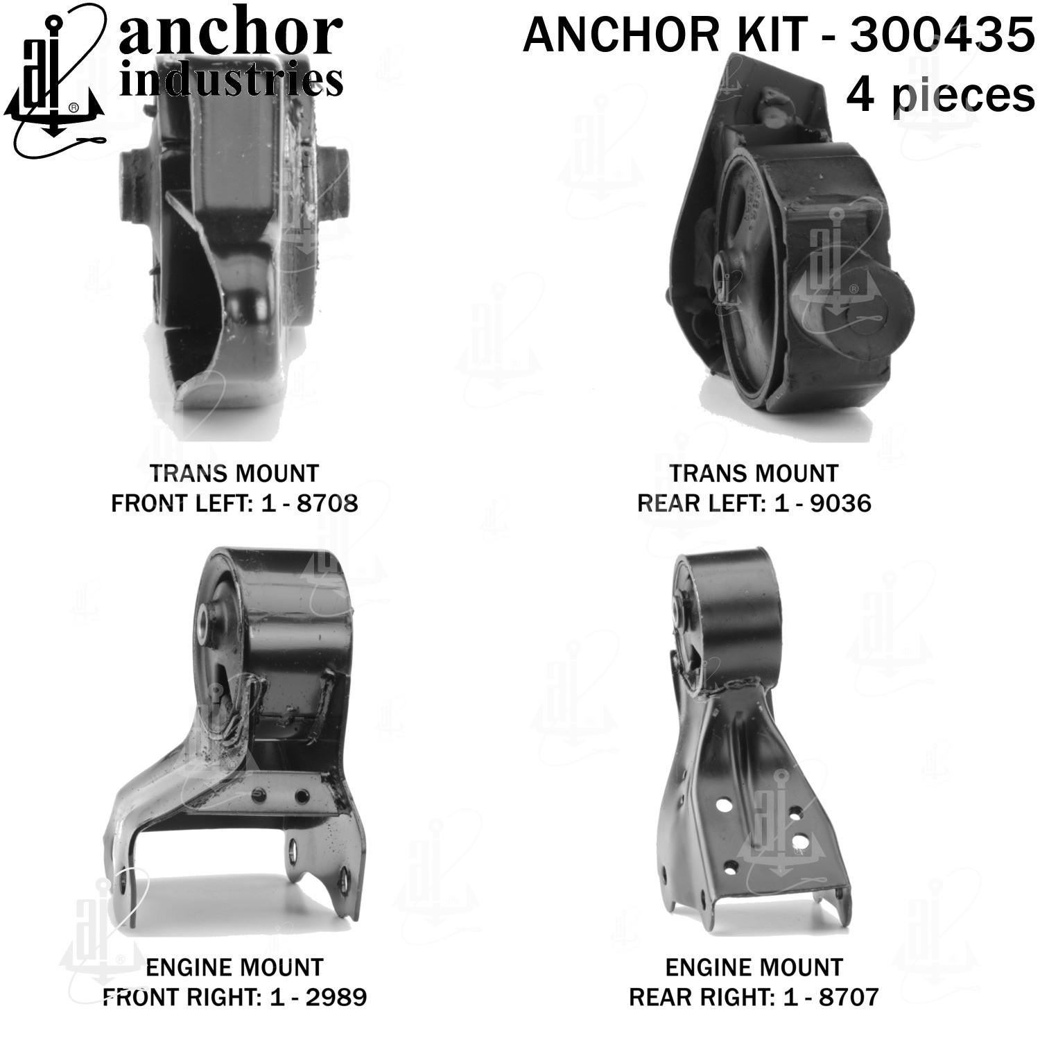 - Anchor 300435; ENGINE MNT KIT ; Each part of this kit is specifically engineered and manufactured to meet or exceed OE standards to ensure perfect fit and function. Natural and SBR rubber provide maximum life and performance. Steel fasteners are heat treated grade 5 bolts. A special bonding agent is used to ensure a rubber to metal bond. Rubber material is mixed to specific Durometer, hardness. 12 Month Warranty.