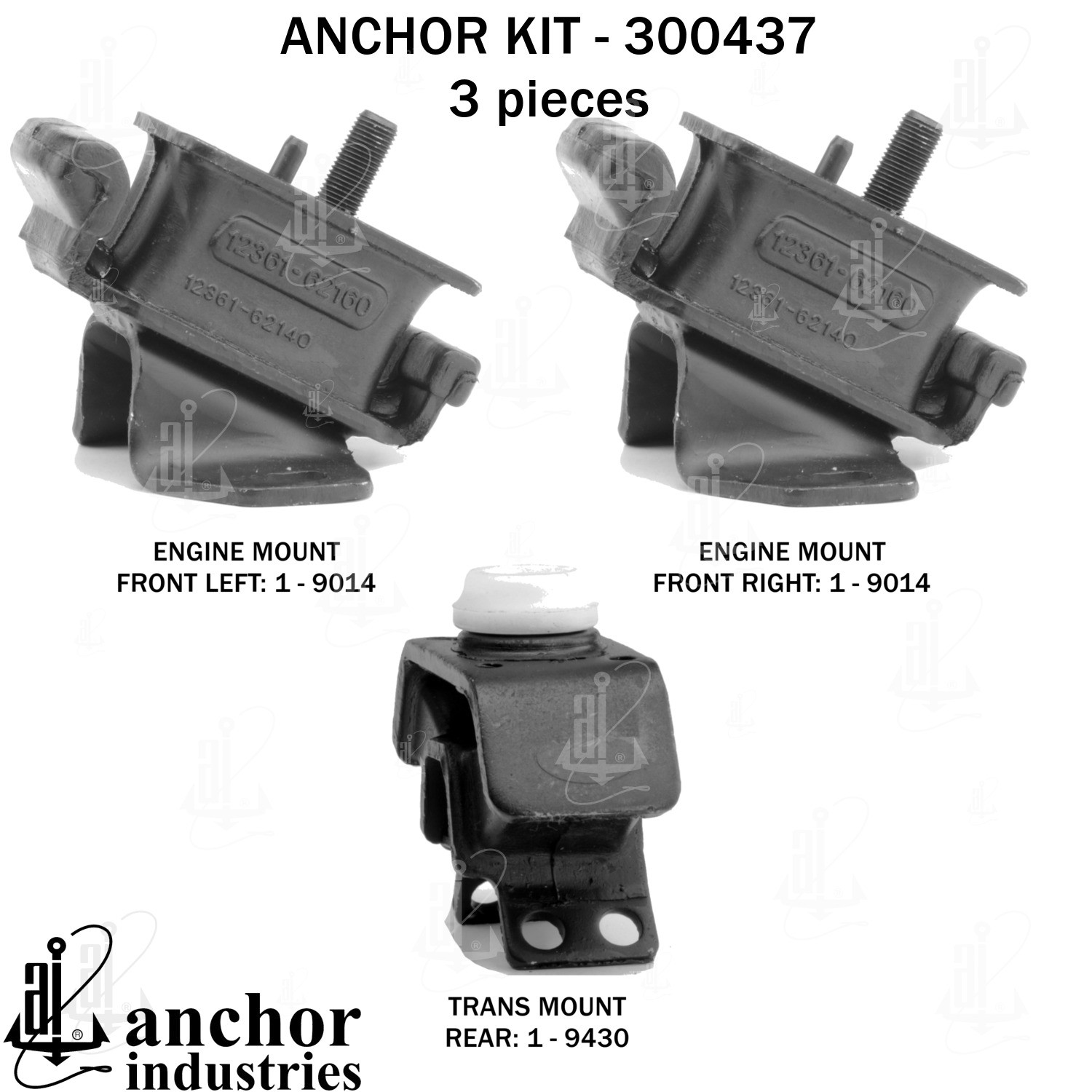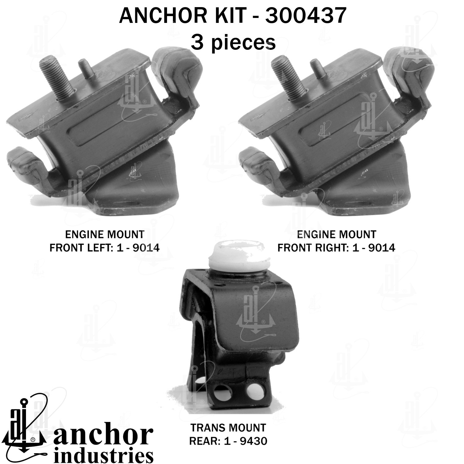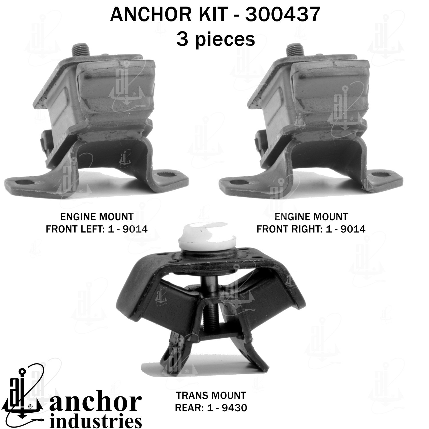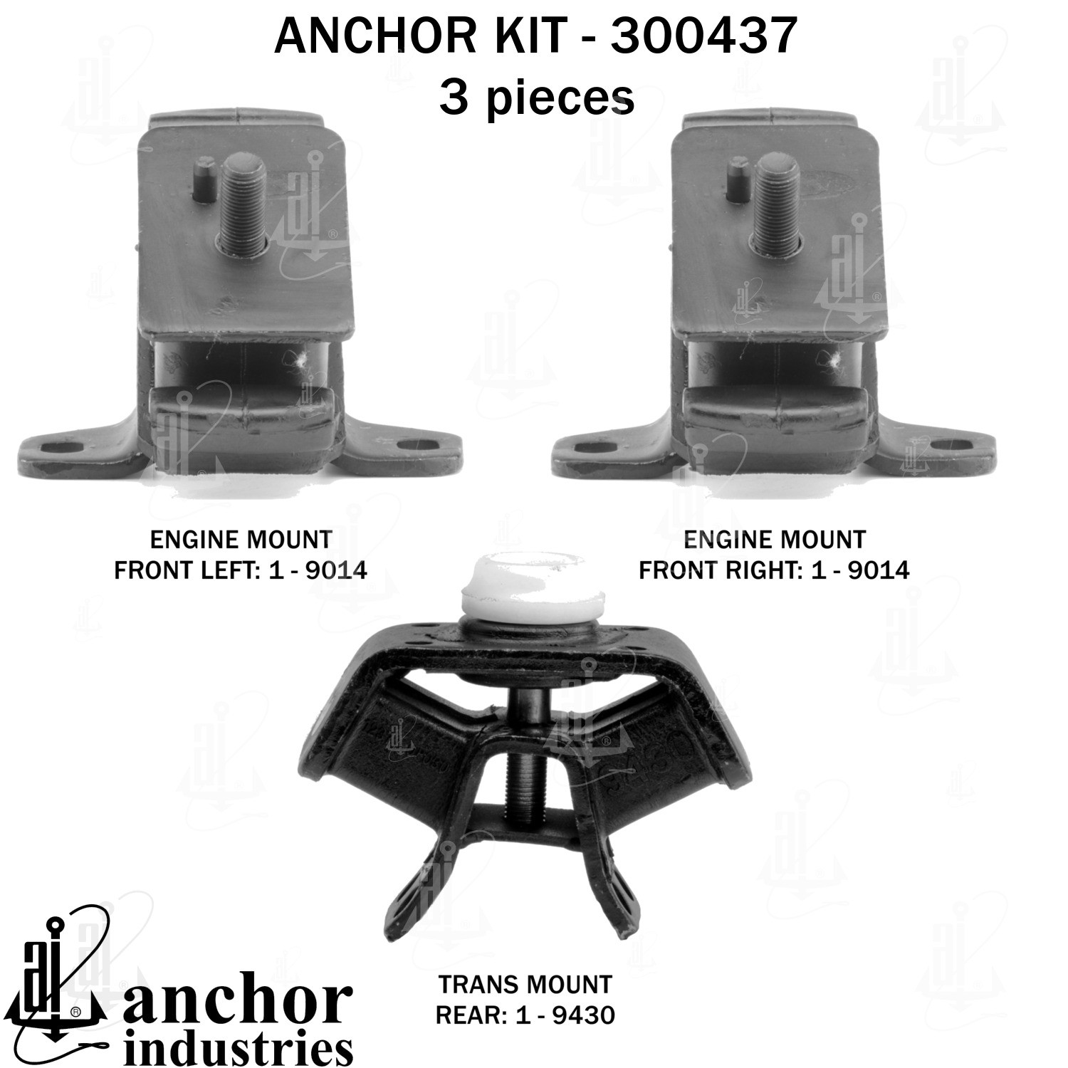 - Anchor 300437; ENGINE MNT KIT ; Each part of this kit is specifically engineered and manufactured to meet or exceed OE standards to ensure perfect fit and function. Natural and SBR rubber provide maximum life and performance. Steel fasteners are heat treated grade 5 bolts. A special bonding agent is used to ensure a rubber to metal bond. Rubber material is mixed to specific Durometer, hardness. 12 Month Warranty.