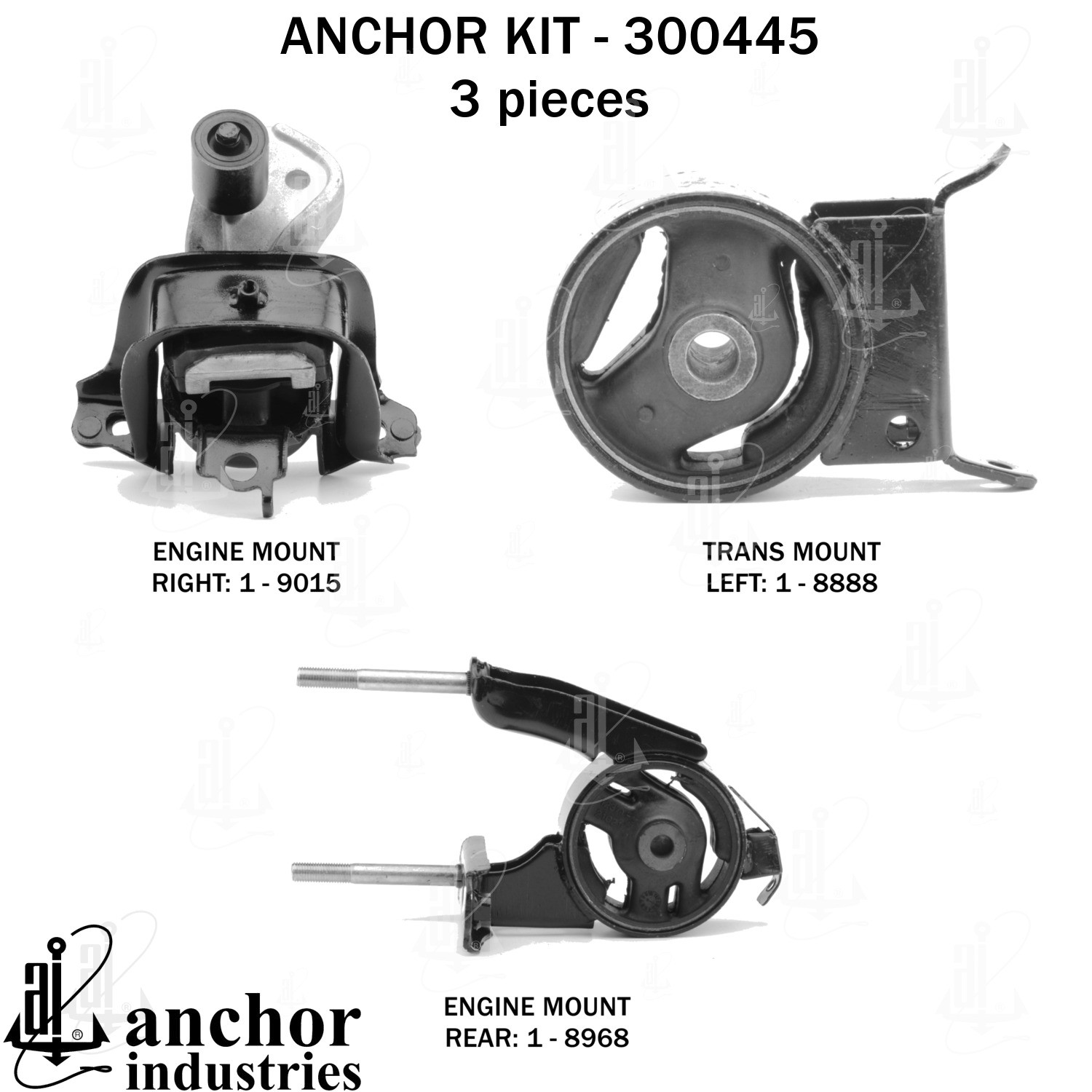 - Anchor 300445; ENGINE MNT KIT ; Each part of this kit is specifically engineered and manufactured to meet or exceed OE standards to ensure perfect fit and function. Natural and SBR rubber provide maximum life and performance. Steel fasteners are heat treated grade 5 bolts. A special bonding agent is used to ensure a rubber to metal bond. Rubber material is mixed to specific Durometer, hardness. 12 Month Warranty.