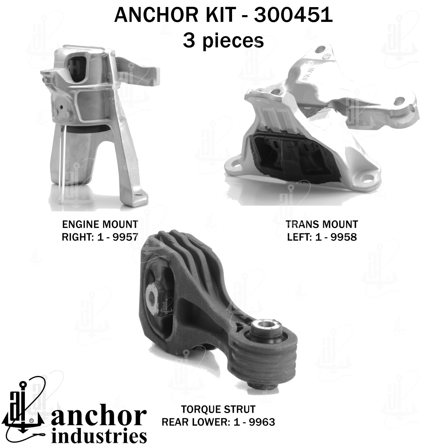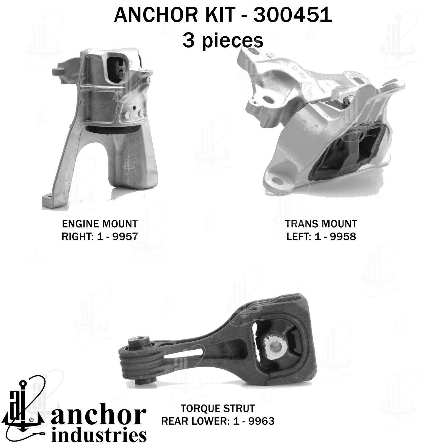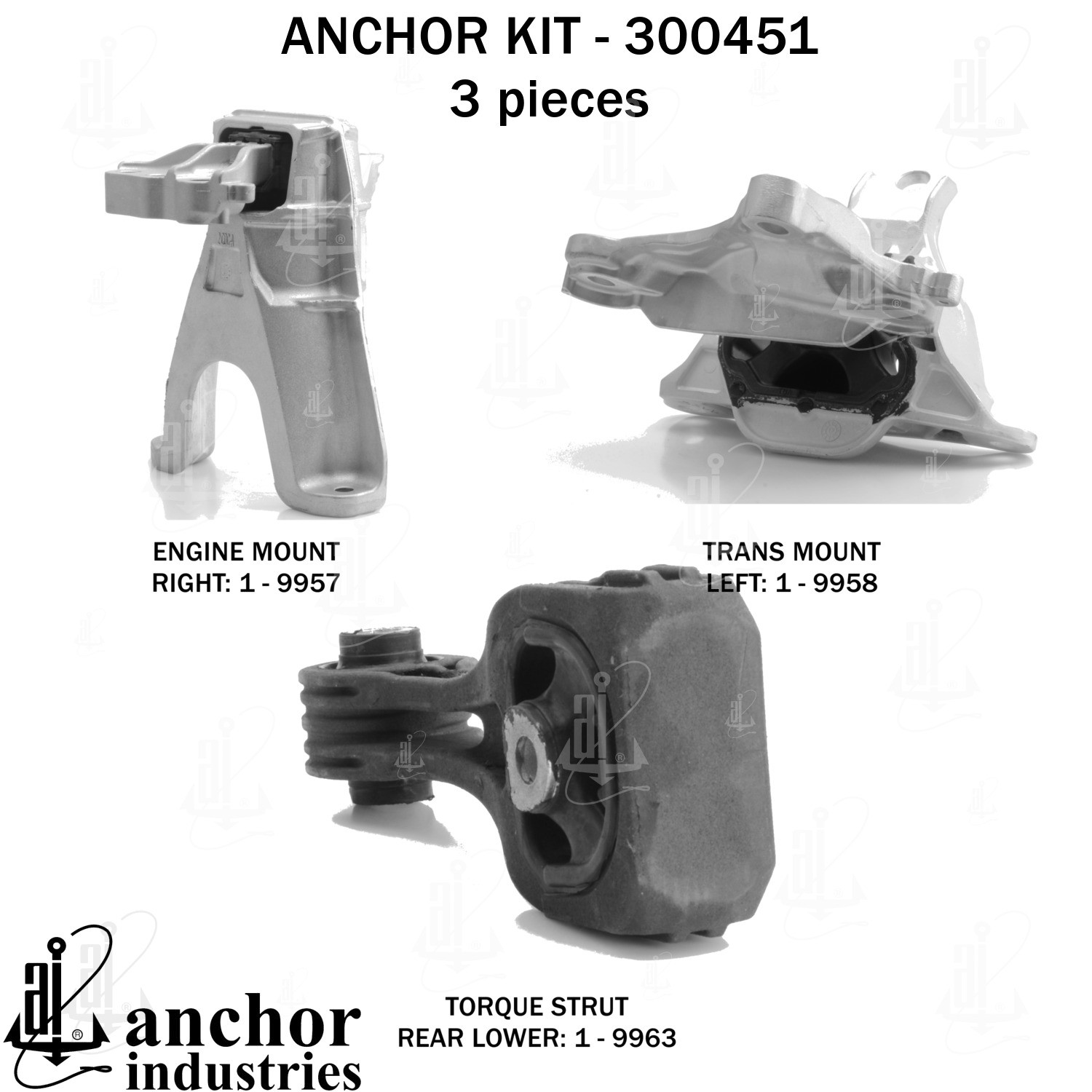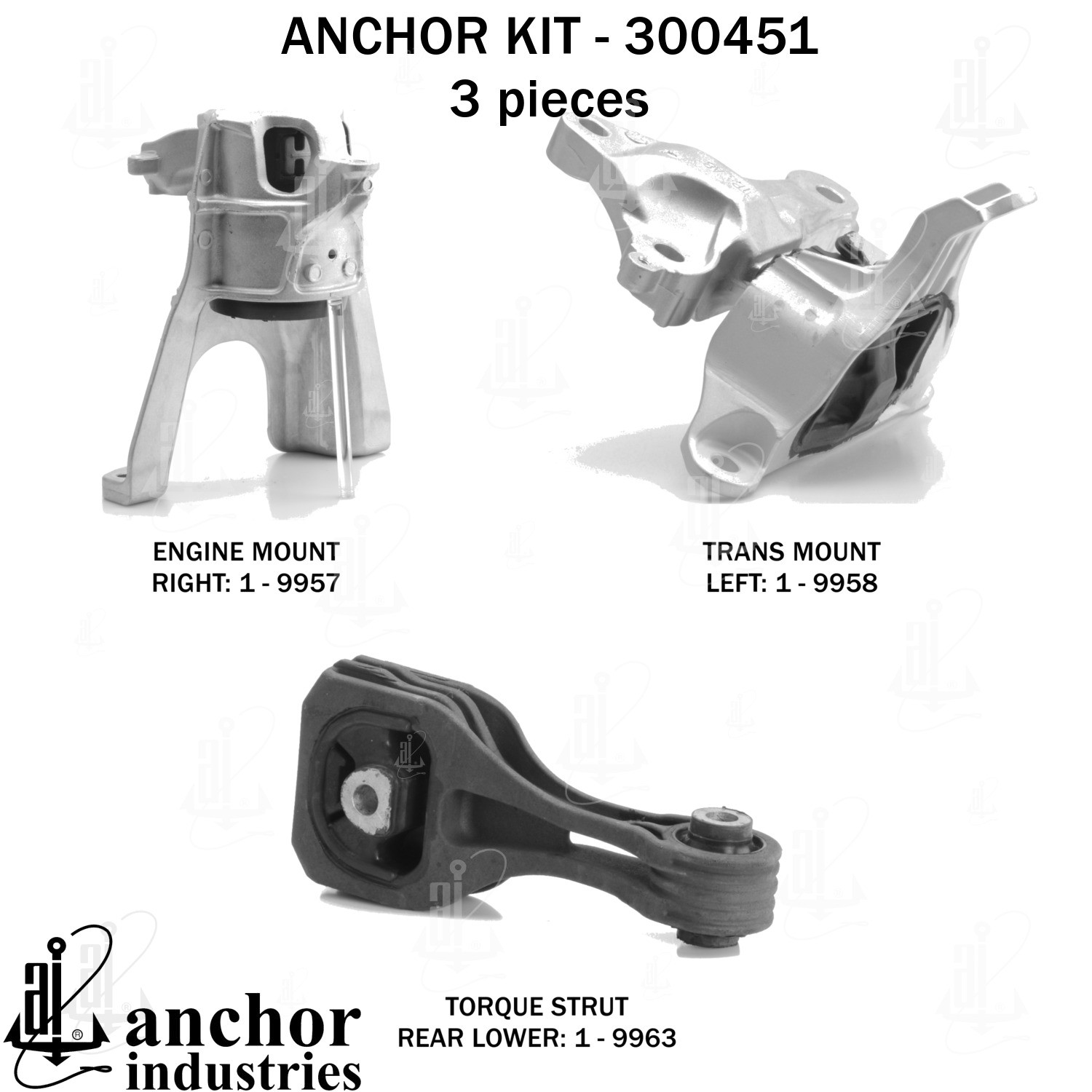 - Anchor 300451; ENGINE MNT KIT ; Each part of this kit is specifically engineered and manufactured to meet or exceed OE standards to ensure perfect fit and function. Natural and SBR rubber provide maximum life and performance. Steel fasteners are heat treated grade 5 bolts. A special bonding agent is used to ensure a rubber to metal bond. Rubber material is mixed to specific Durometer, hardness. 12 Month Warranty.